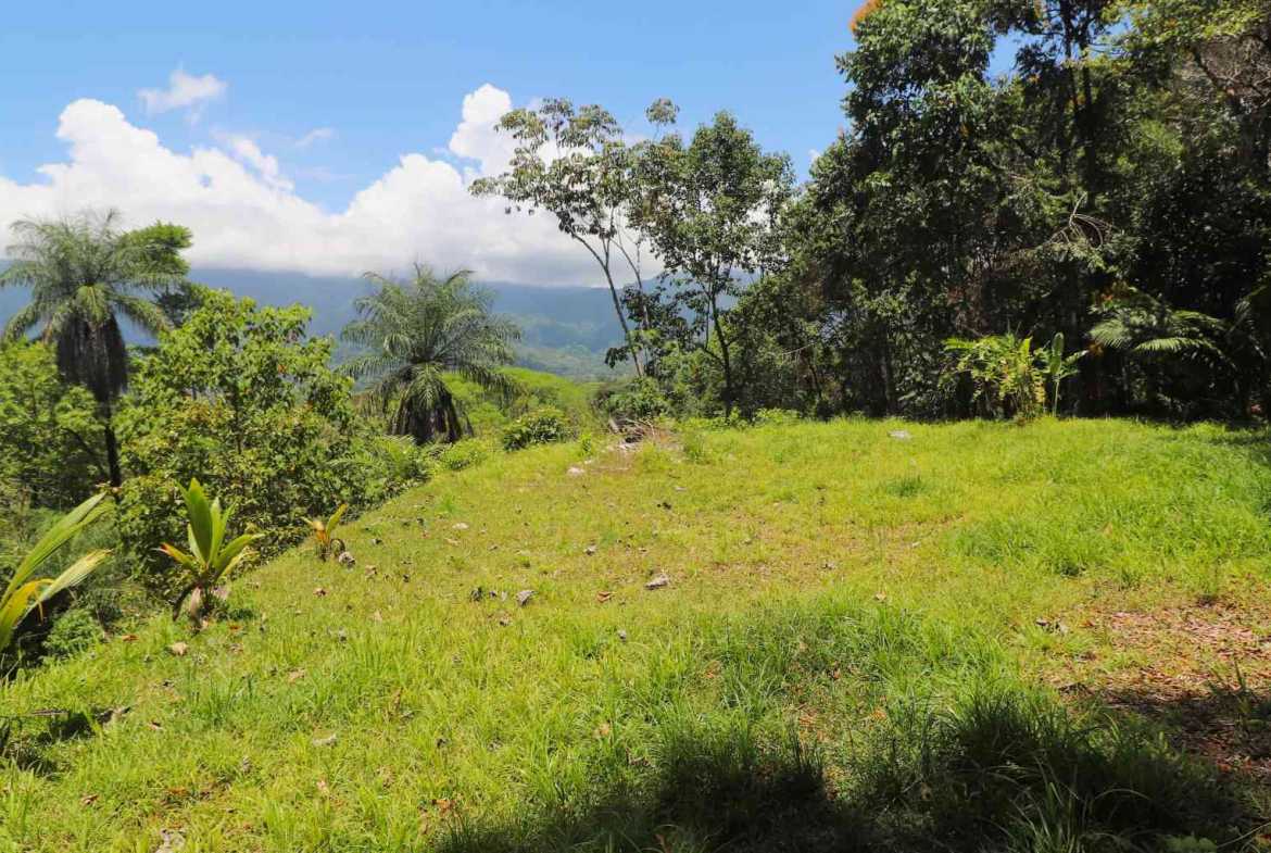 The lot holds several locations adapted to build a house and a number of cabins. Or maybe you want to build a house or family compound that is steps away from the action but hidden out-of-view in its natural surroundings? Large trees growing on the lot give shade to all potential structures and areas and provide shelter and natural habitat to numerous tropical birds and animals. Monkeys, macaws, toucans, brilliant butterflies and many other tropical animals are routinely seen in this area. The lot is on a slope which slowly steepens towards the top. The view of the jungles, farms and mountains from the top of the property is amazing – the ranges rise over 1,000m above the town and their peaks are often shrouded in dancing white clouds, the elevated location of the plot catching the refreshing mountain and sea breezes.