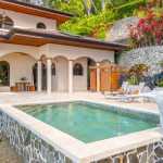 The living room opens to the covered patio that was added to the existing terrace. It not only overlooks the mountains and jungles, but also the mature landscaping which is very impressive, including many brilliantly colored tropical flowers, plants, and trees. Similar views can be enjoyed from the large, amazing pool below the patio. There is also an overhanging wooden patio with a Titanic-like ”I’m flying” balustrade – your guests will love re-creating the scene for their Instagram photos!