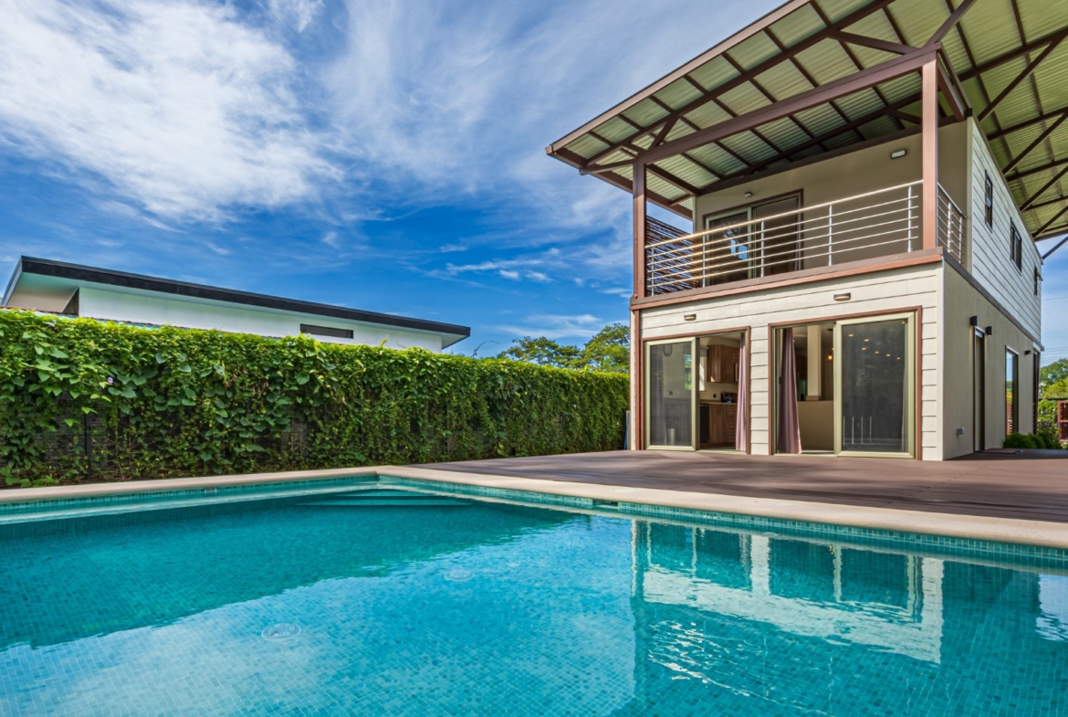 Nestled in the heart of vibrant Uvita, Casa Maritima is a masterpiece of modern engineering, designed and built by a well-known Construction Manager. The two-story layout includes a comfortable open living space with two air conditioner units, half bathroom, an expansive kitchen that is outfitted with custom cabinetry, large island, stainless steel appliances and a thick quartz countertop, perfect to delight those who love cooking and entertaining. The open concept living, dining and kitchen lead out to the terrace and pool.