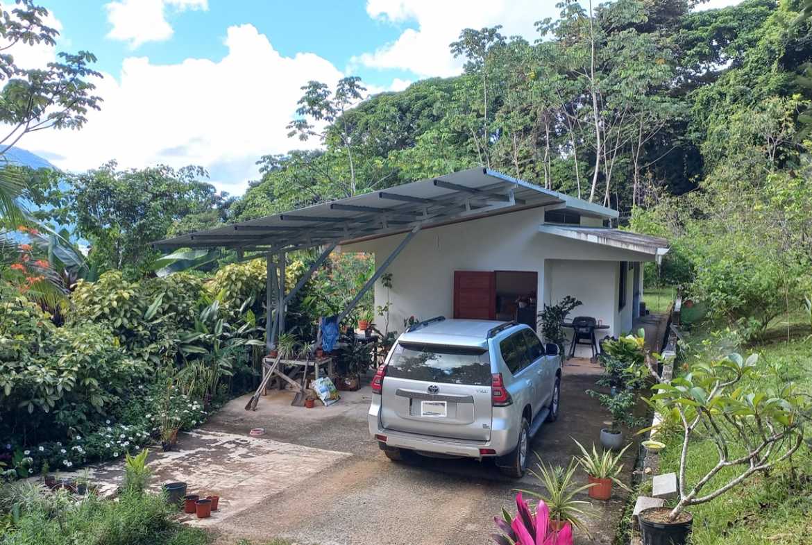 Perched above the village of Tres Rios, this sweet 2 bedroom, 2 bath home has lovely mountain views and fresh breezes 24/7. This 1.5 acre property is a gardeners’ delight, lushly landscaped with a wide variety of flowering bushes and mature fruit trees. The modest home is nicely furnished with fantastic views from the large mountain-facing terrace and master bedroom. A large, attached carport can accommodate a couple of vehicles, while a laundry station on the backside of the home. Plenty of space to string up your hammock or build a yoga deck