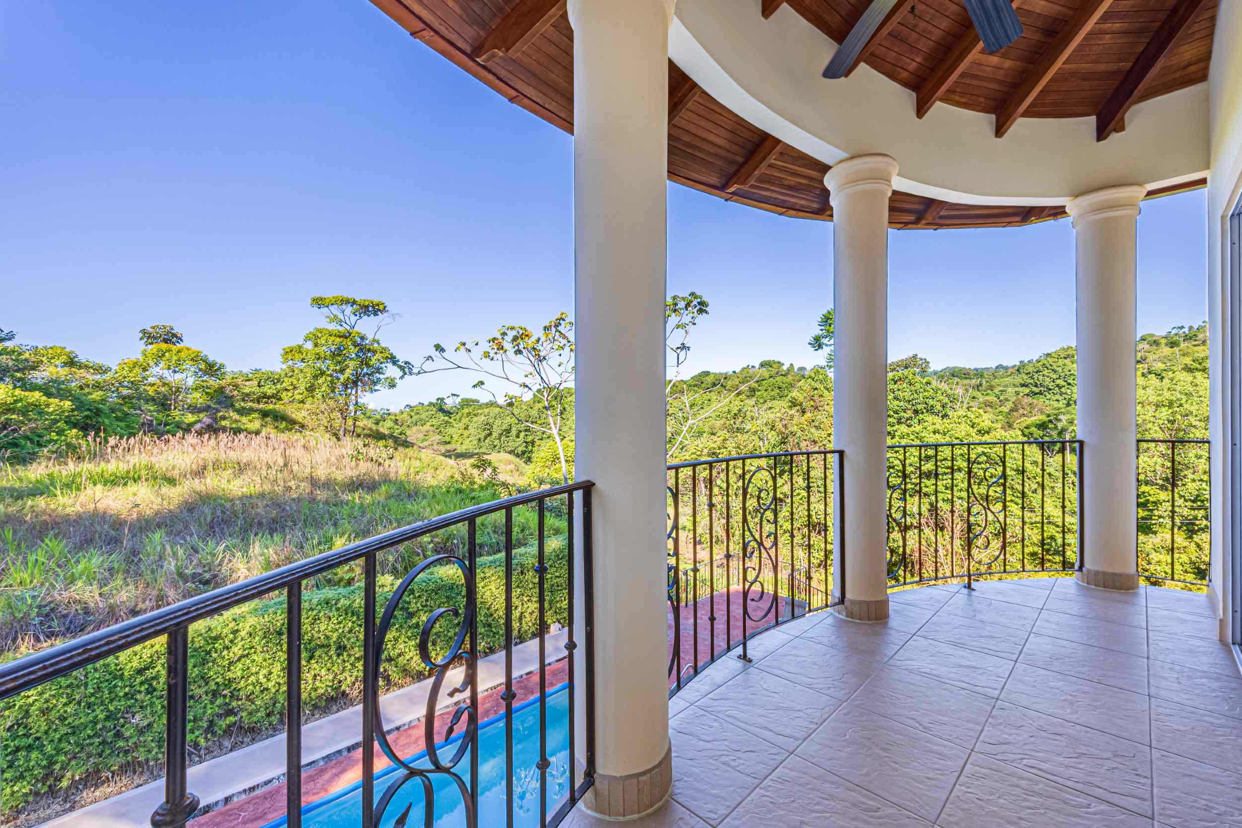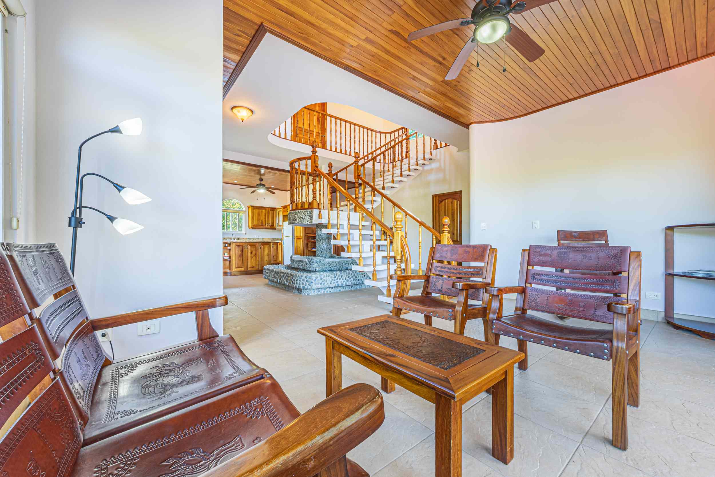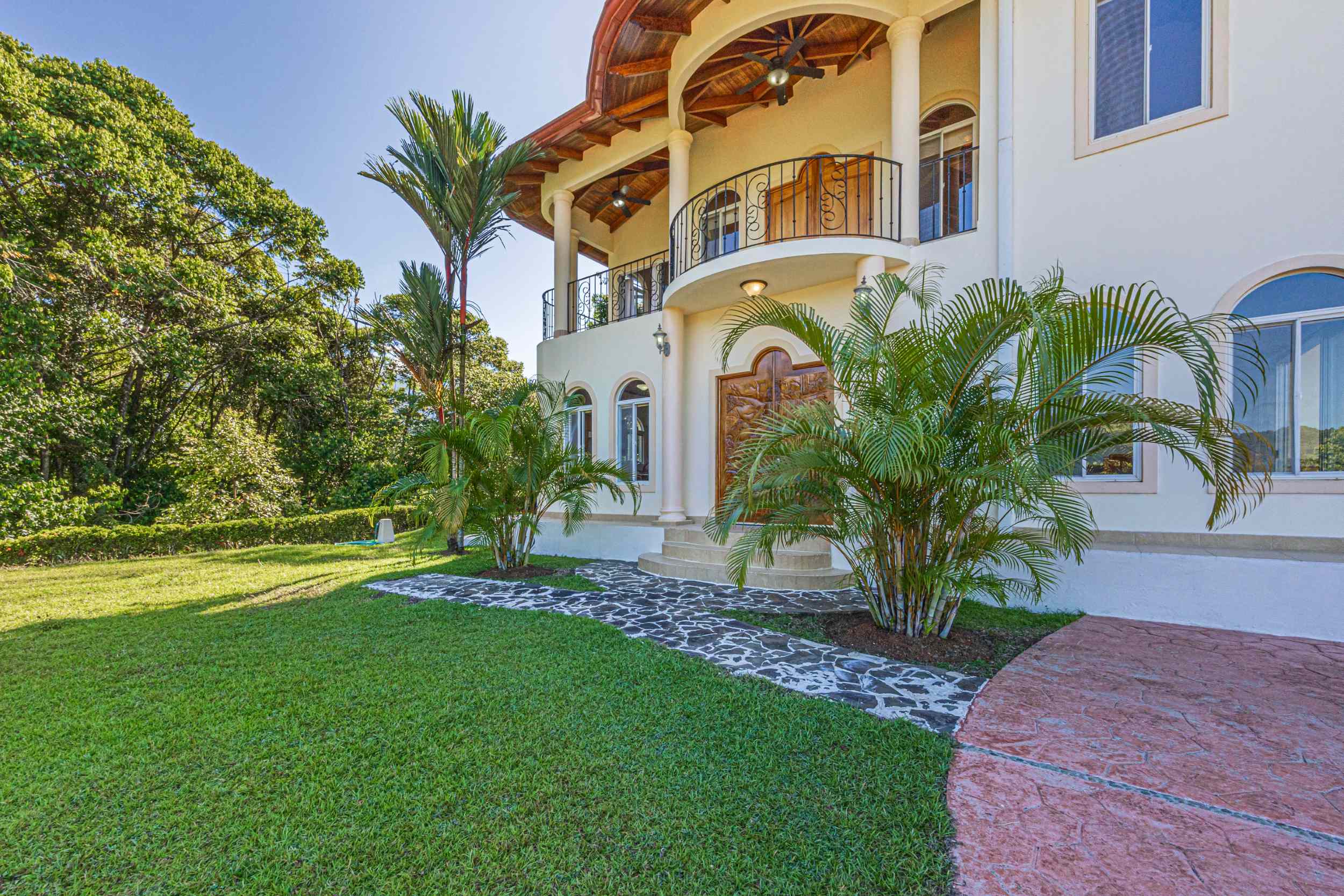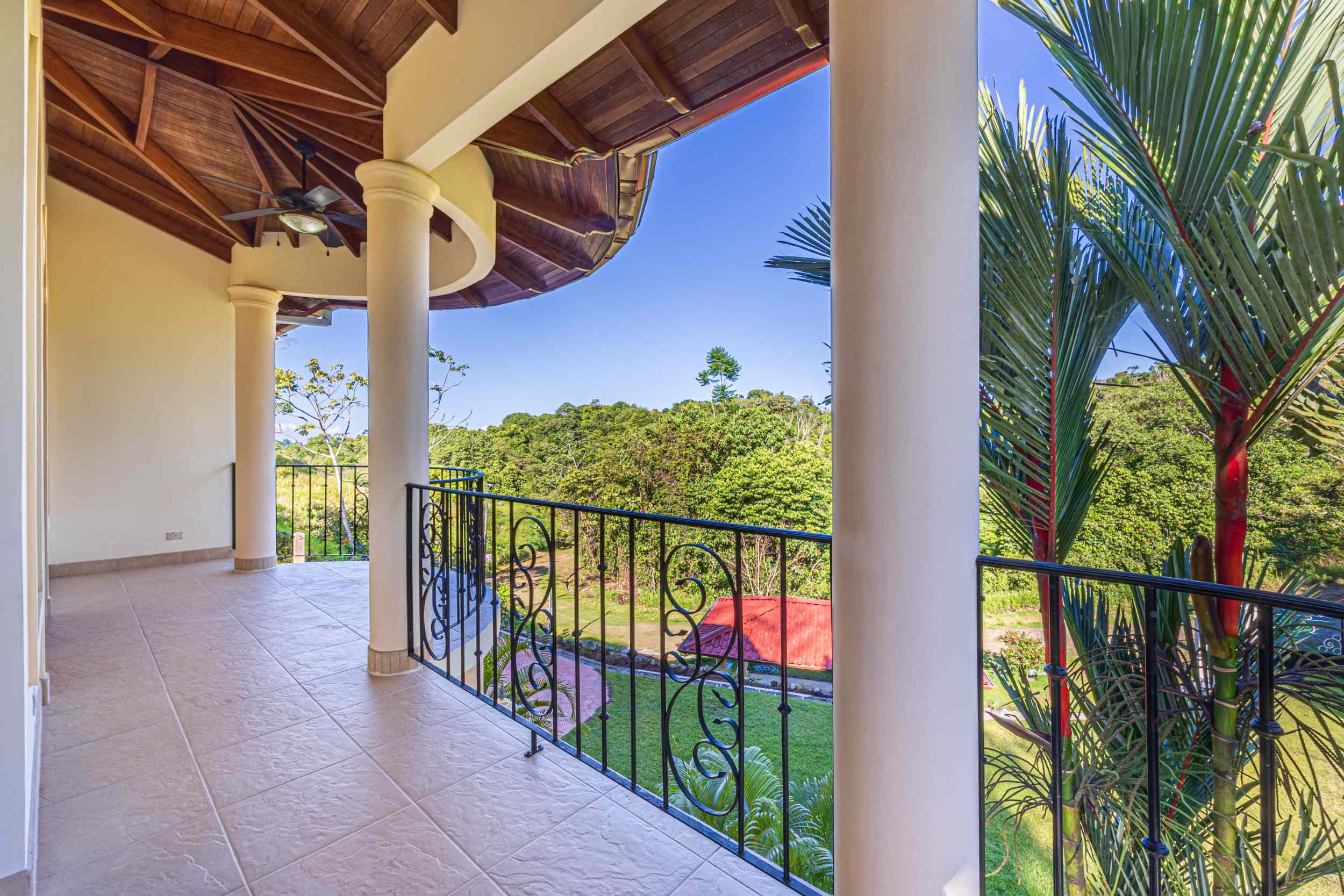 From the moment you arrive, you appreciate the immaculate landscaping, tropical plants and fruit trees around the residence. The home was completed in 2013, built with quality and longevity in mind. With a total of 2,652 sq.ft. solid concrete construction, intricate details, abundant windows and soaring ceilings create a feeling of grandeur within the home. The classic architecture is complemented by warm natural hardwood accents and custom wood ceilings. The main floor is a functional open space, with indoor dining, living space and the kitchen, which features granite countertops and locally made cabinetry. The main floor also hosts two guest bedrooms and one spacious full bathroom, as well as the laundry room with storage. The elegant staircase leads upstairs to a flexible bonus room with private balcony access, perfect as an art studio, office, or additional bedroom. The private primary bedroom is bright and spacious, with high ceilings, private balcony and large ensuite bathroom with double vanities.