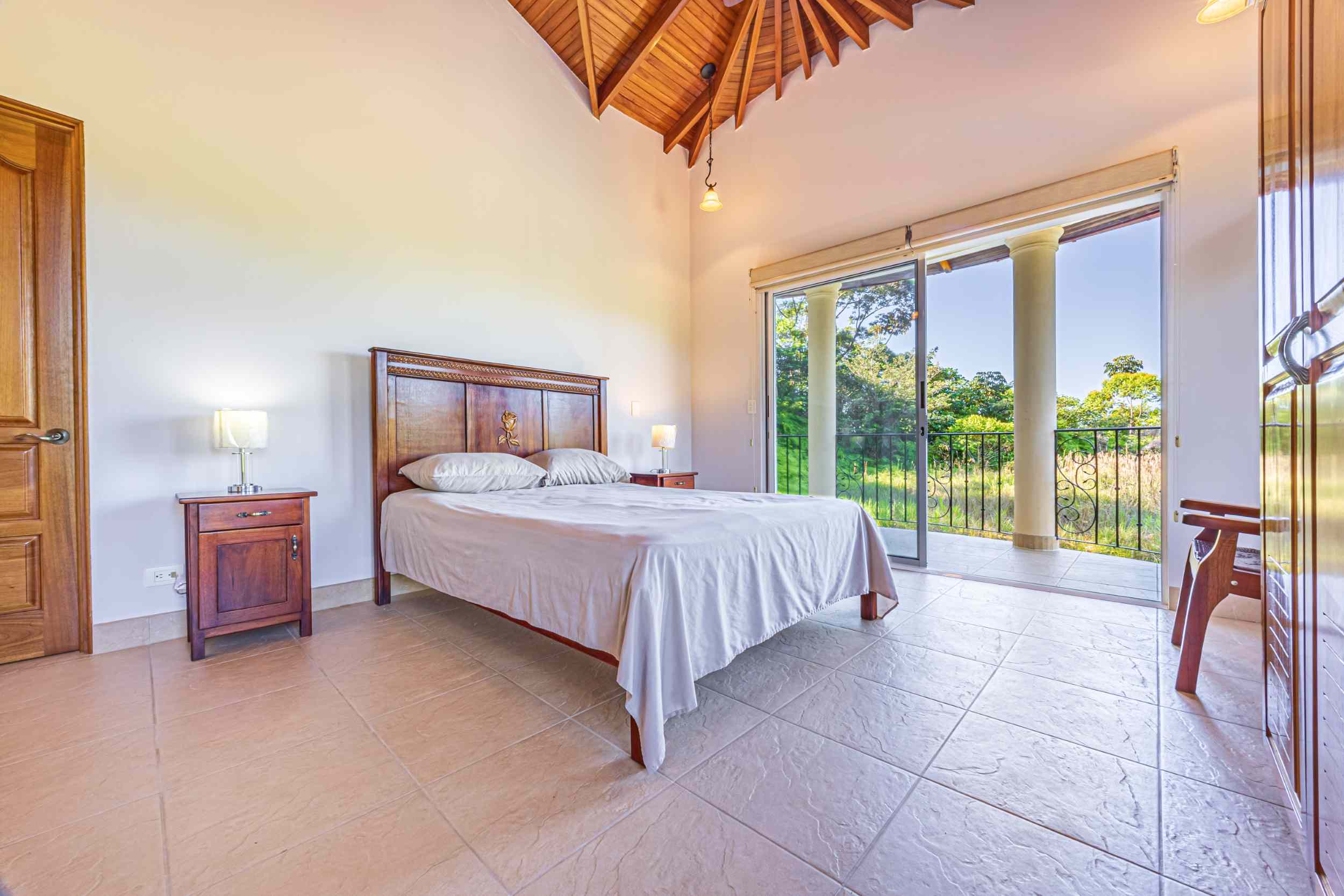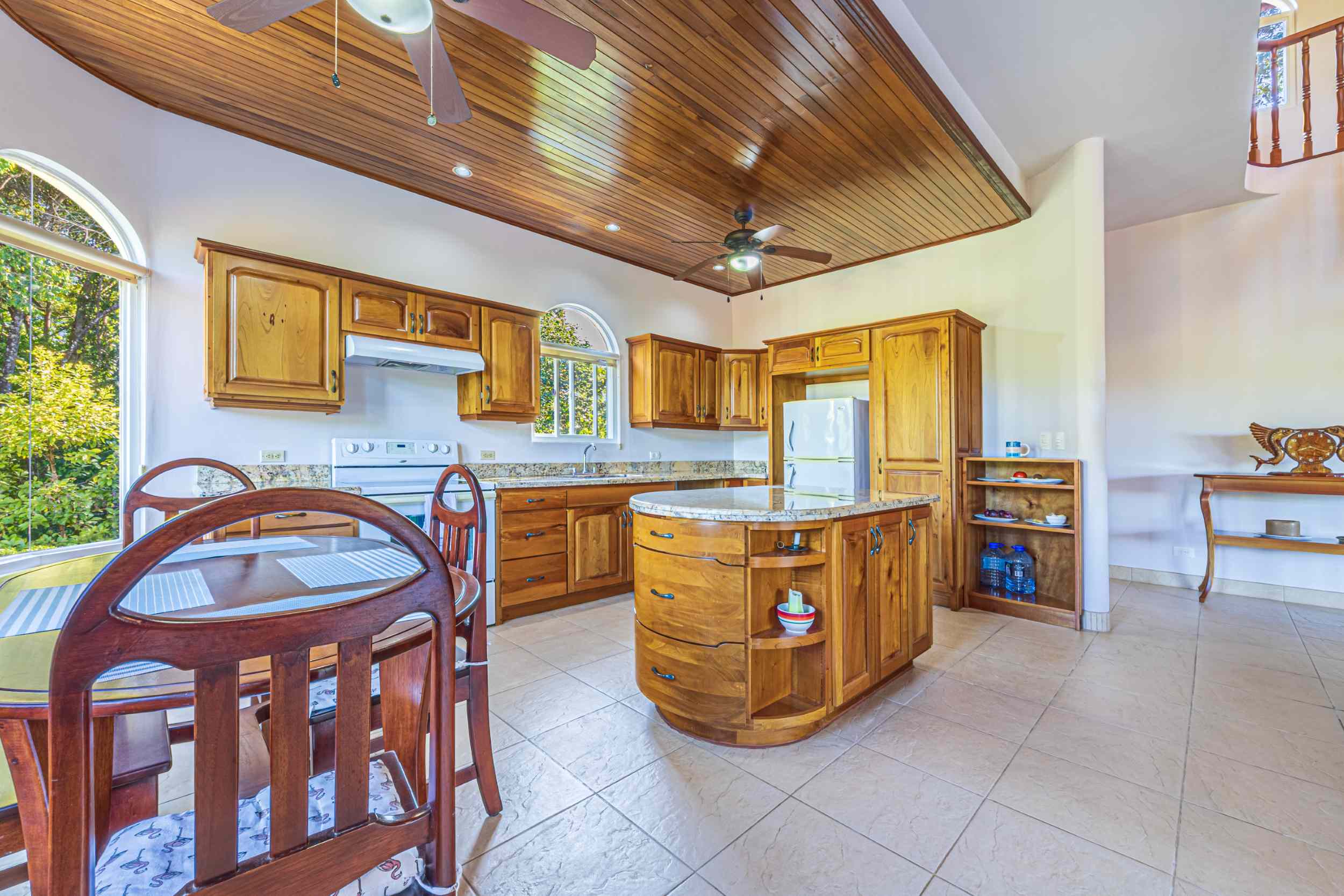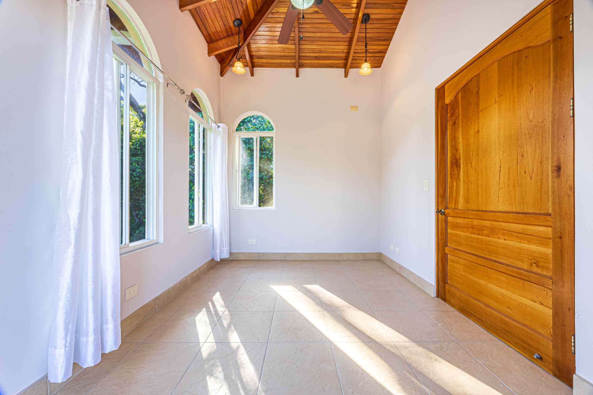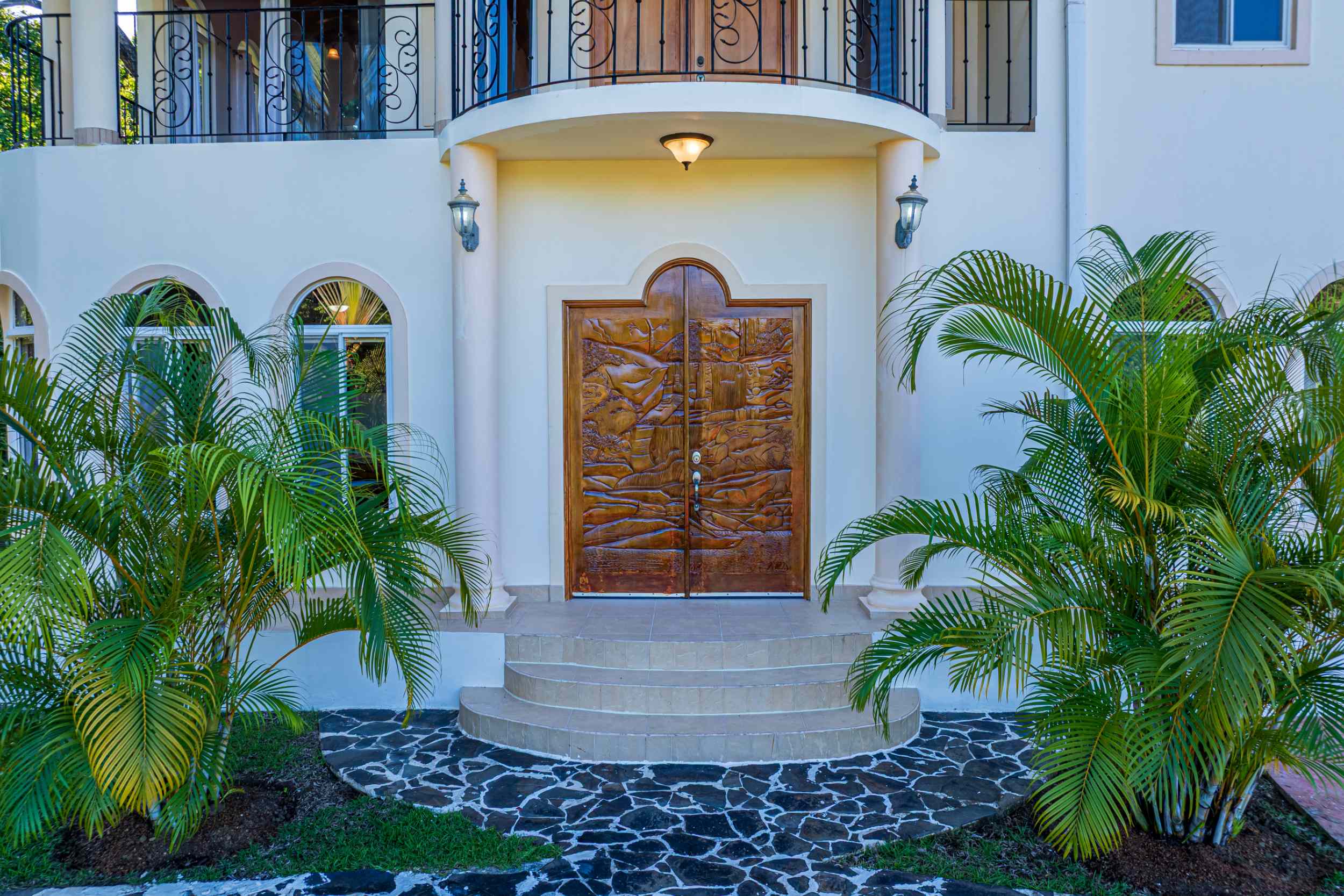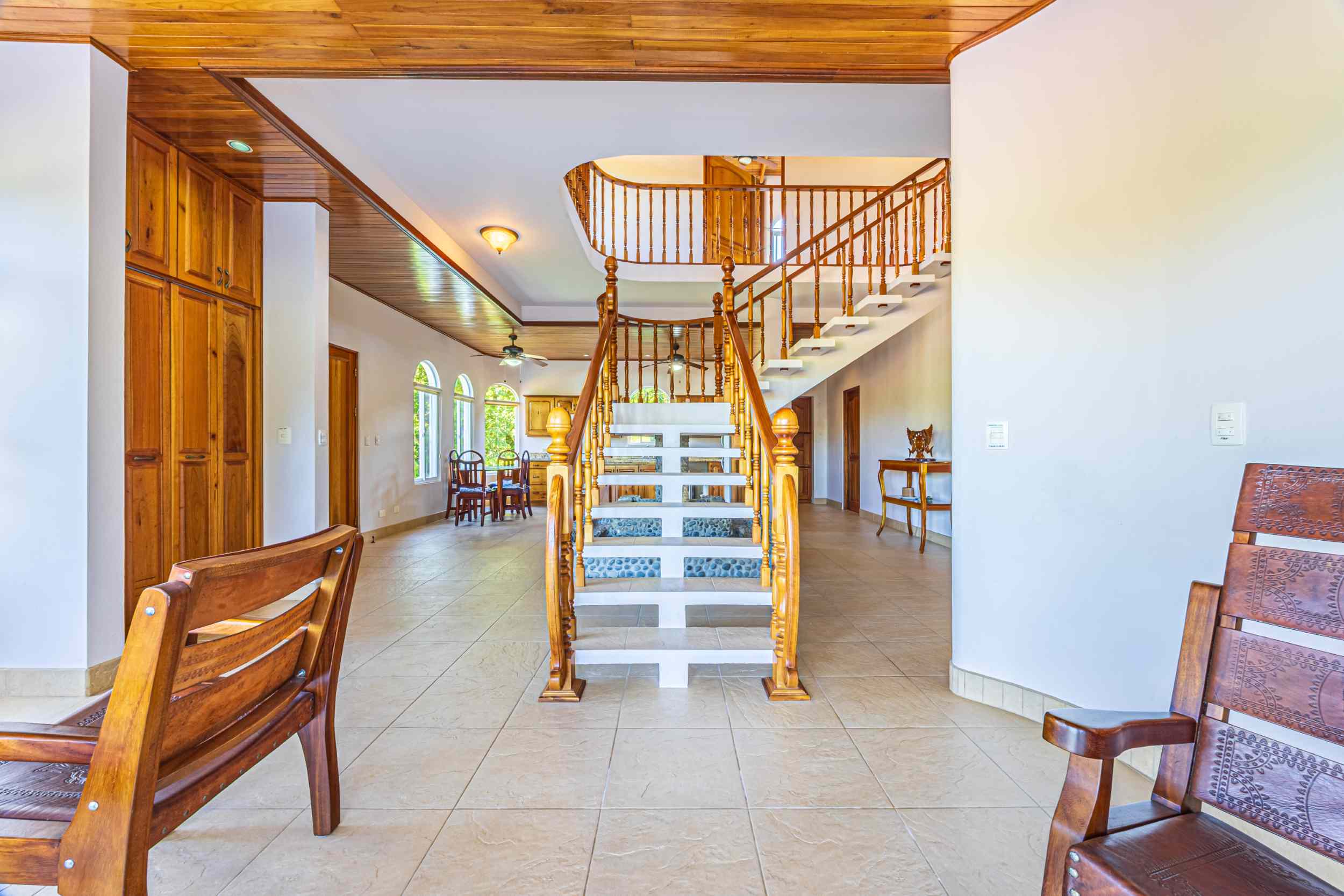 From the moment you arrive, you appreciate the immaculate landscaping, tropical plants and fruit trees around the residence. The home was completed in 2013, built with quality and longevity in mind. With a total of 2,652 sq.ft. solid concrete construction, intricate details, abundant windows and soaring ceilings create a feeling of grandeur within the home. The classic architecture is complemented by warm natural hardwood accents and custom wood ceilings. The main floor is a functional open space, with indoor dining, living space and the kitchen, which features granite countertops and locally made cabinetry. The main floor also hosts two guest bedrooms and one spacious full bathroom, as well as the laundry room with storage. The elegant staircase leads upstairs to a flexible bonus room with private balcony access, perfect as an art studio, office, or additional bedroom. The private primary bedroom is bright and spacious, with high ceilings, private balcony and large ensuite bathroom with double vanities.