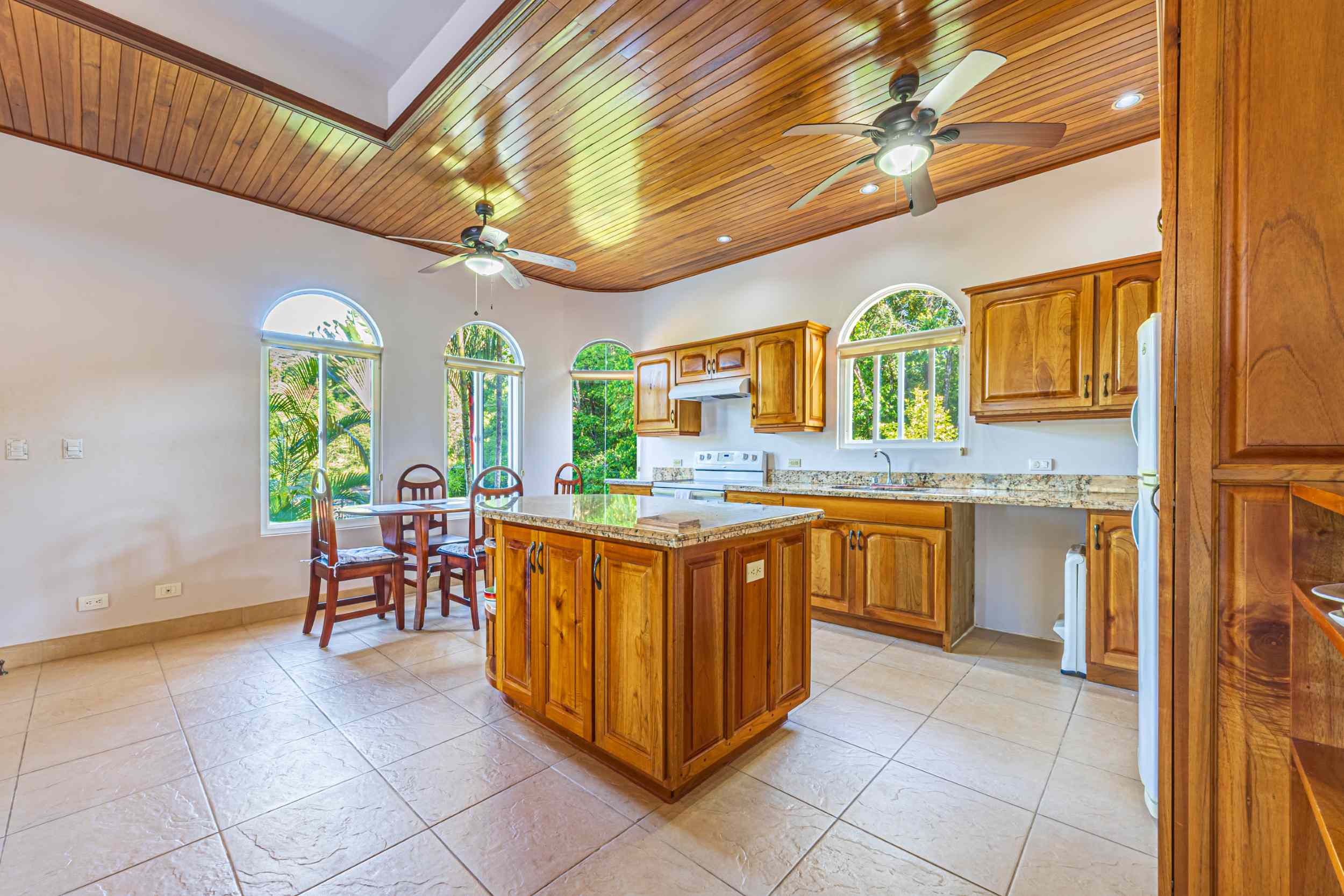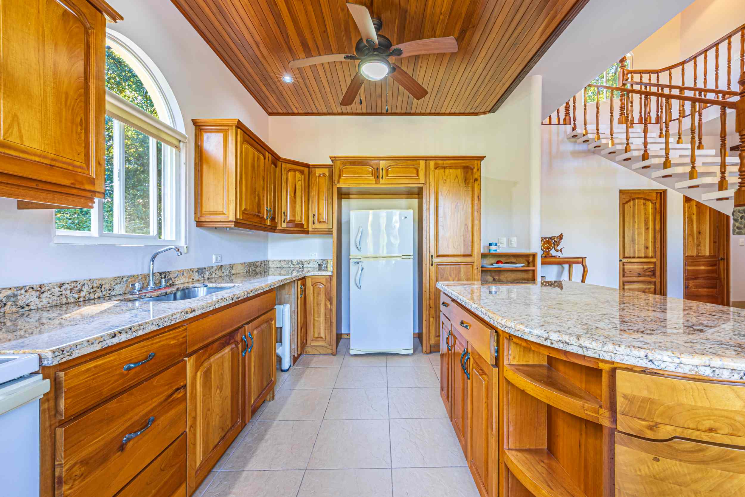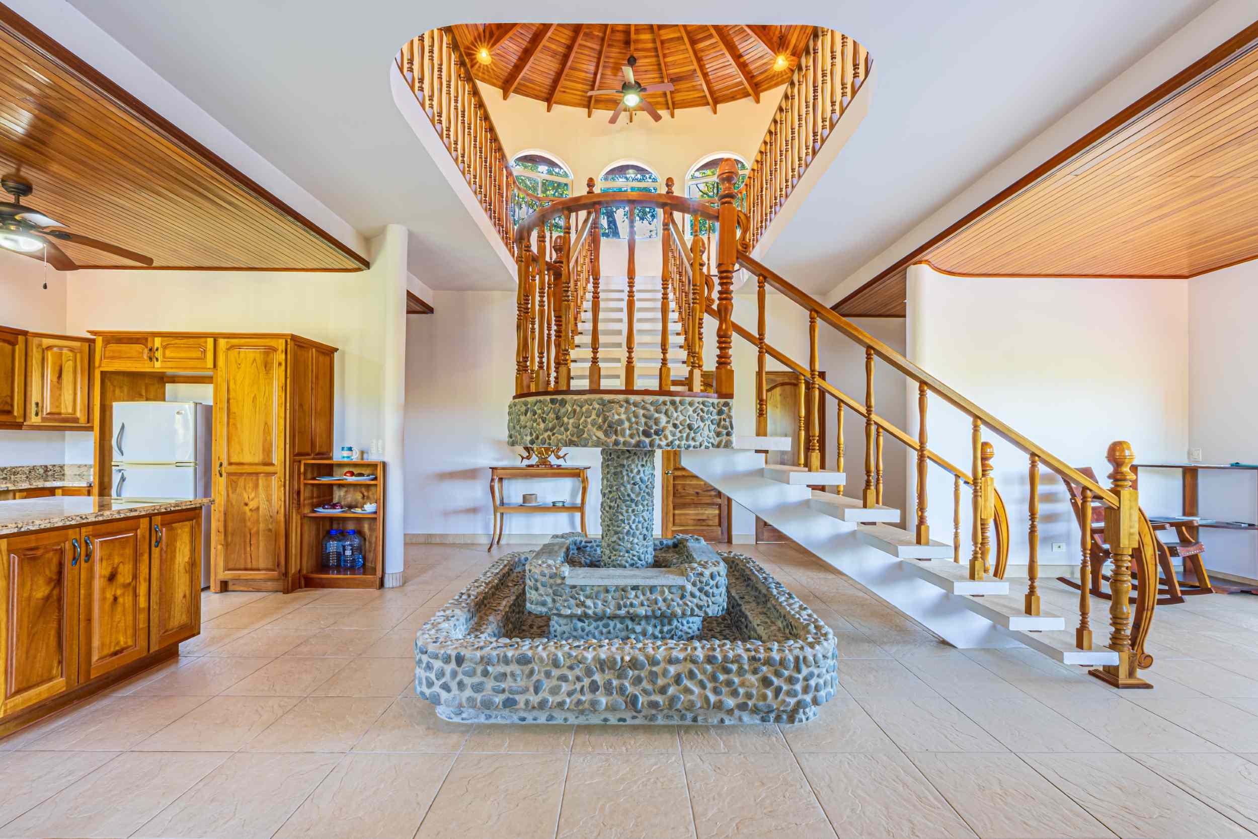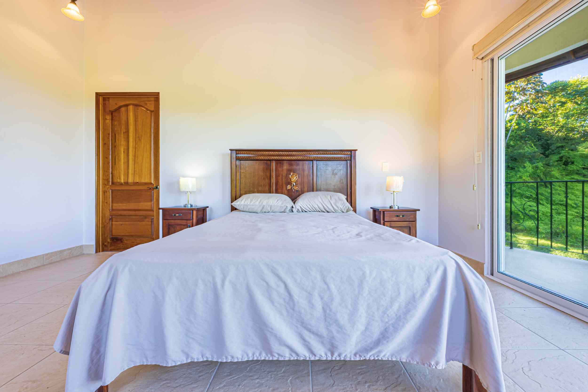 From the moment you arrive, you appreciate the immaculate landscaping, tropical plants and fruit trees around the residence. The home was completed in 2013, built with quality and longevity in mind. With a total of 2,652 sq.ft. solid concrete construction, intricate details, abundant windows and soaring ceilings create a feeling of grandeur within the home. The classic architecture is complemented by warm natural hardwood accents and custom wood ceilings. The main floor is a functional open space, with indoor dining, living space and the kitchen, which features granite countertops and locally made cabinetry. The main floor also hosts two guest bedrooms and one spacious full bathroom, as well as the laundry room with storage. The elegant staircase leads upstairs to a flexible bonus room with private balcony access, perfect as an art studio, office, or additional bedroom. The private primary bedroom is bright and spacious, with high ceilings, private balcony and large ensuite bathroom with double vanities.