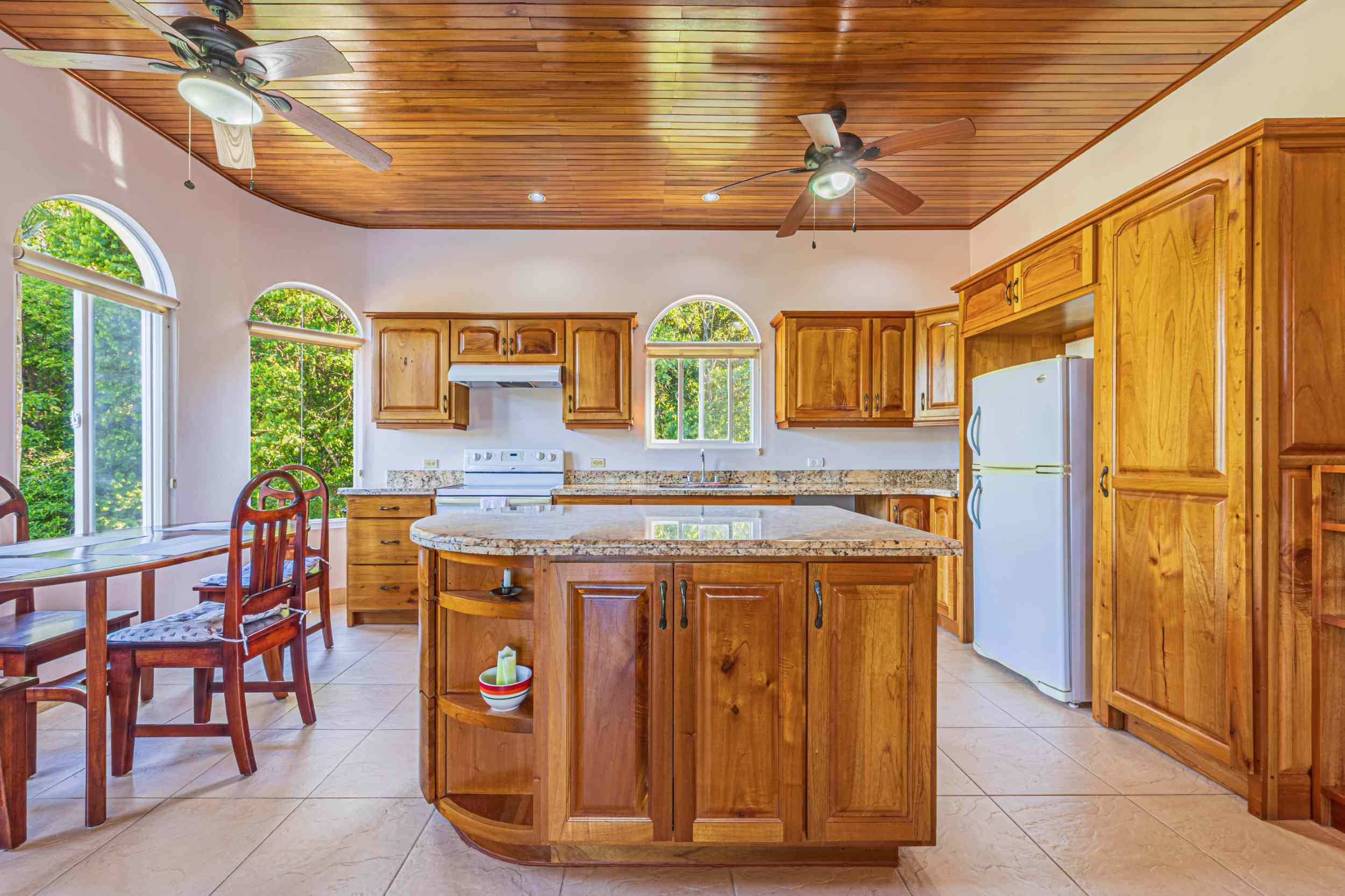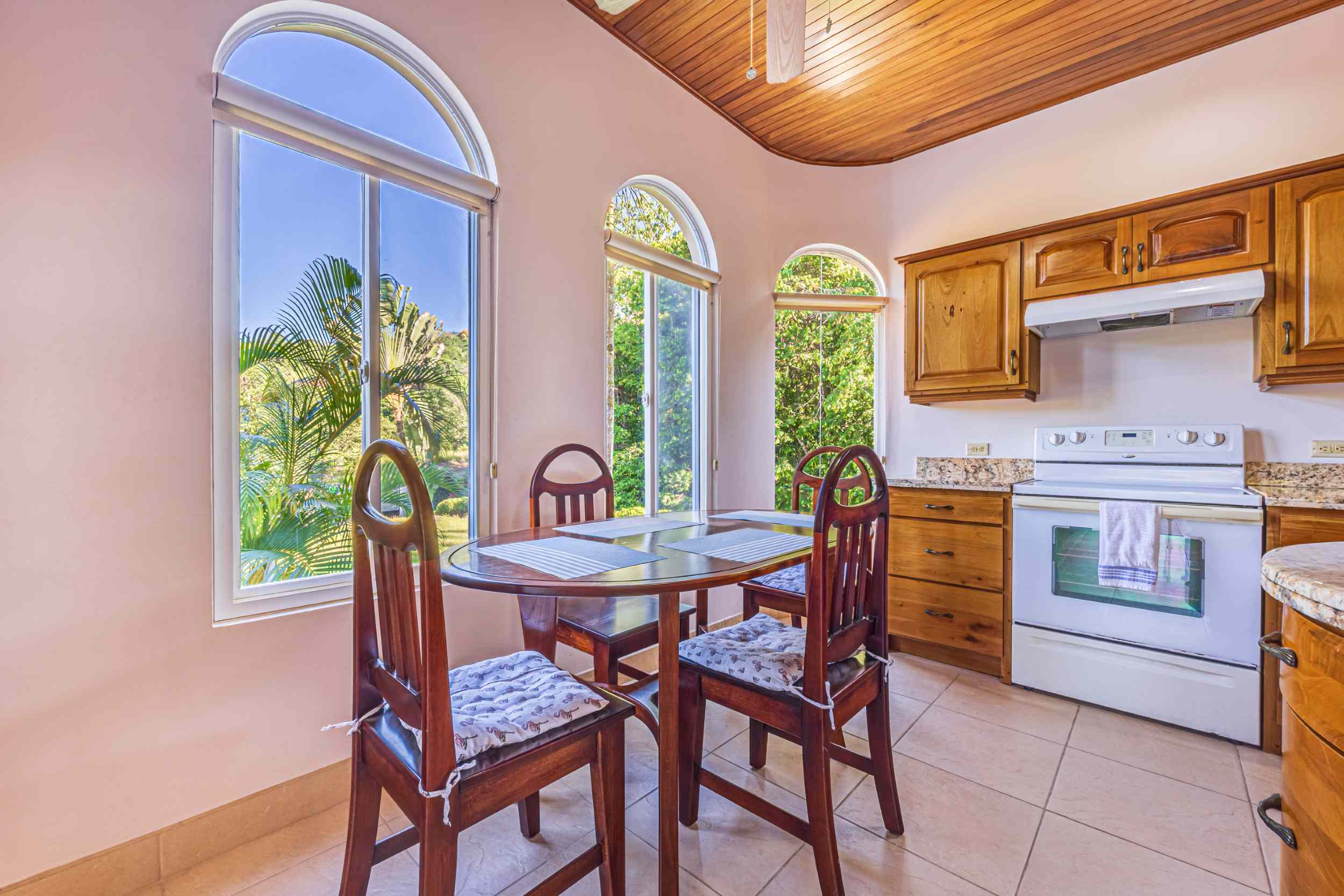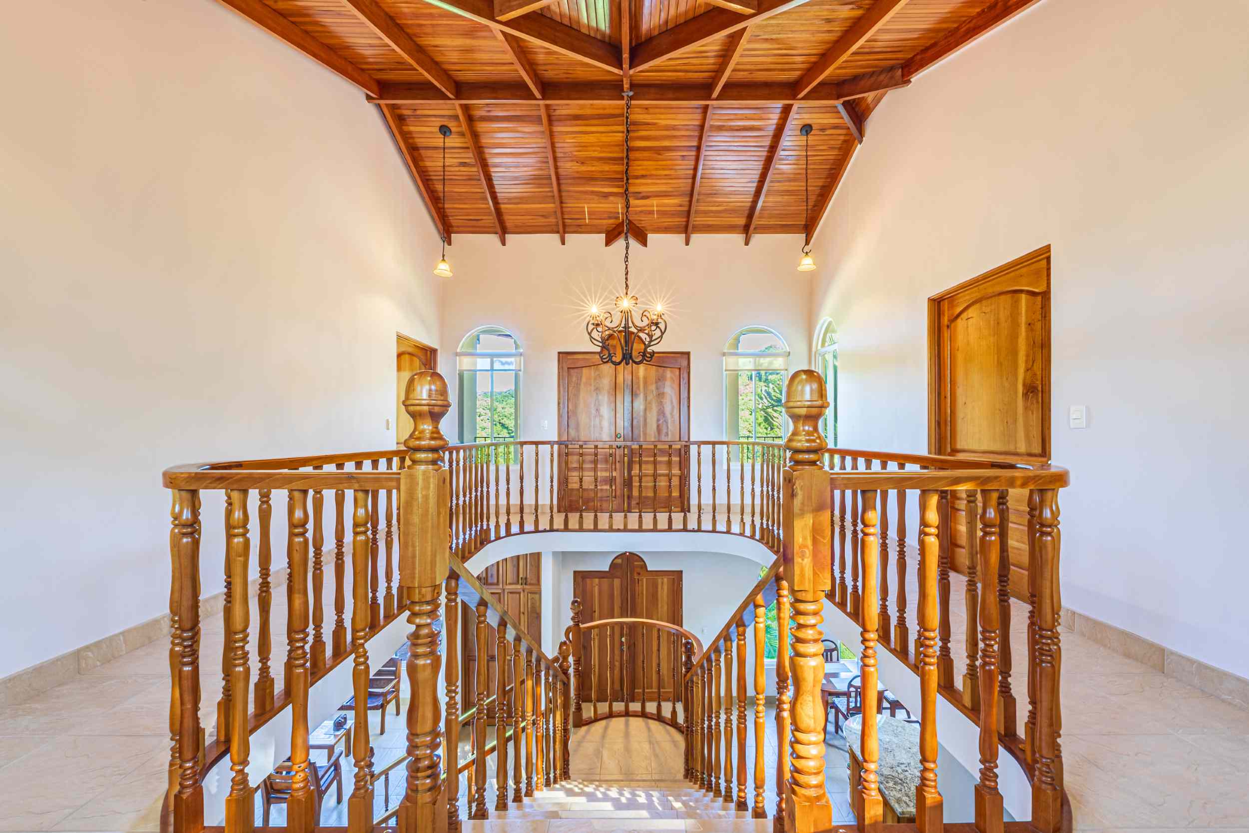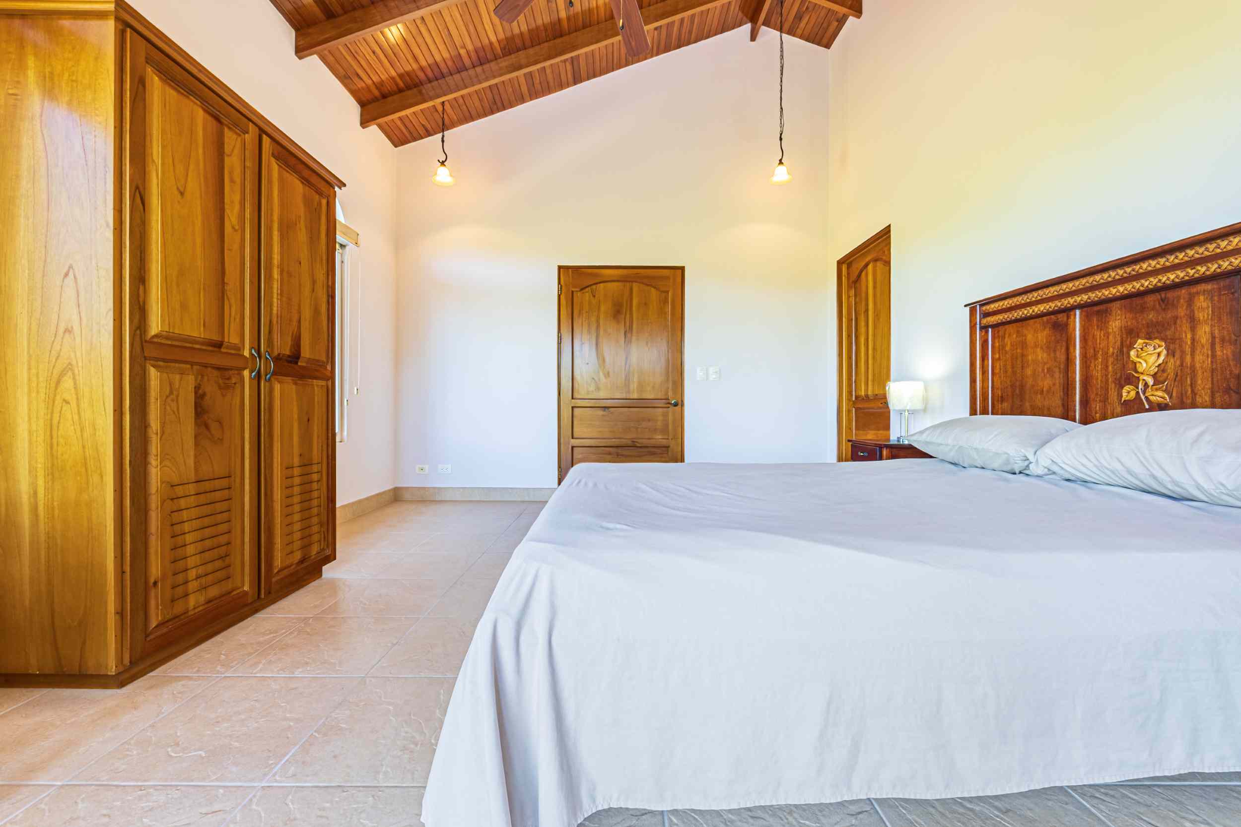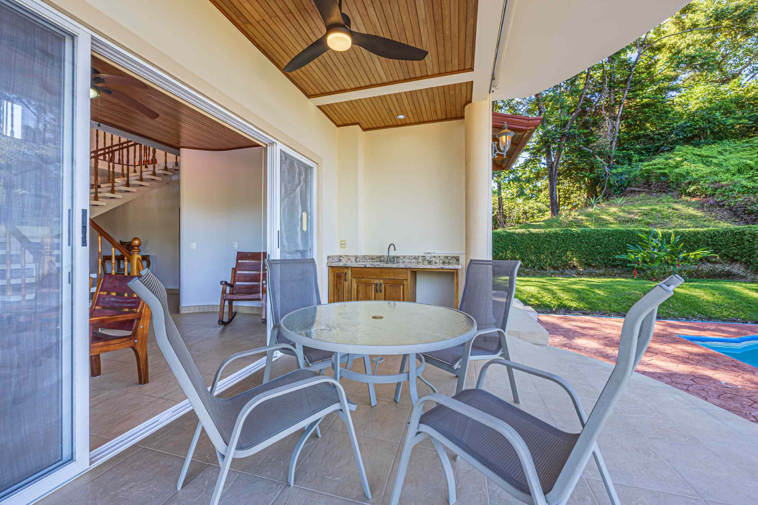 From the moment you arrive, you appreciate the immaculate landscaping, tropical plants and fruit trees around the residence. The home was completed in 2013, built with quality and longevity in mind. With a total of 2,652 sq.ft. solid concrete construction, intricate details, abundant windows and soaring ceilings create a feeling of grandeur within the home. The classic architecture is complemented by warm natural hardwood accents and custom wood ceilings. The main floor is a functional open space, with indoor dining, living space and the kitchen, which features granite countertops and locally made cabinetry. The main floor also hosts two guest bedrooms and one spacious full bathroom, as well as the laundry room with storage. The elegant staircase leads upstairs to a flexible bonus room with private balcony access, perfect as an art studio, office, or additional bedroom. The private primary bedroom is bright and spacious, with high ceilings, private balcony and large ensuite bathroom with double vanities.