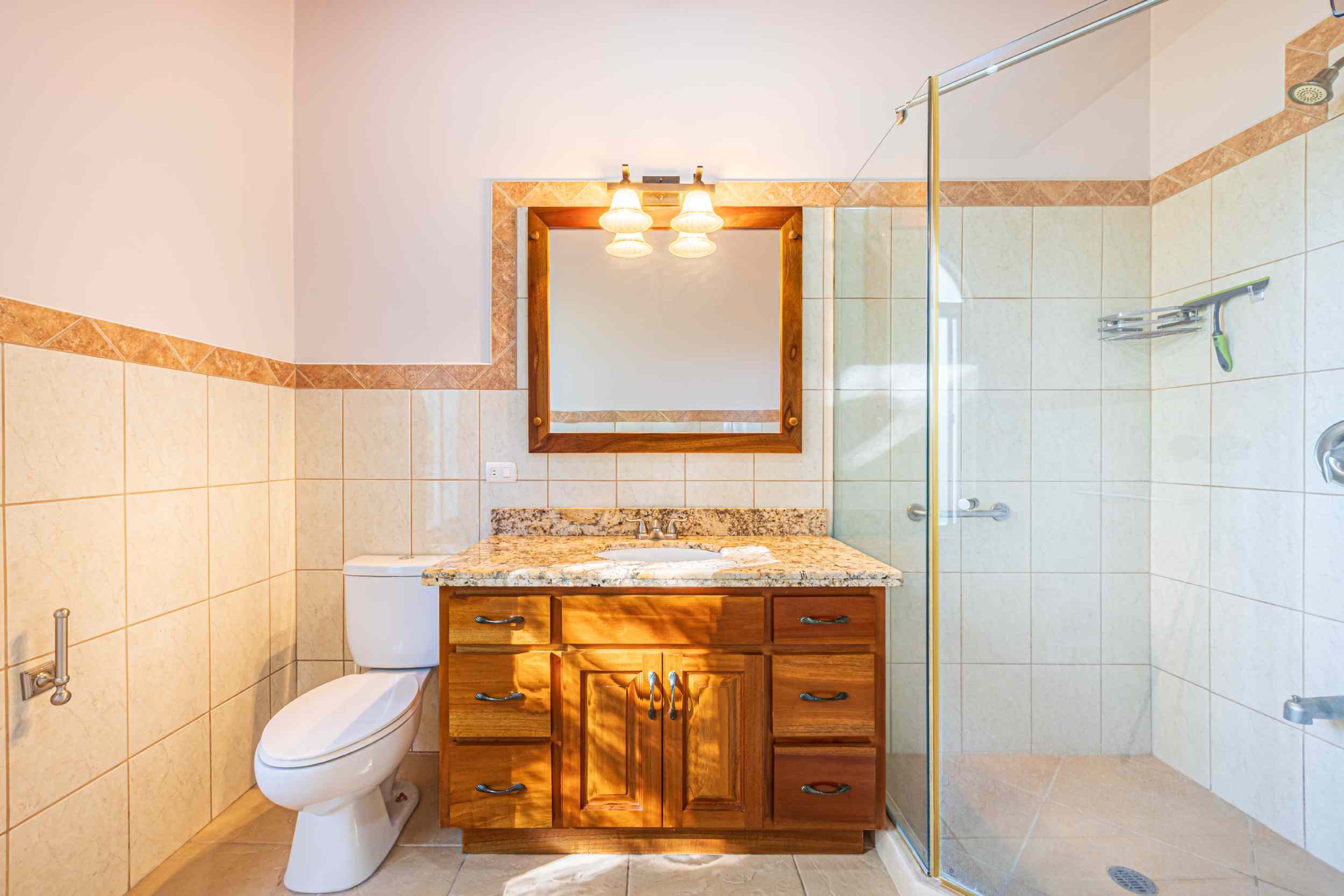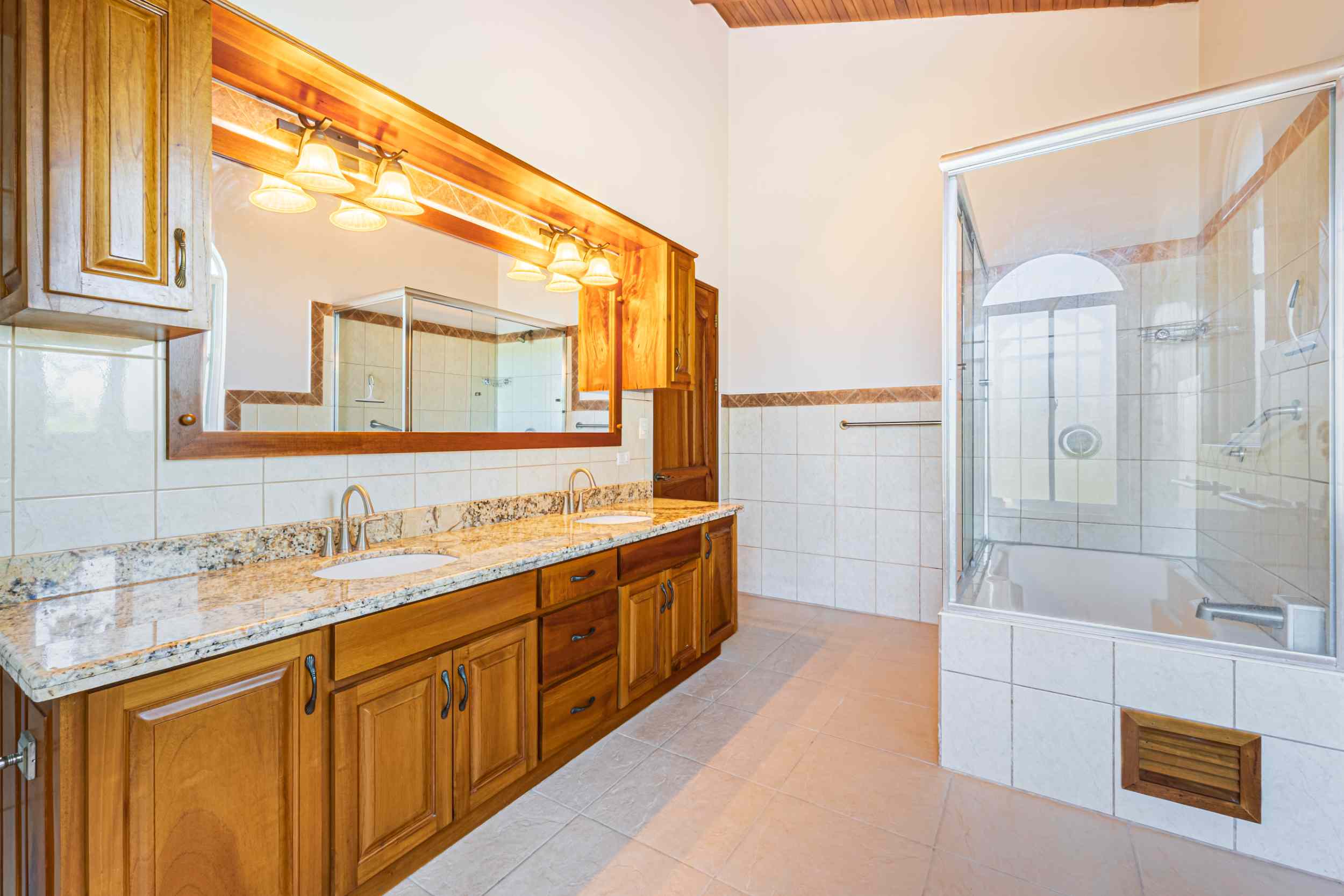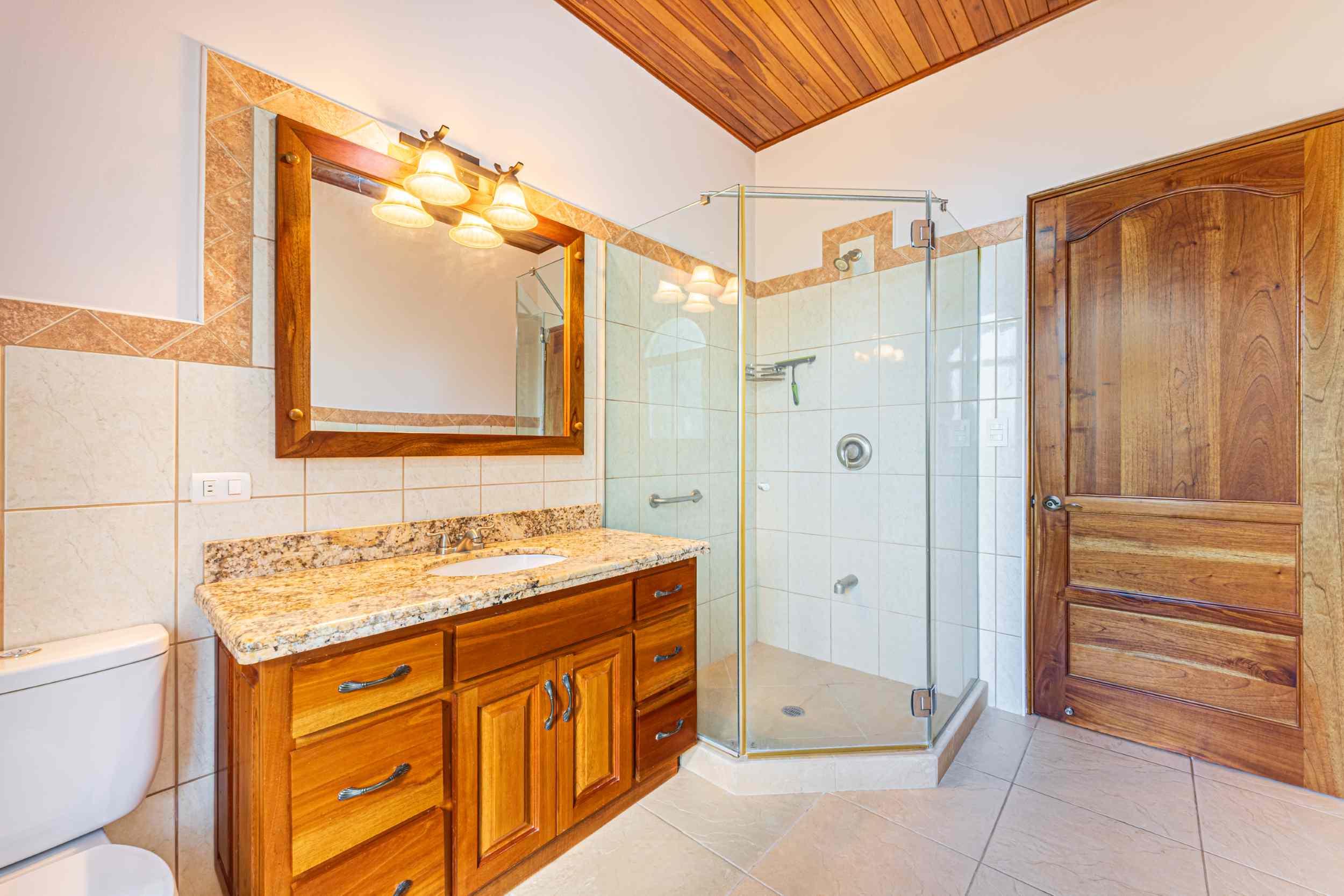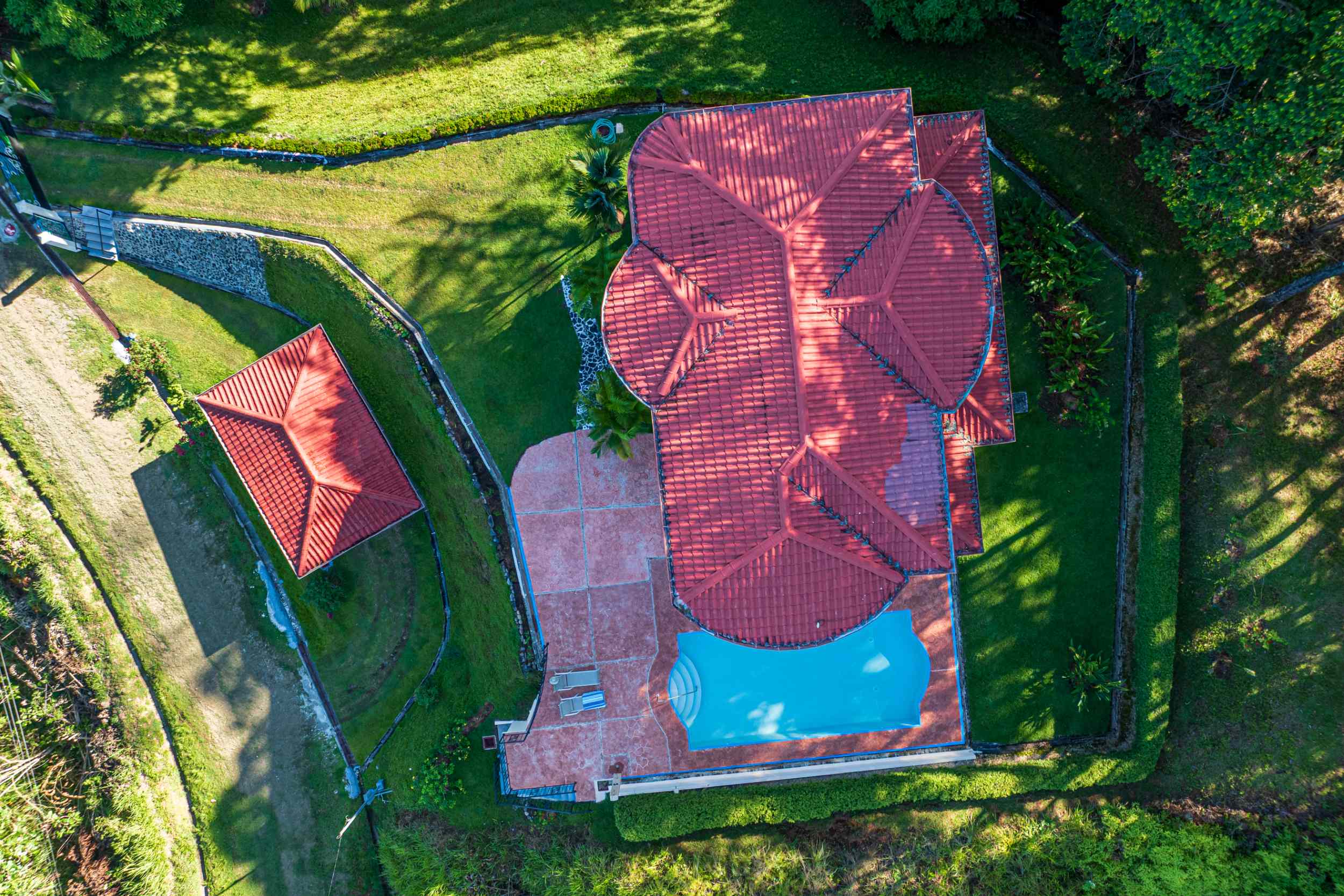 From the moment you arrive, you appreciate the immaculate landscaping, tropical plants and fruit trees around the residence. The home was completed in 2013, built with quality and longevity in mind. With a total of 2,652 sq.ft. solid concrete construction, intricate details, abundant windows and soaring ceilings create a feeling of grandeur within the home. The classic architecture is complemented by warm natural hardwood accents and custom wood ceilings. The main floor is a functional open space, with indoor dining, living space and the kitchen, which features granite countertops and locally made cabinetry. The main floor also hosts two guest bedrooms and one spacious full bathroom, as well as the laundry room with storage. The elegant staircase leads upstairs to a flexible bonus room with private balcony access, perfect as an art studio, office, or additional bedroom. The private primary bedroom is bright and spacious, with high ceilings, private balcony and large ensuite bathroom with double vanities.