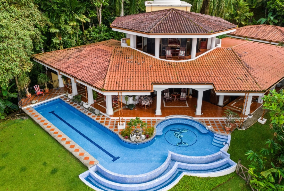 The most popular and exclusive gated community on the southern Pacific coast is where you will find this estate of almost 8 acres with jungle, waterfalls and the large Mediterranean Villa. The current, and original owners, hiked the land and personally chose this pinnacle property because of the panoramic views, the amount of land, and the privacy it would provide.