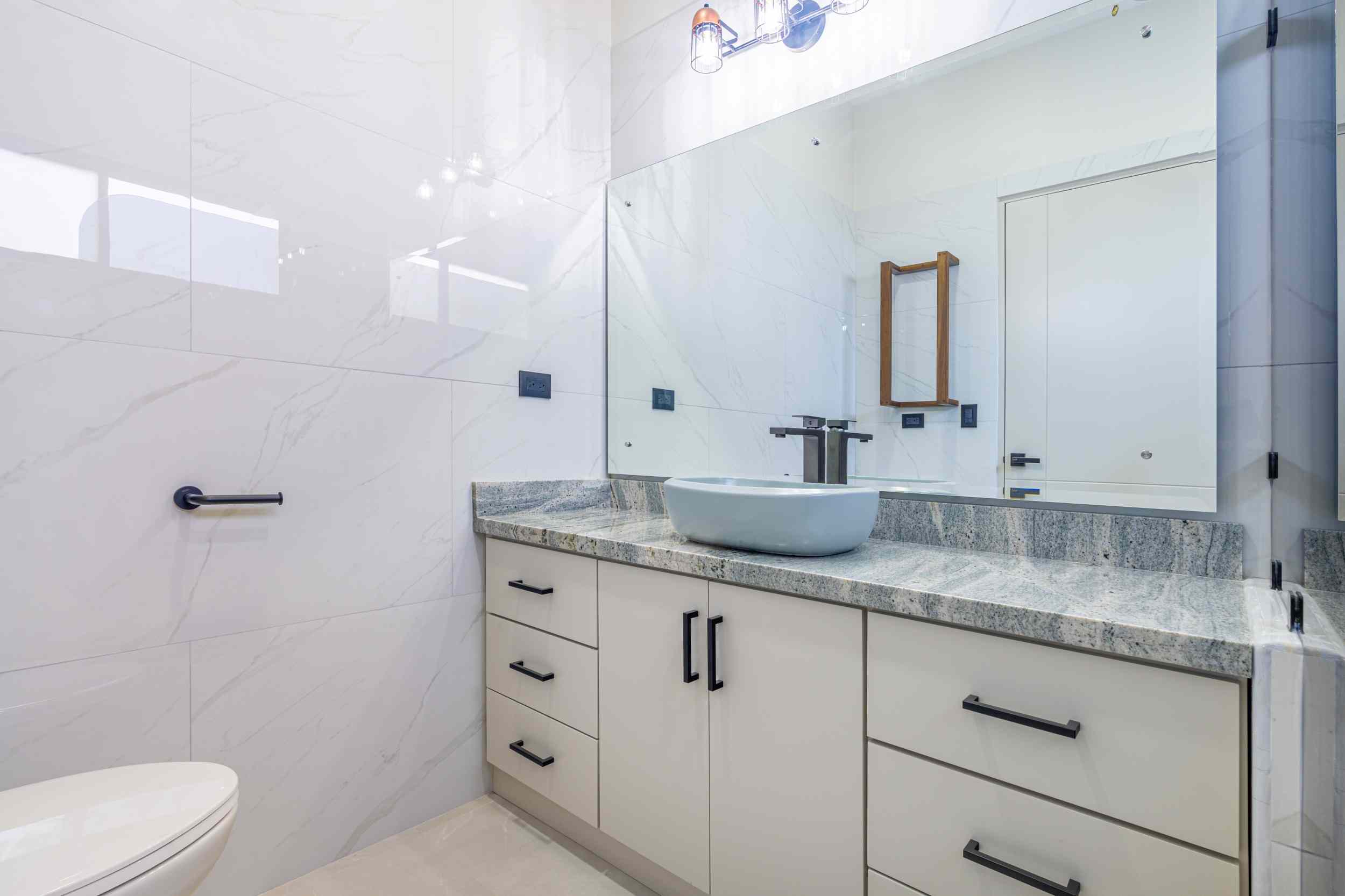 Step inside and experience an open-concept layout enhanced by soaring vaulted ceilings and custom high-set windows that draw in cascades of natural light, illuminating every corner of the living space. At the heart of the home lies a beautifully appointed kitchen, equipped with top-tier appliances and anchored by a stunning island with premium stone countertops—offering both function and refined aesthetics. Adjacent to the kitchen, a custom wood dining table sits beneath a striking coralina feature wall, destined to be a conversation piece for your guests.