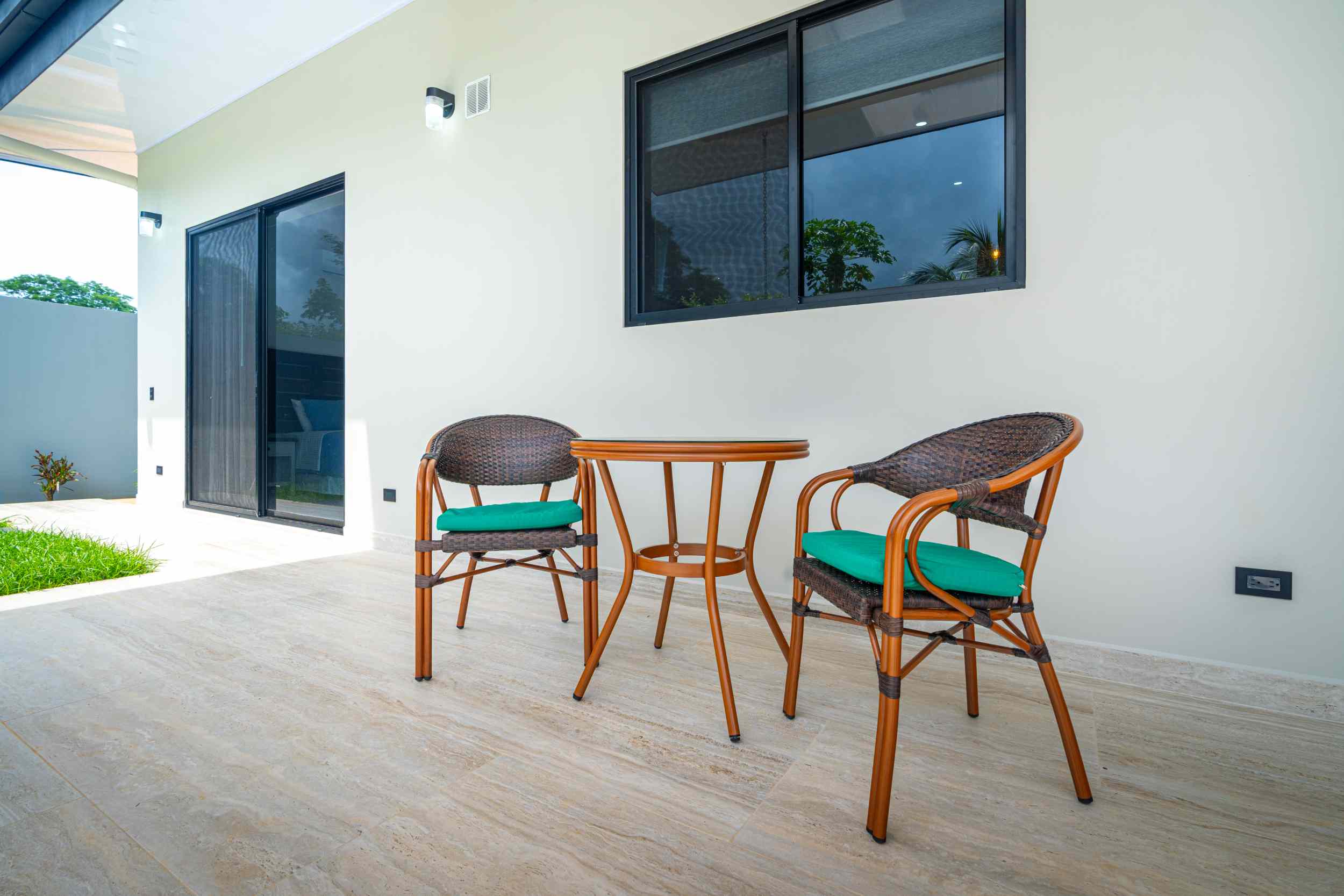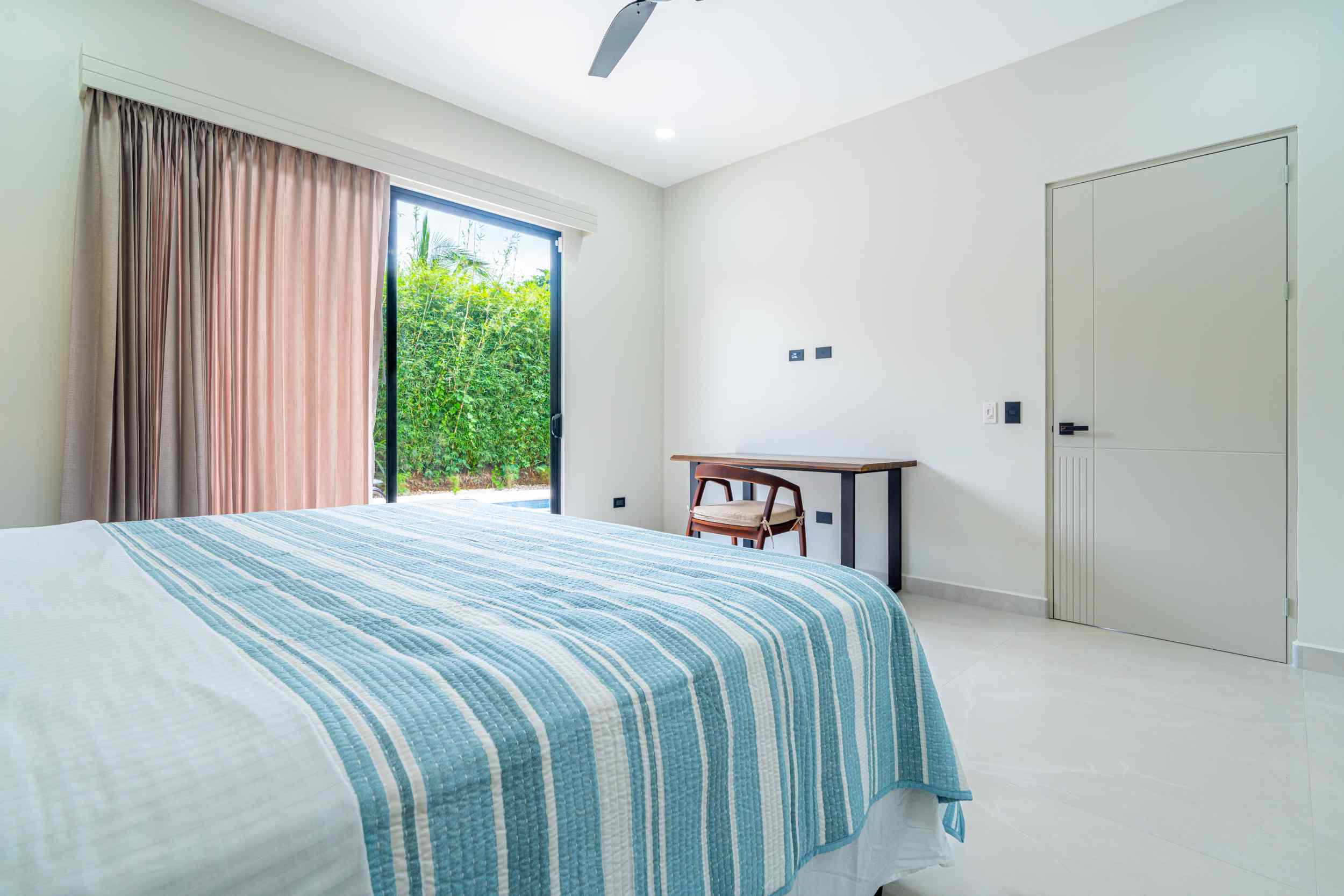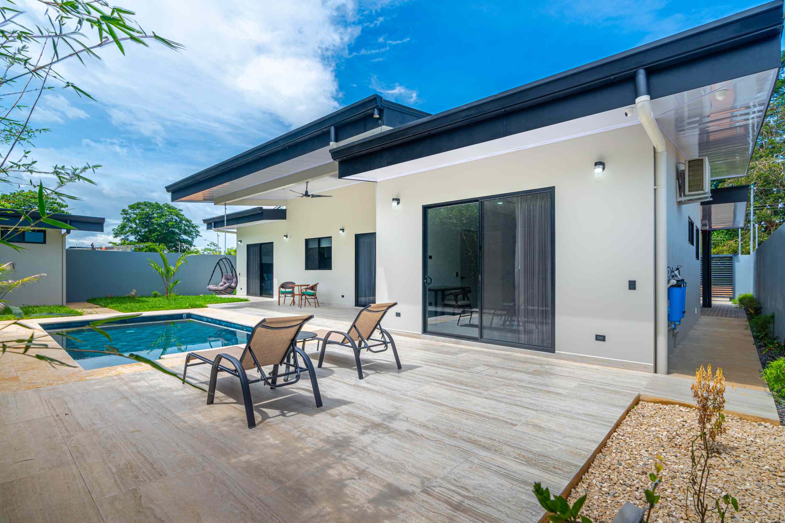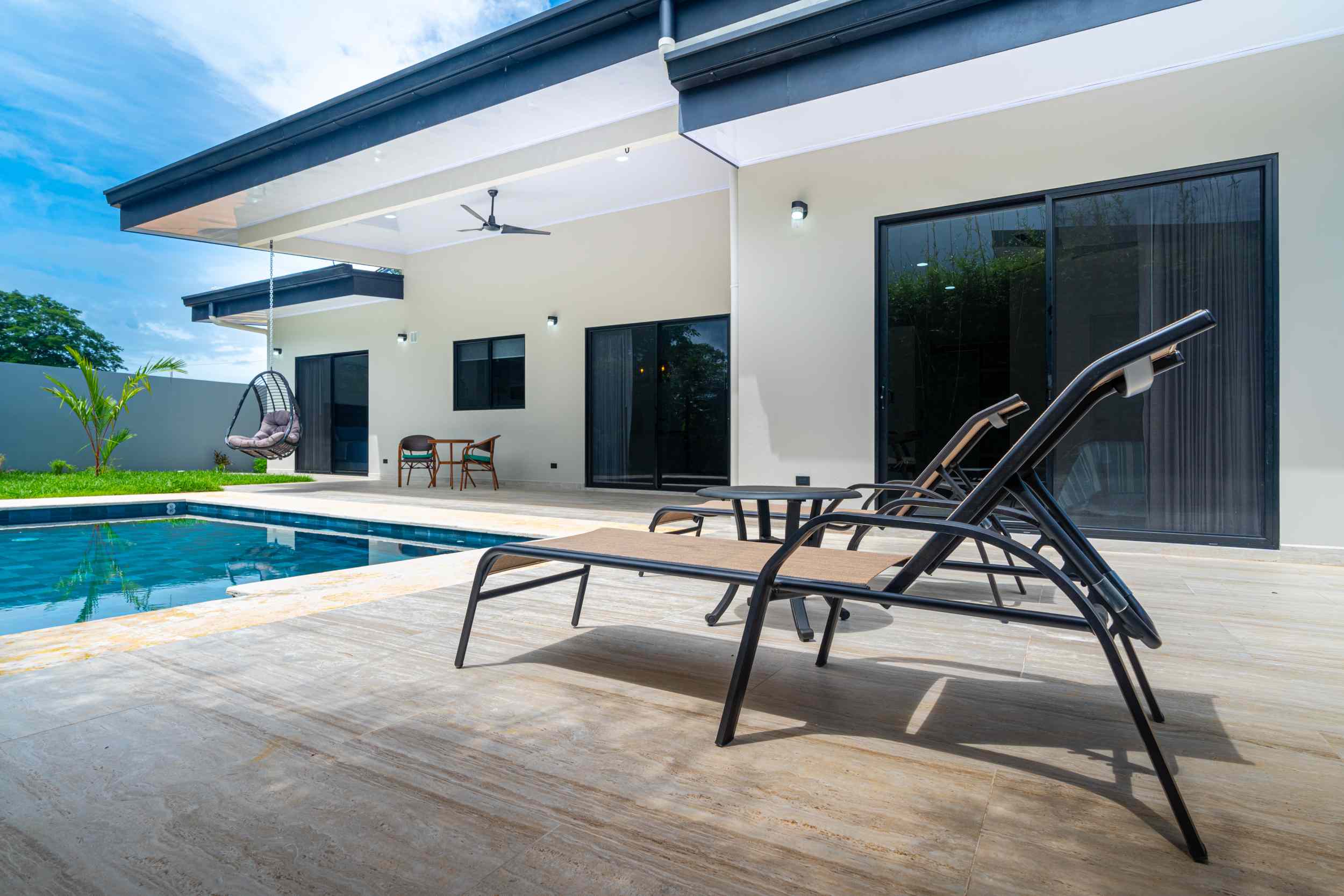 Outside, the property becomes a private oasis. The pool features deep blue, matte-finish tiles in a checkerboard pattern that evoke the calm elegance of a Bali retreat. It is framed by natural coralina stone, offering a refined contrast and a cool, non-slip surface perfect for barefoot lounging. The expansive outdoor living space is floored with non-slip travertine tiles, chosen for their cool, barefoot-friendly texture and timeless appeal. The lush landscaping showcases vibrant Costa Rican flora, offering beauty and privacy in equal measure.