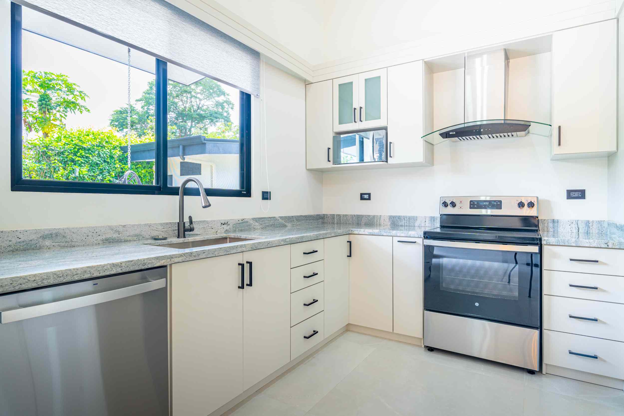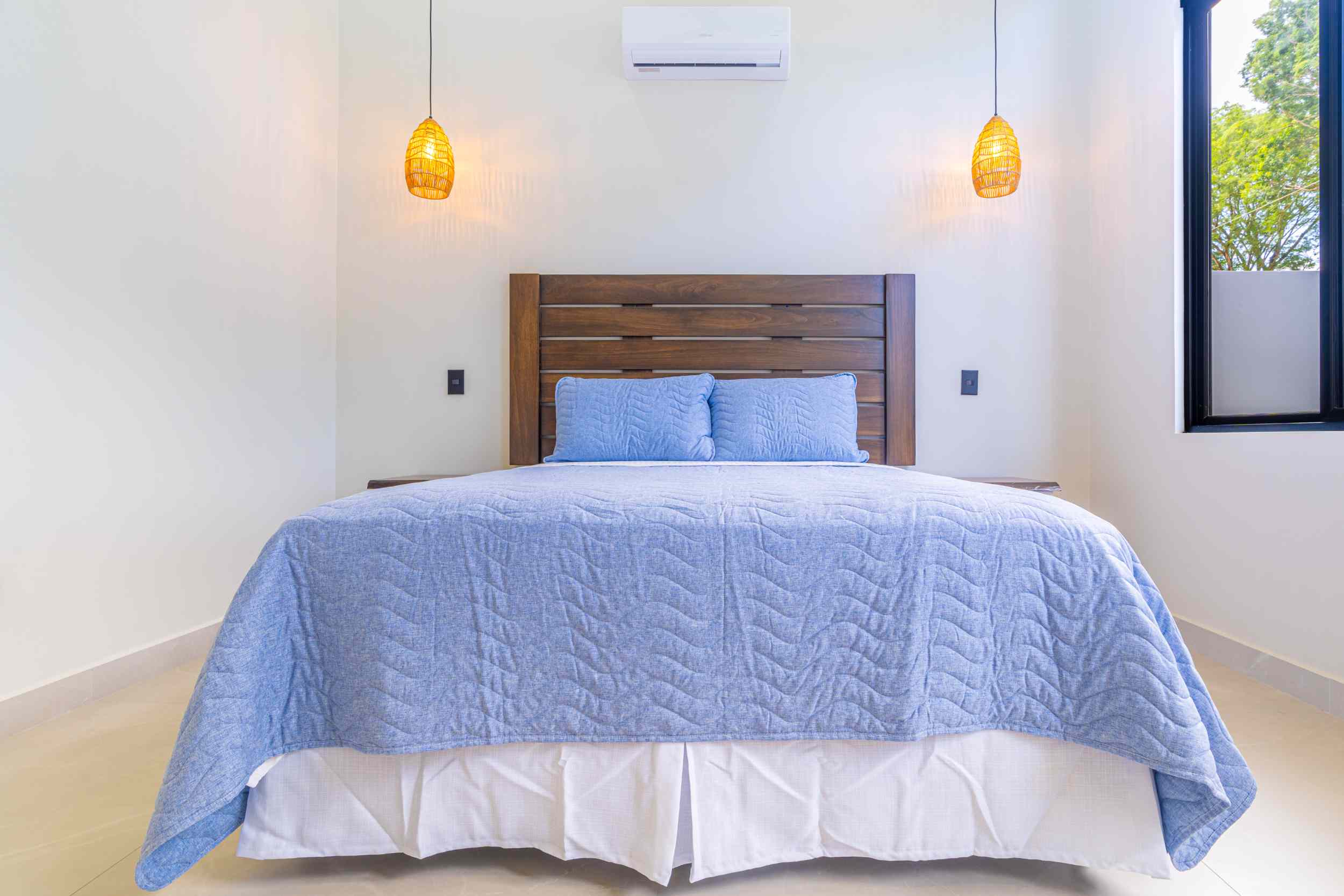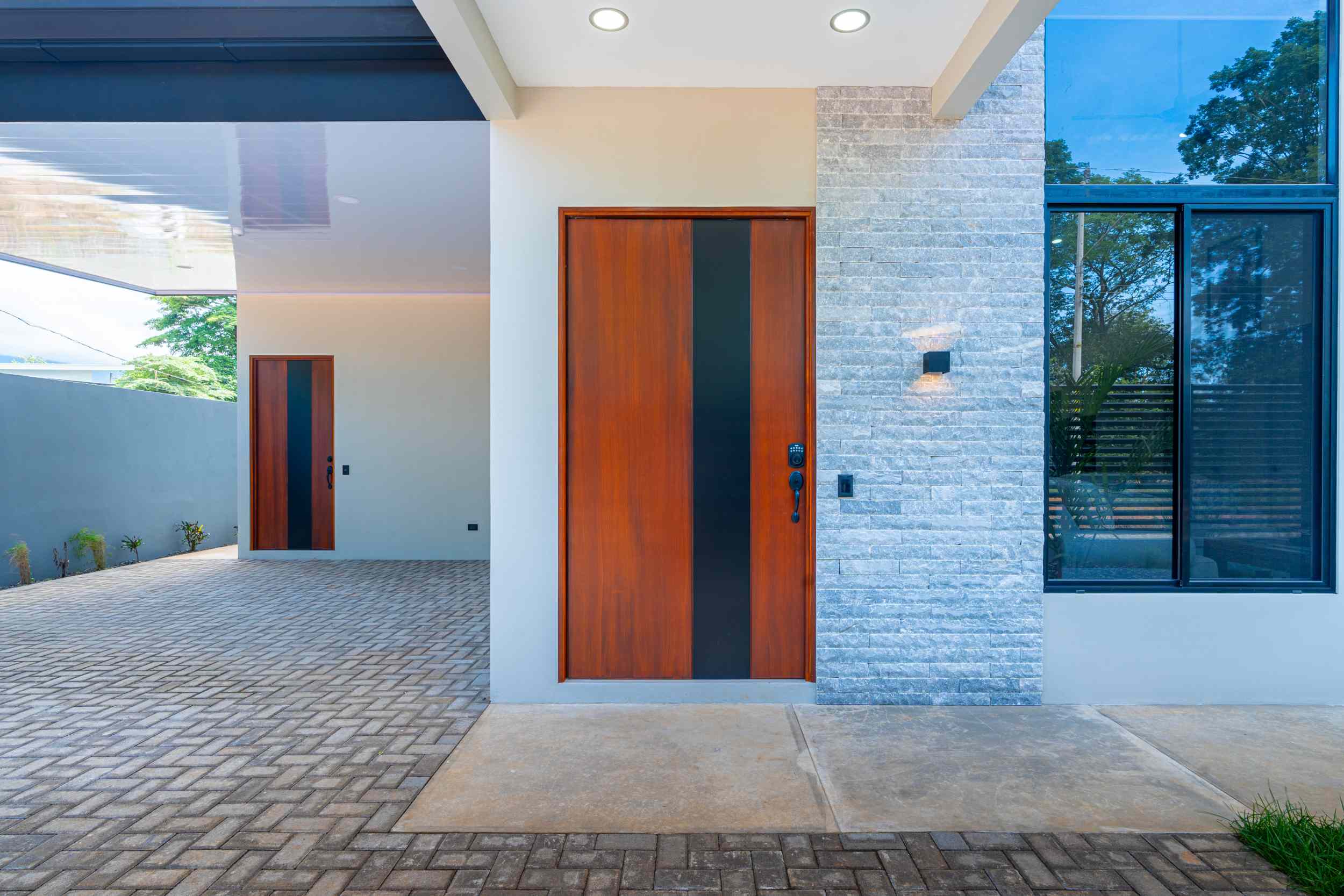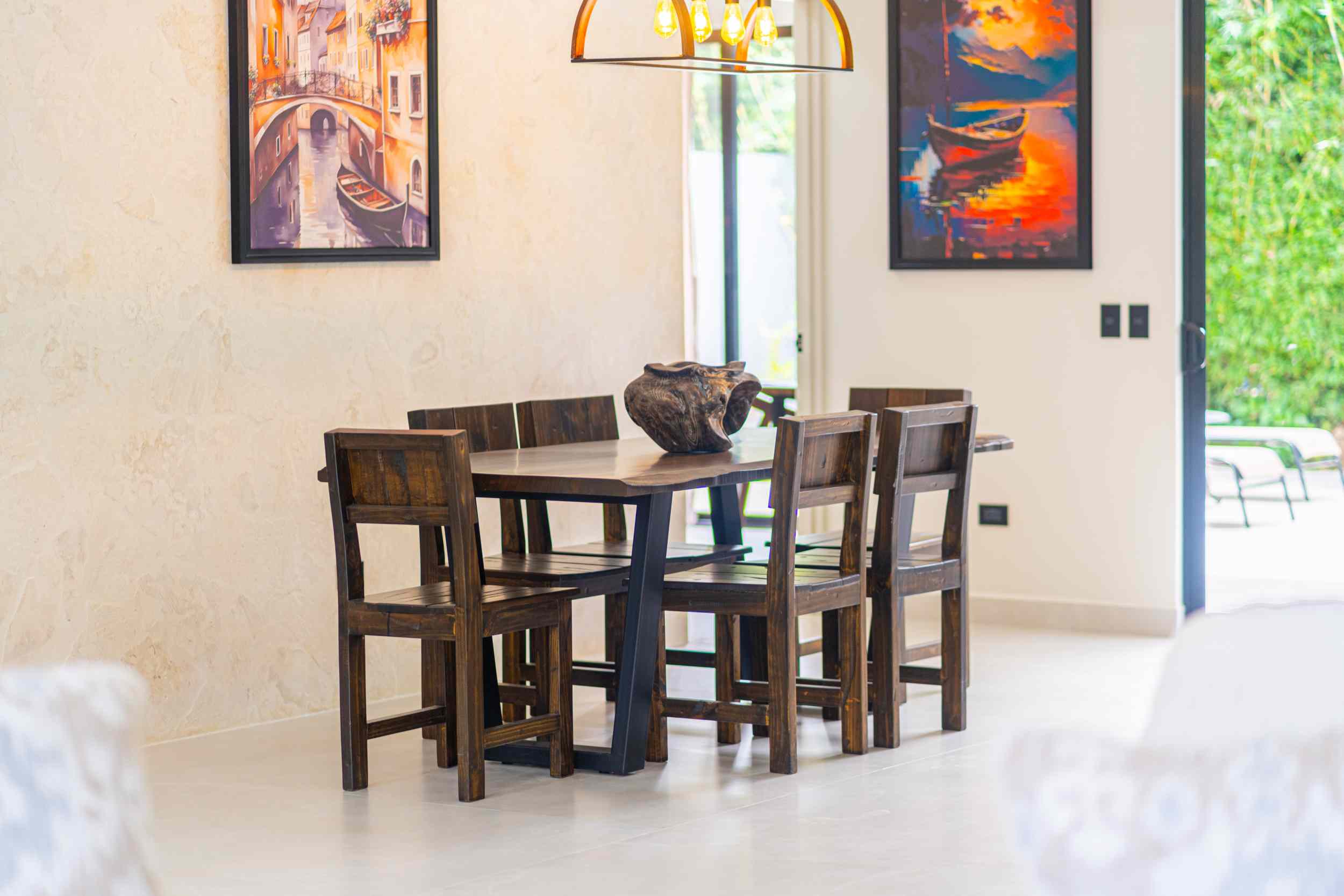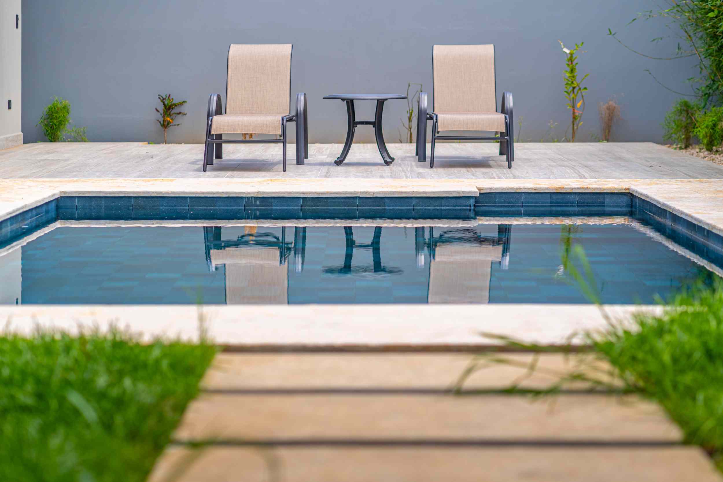 Outside, the property becomes a private oasis. The pool features deep blue, matte-finish tiles in a checkerboard pattern that evoke the calm elegance of a Bali retreat. It is framed by natural coralina stone, offering a refined contrast and a cool, non-slip surface perfect for barefoot lounging. The expansive outdoor living space is floored with non-slip travertine tiles, chosen for their cool, barefoot-friendly texture and timeless appeal. The lush landscaping showcases vibrant Costa Rican flora, offering beauty and privacy in equal measure.