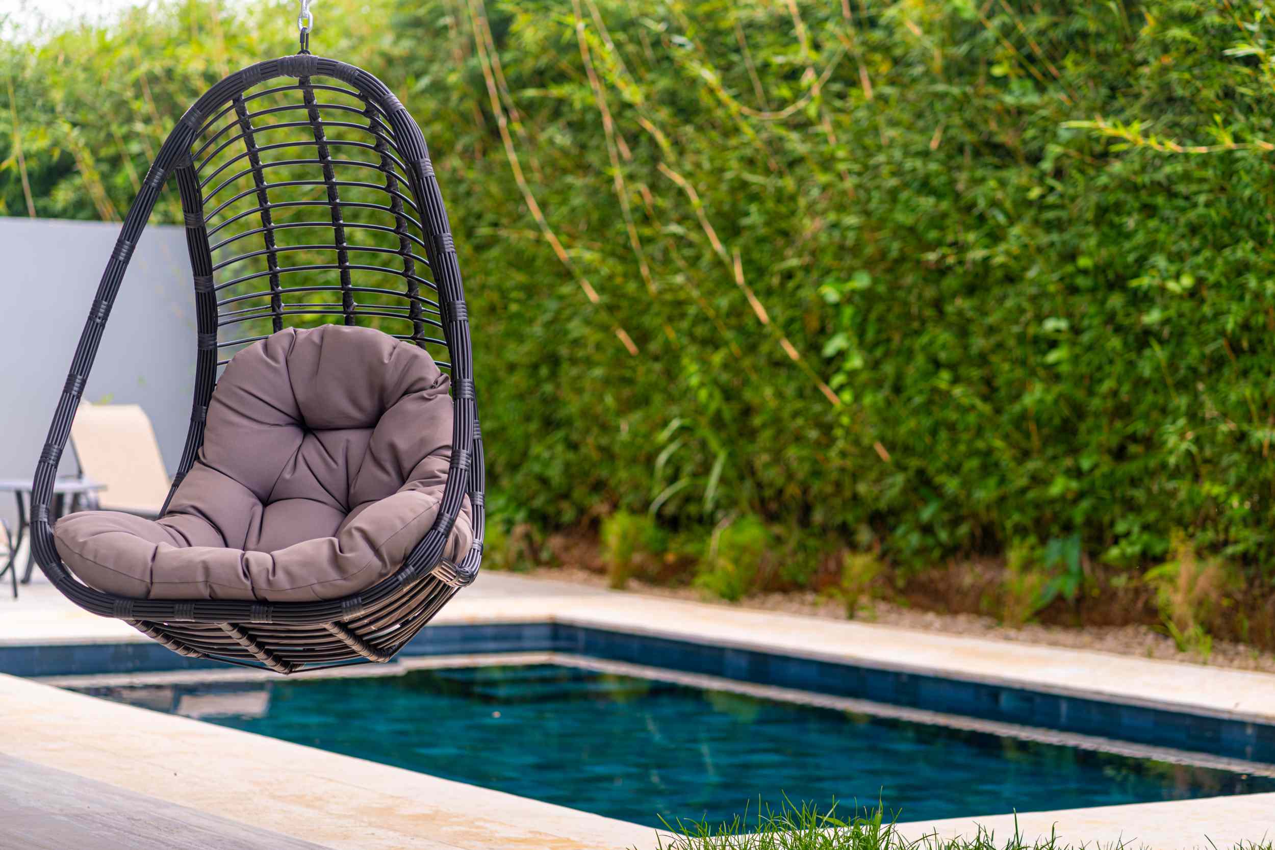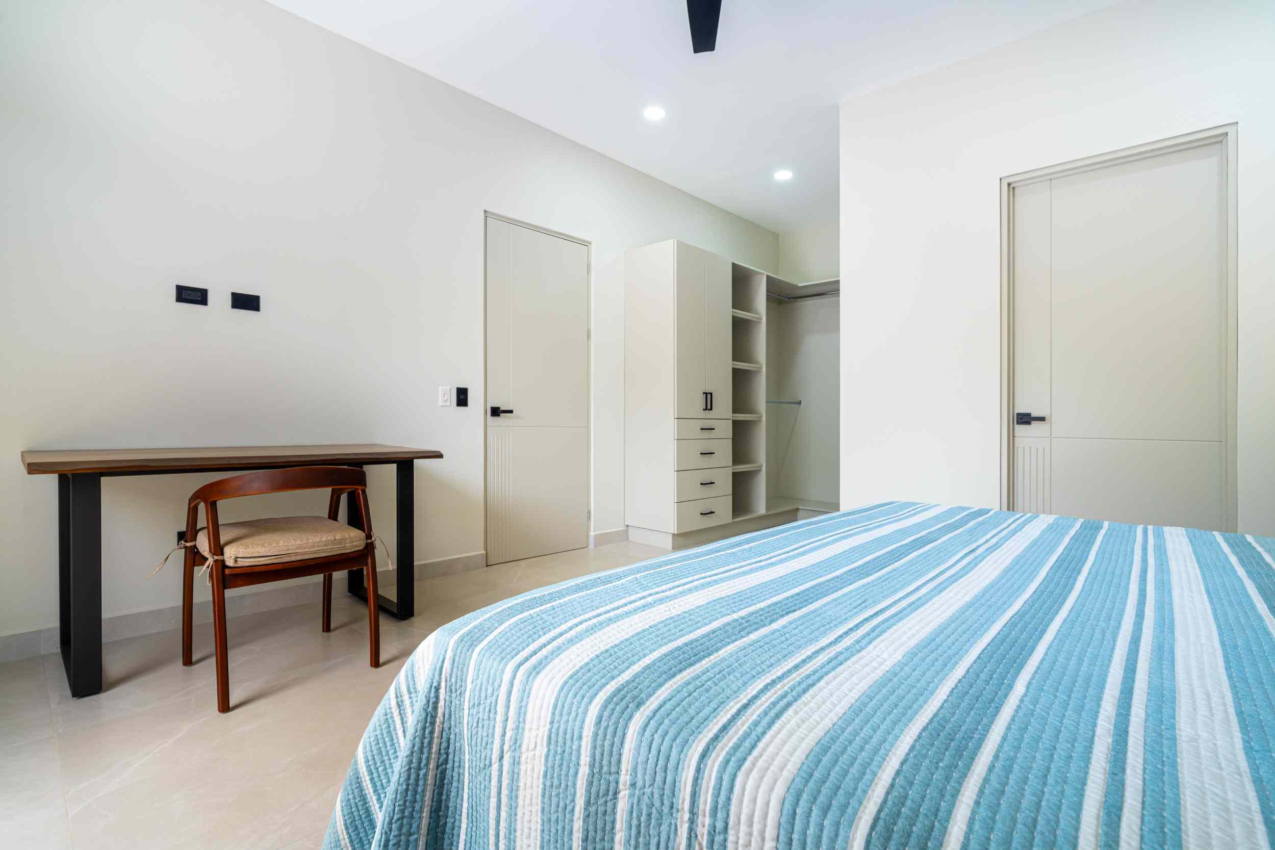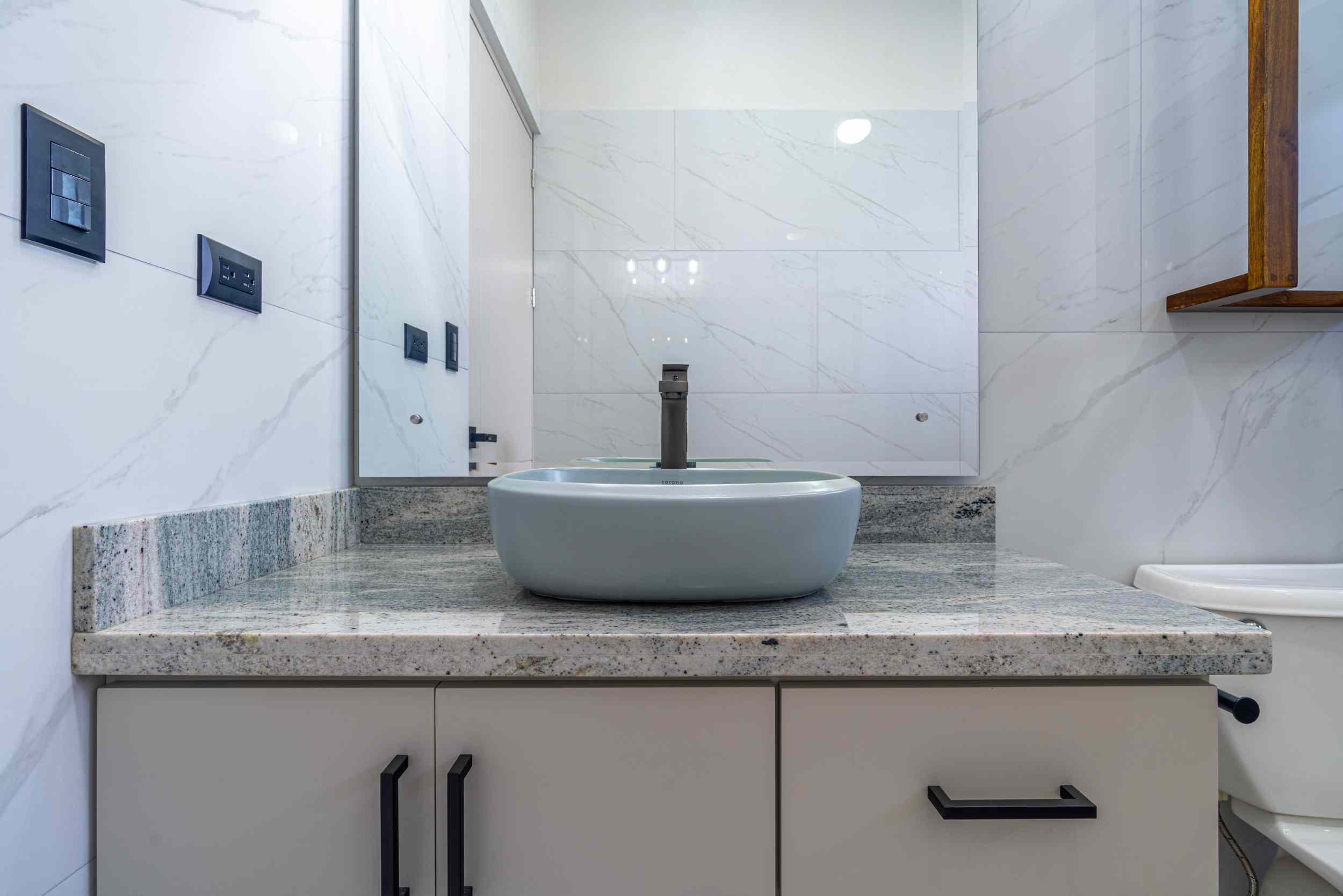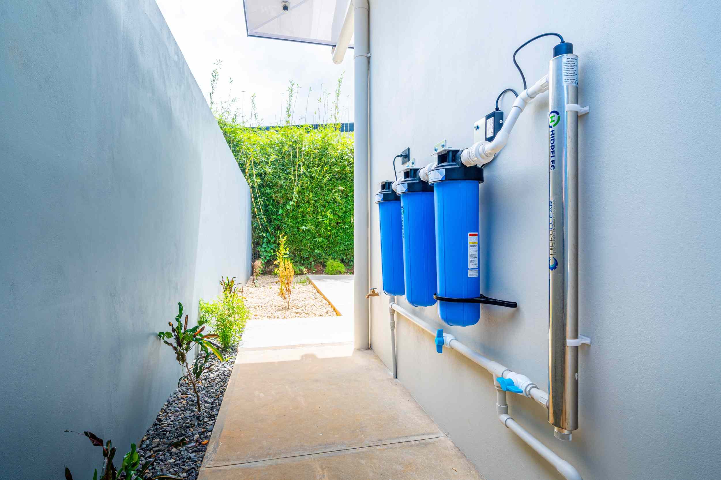 Outside, the property becomes a private oasis. The pool features deep blue, matte-finish tiles in a checkerboard pattern that evoke the calm elegance of a Bali retreat. It is framed by natural coralina stone, offering a refined contrast and a cool, non-slip surface perfect for barefoot lounging. The expansive outdoor living space is floored with non-slip travertine tiles, chosen for their cool, barefoot-friendly texture and timeless appeal. The lush landscaping showcases vibrant Costa Rican flora, offering beauty and privacy in equal measure.