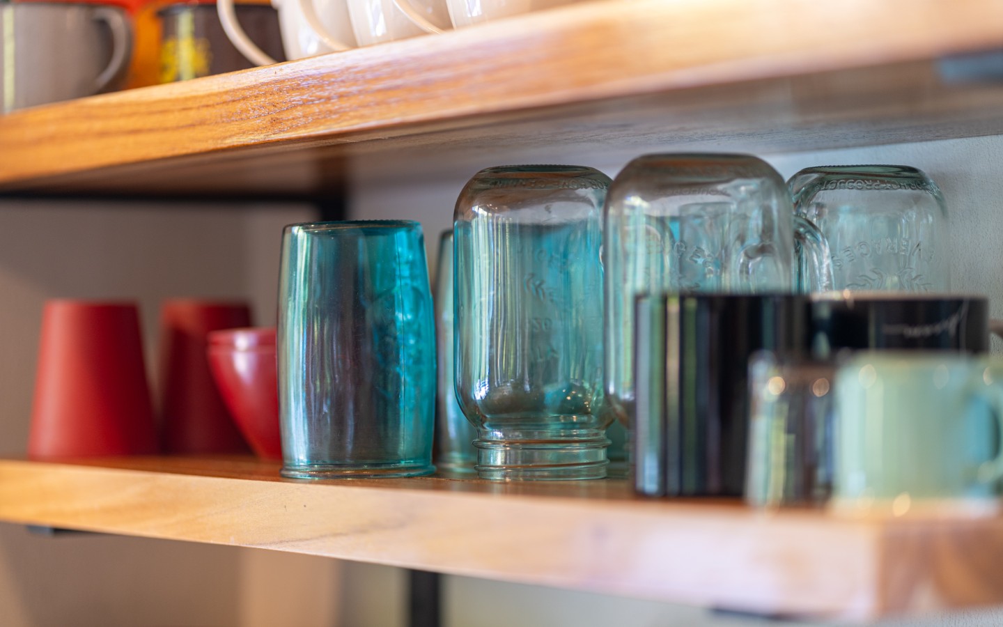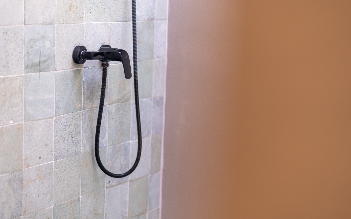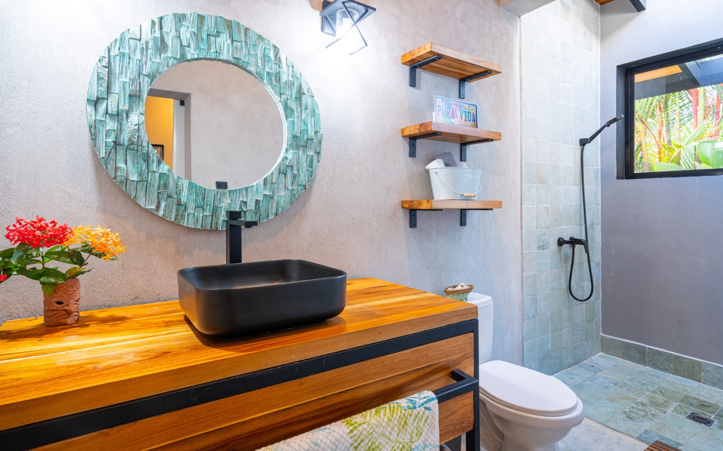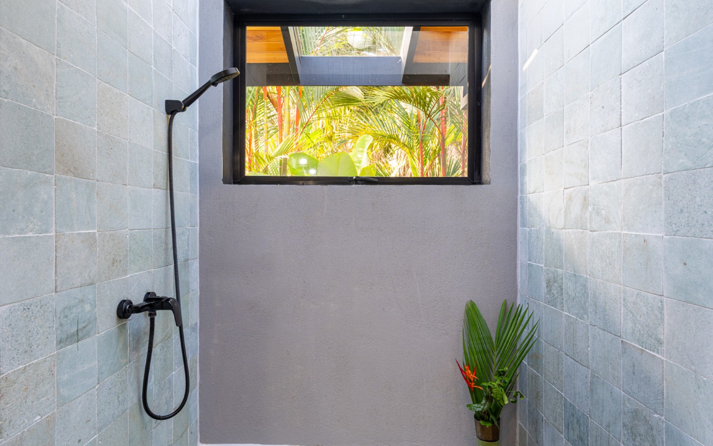 Both master suites offer new air conditioning, generous space and ensuite baths. The showers feature stunning green Sukabumi imported stone, accentuating the carefully chosen cool natural concrete walls and floors.. Natural light filters through the skylights above the showers creating a sense of indoor and outdoor showering.