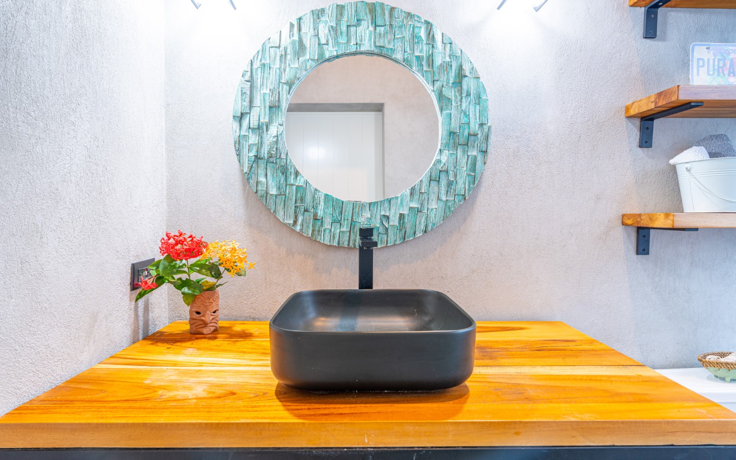 Upon entering, the property captivates with the mature landscaping, and stepping inside the home reveals an expansive outdoor area adorned with beautiful black trim doors and beams that harmonize with the natural teak ceilings. The selection of the elements has be meticulously curated, including Coralina, a breathable natural stone enveloping an oversized pool – a true oasis. Take a dip into the elevated tub for a refreshing natural bath, surrounded by the soothing sound of a cascading waterfall.