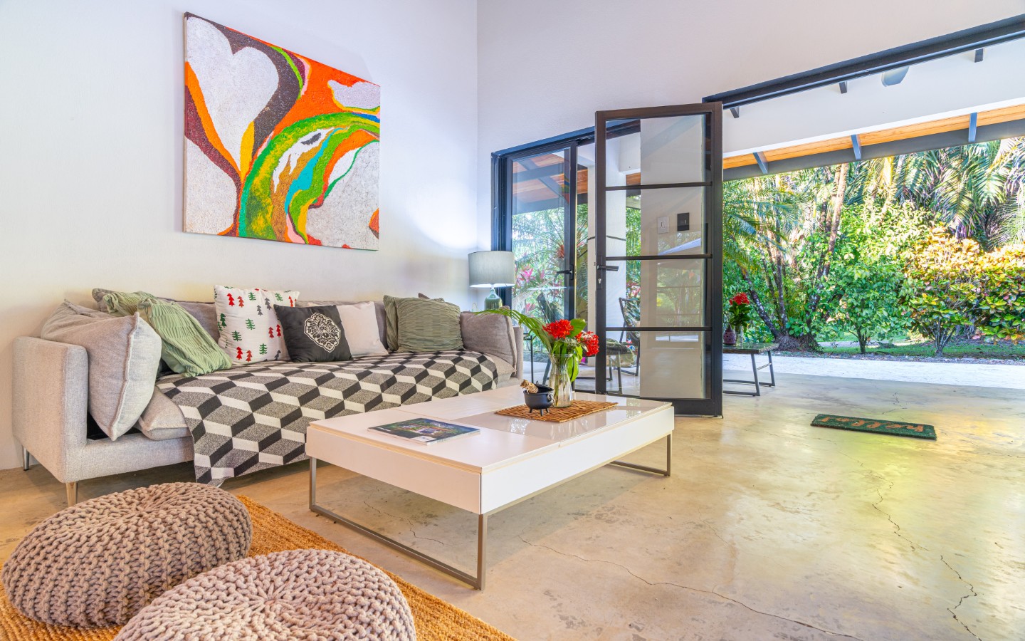 This single-level, open-concept home is both straightforward and easily maintainable. The European-designed kitchen showcases concrete counters, a chef sink, ample counter space, a gas cooktop, and a charming vintage style electric oven. Ideal for contemplative moments as you gaze out the windows to the mature lipstick palms and the surrounding nature.