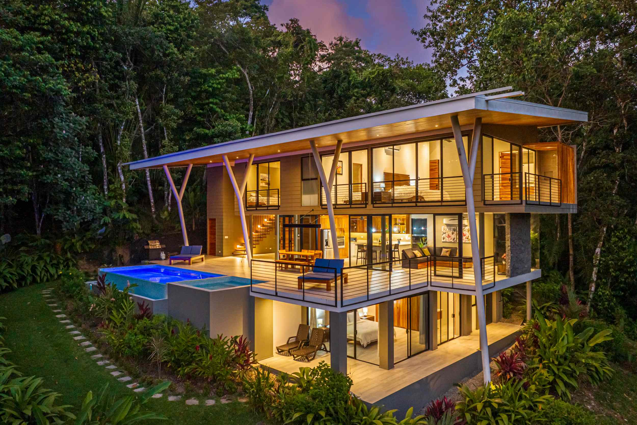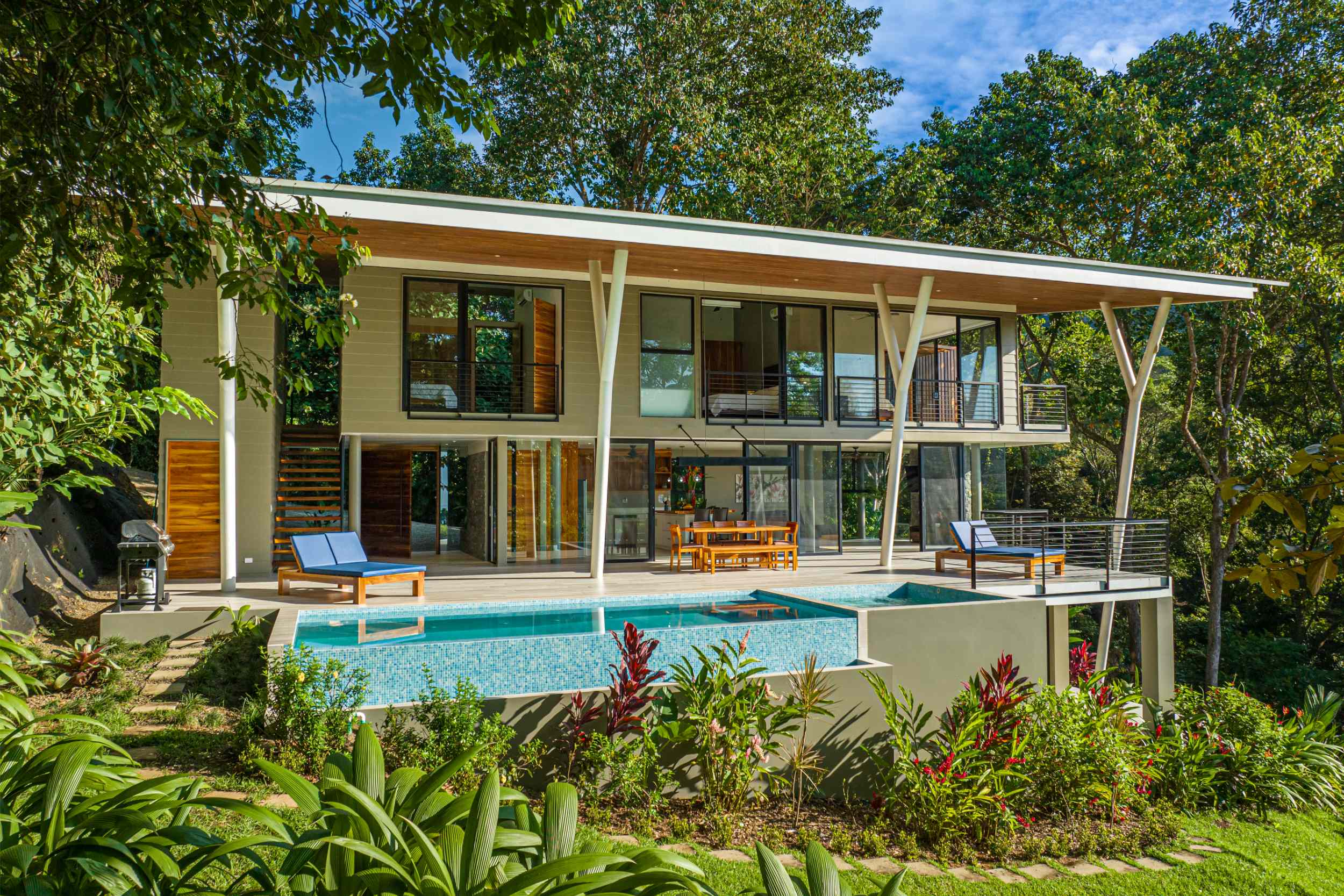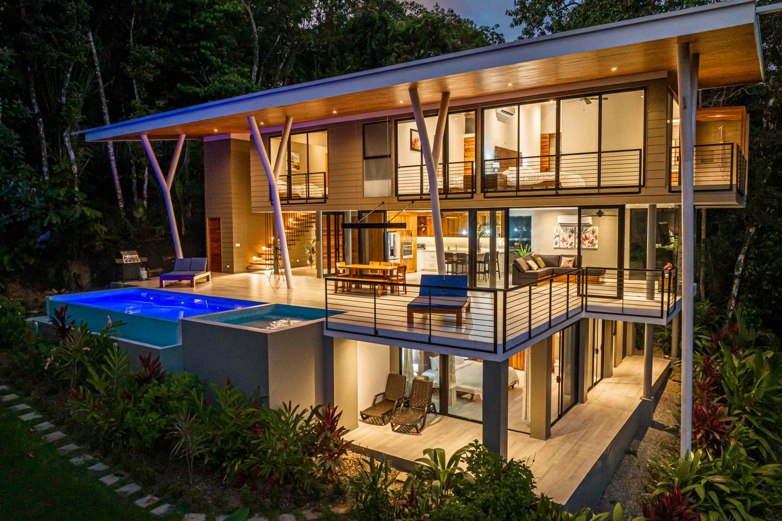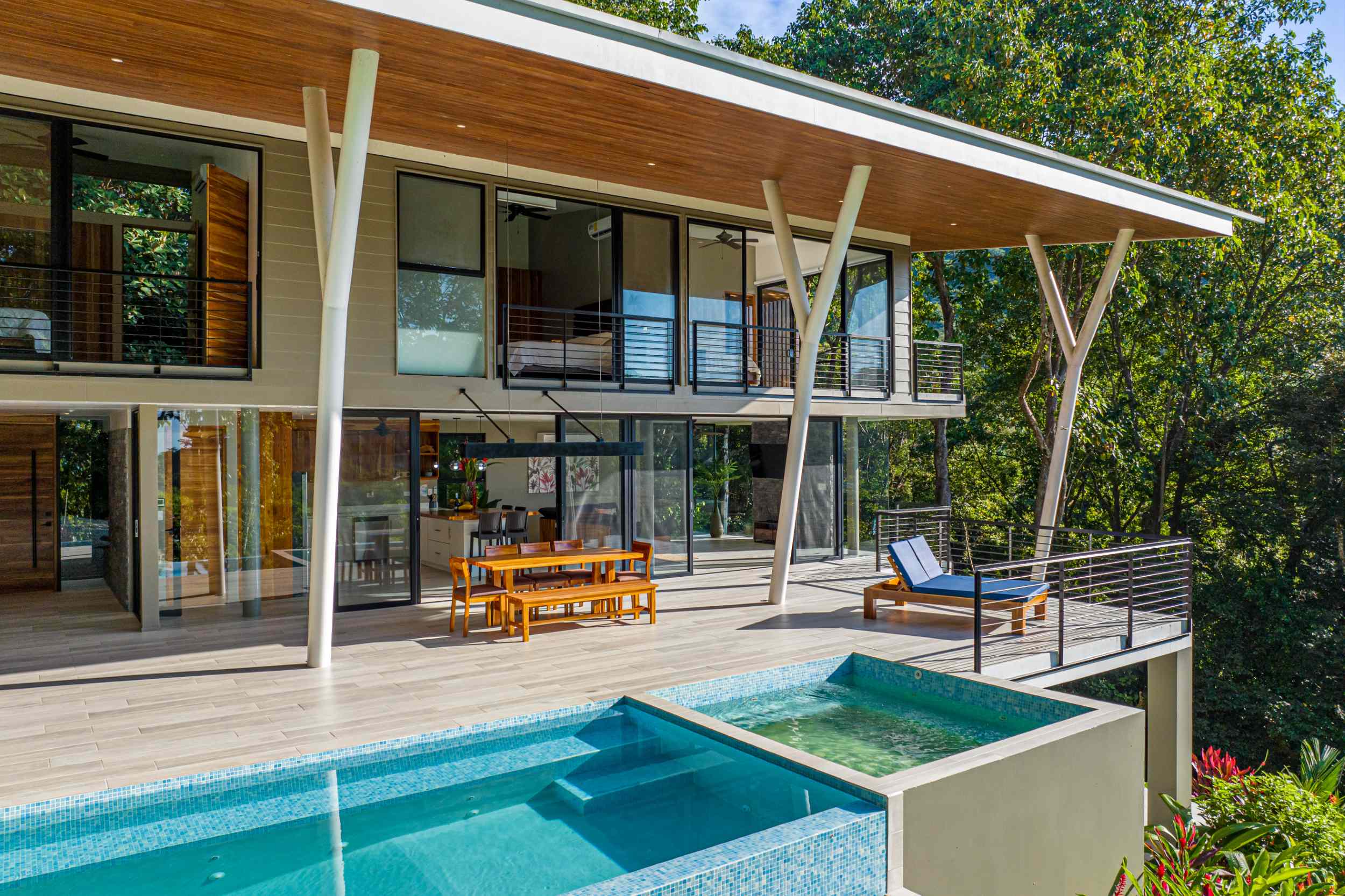 Unwind in the infinity pool or soothe your senses in the hot tub while listening to the gentle sounds of the jungle serenading you from below. The estate is fully private, gated, and nestled within a secure community, offering complete peace of mind.