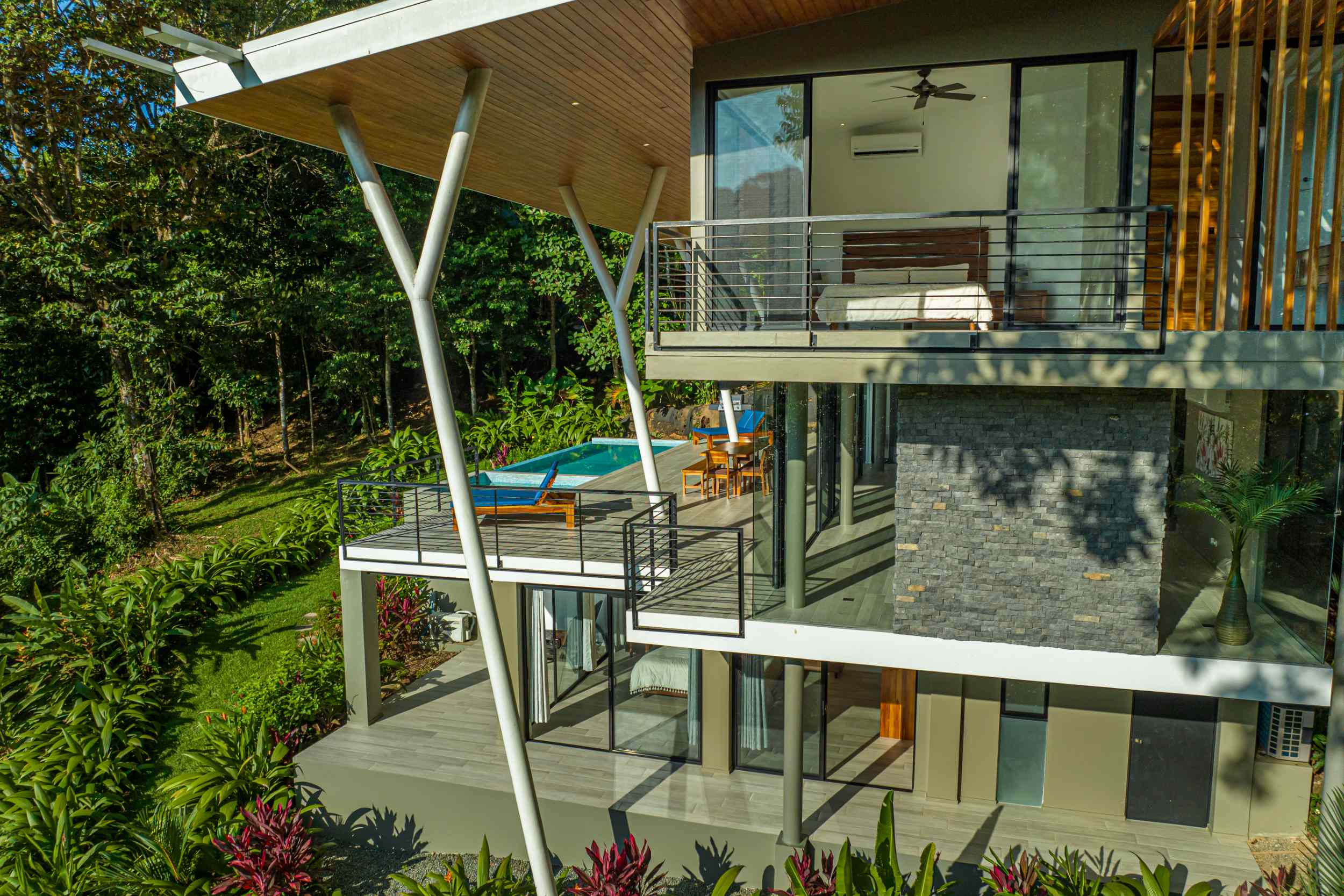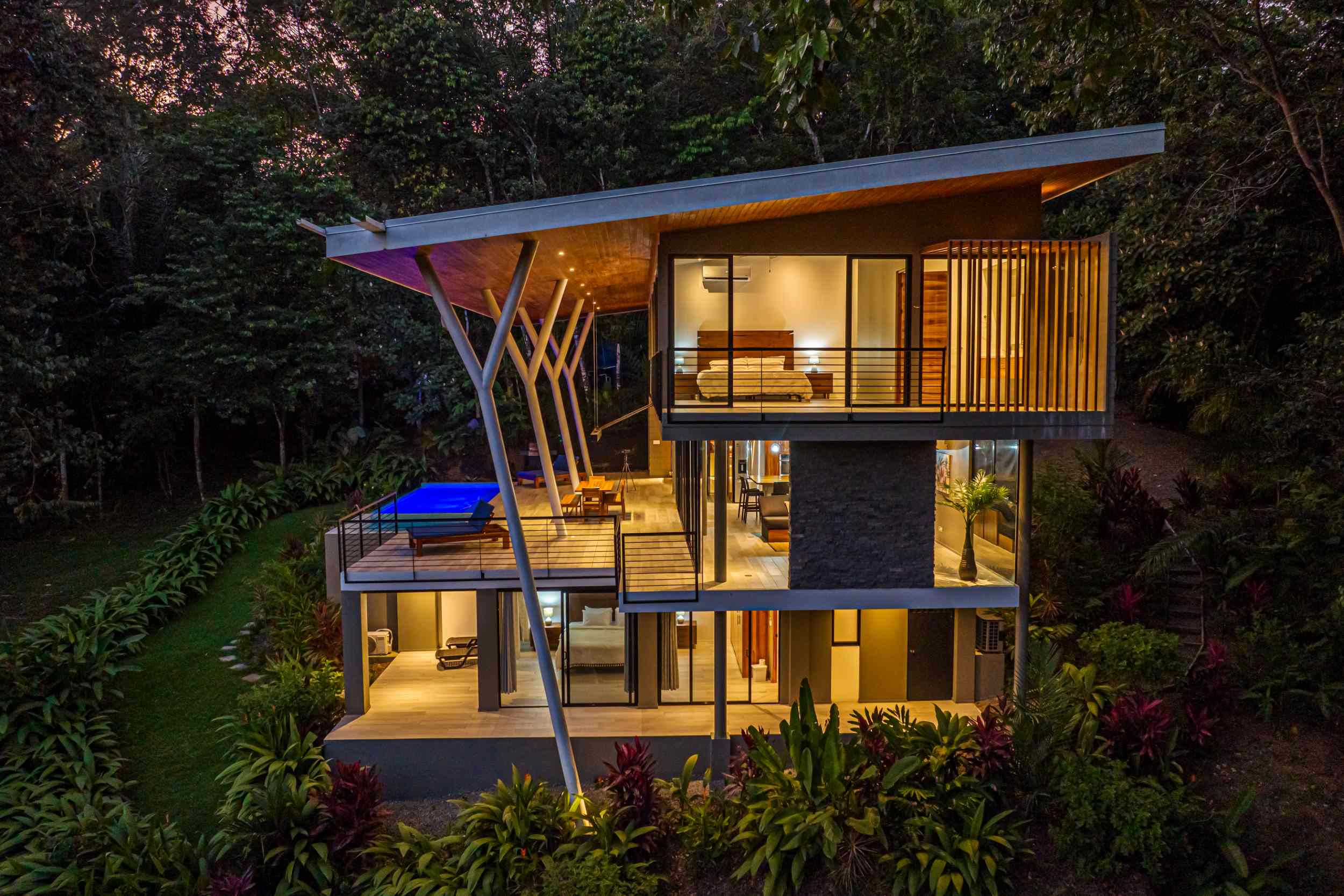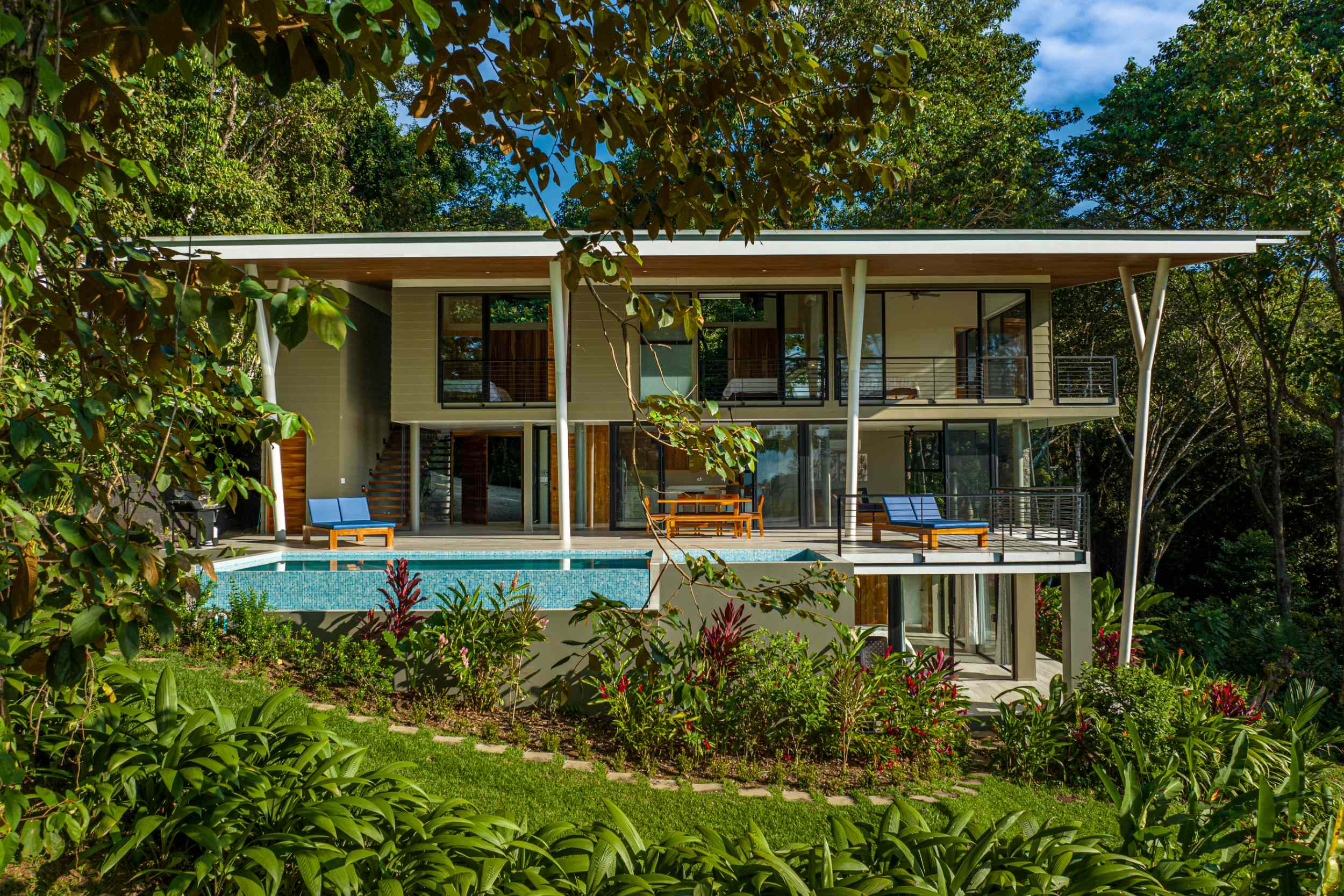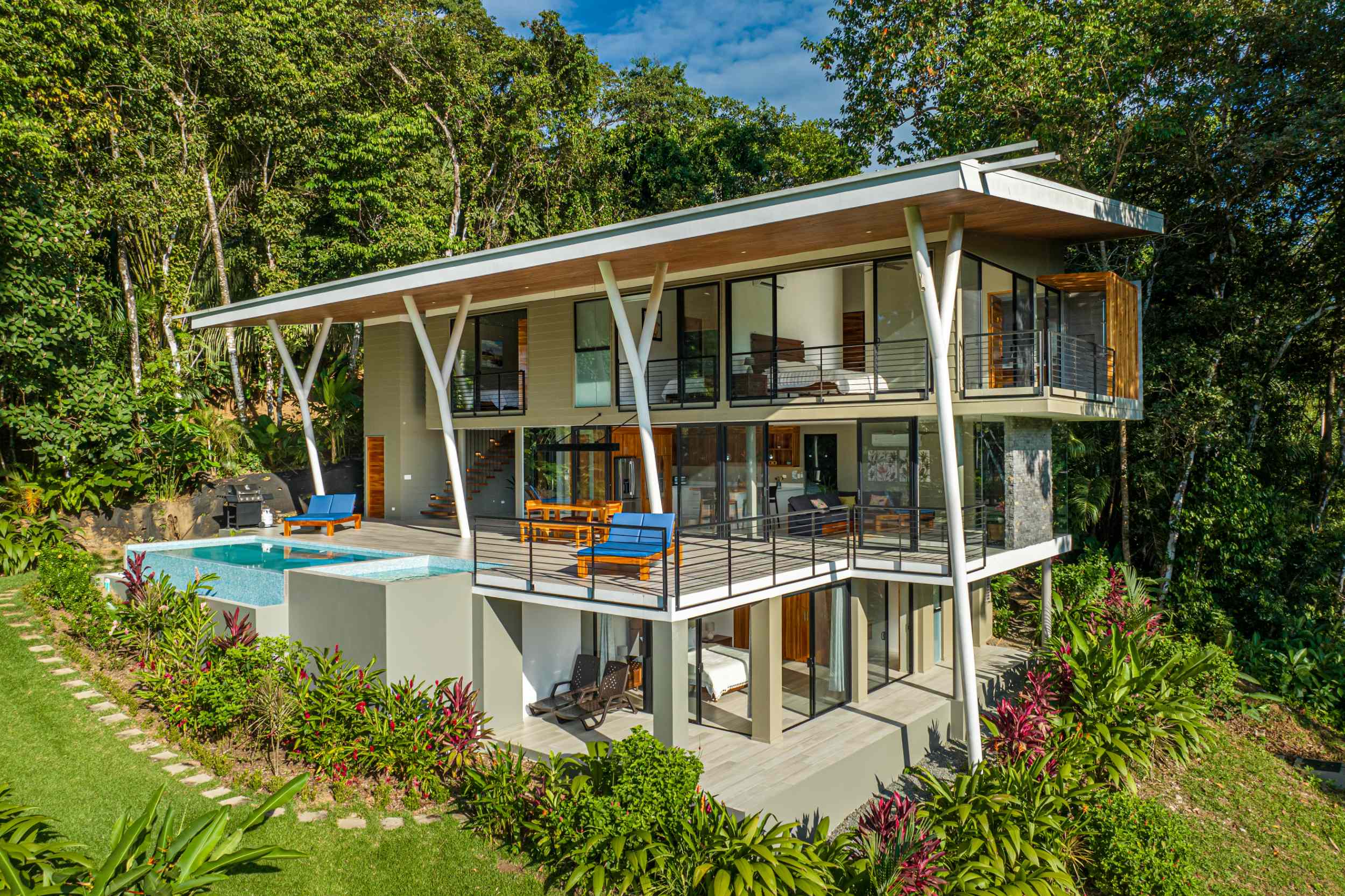 Unwind in the infinity pool or soothe your senses in the hot tub while listening to the gentle sounds of the jungle serenading you from below. The estate is fully private, gated, and nestled within a secure community, offering complete peace of mind.