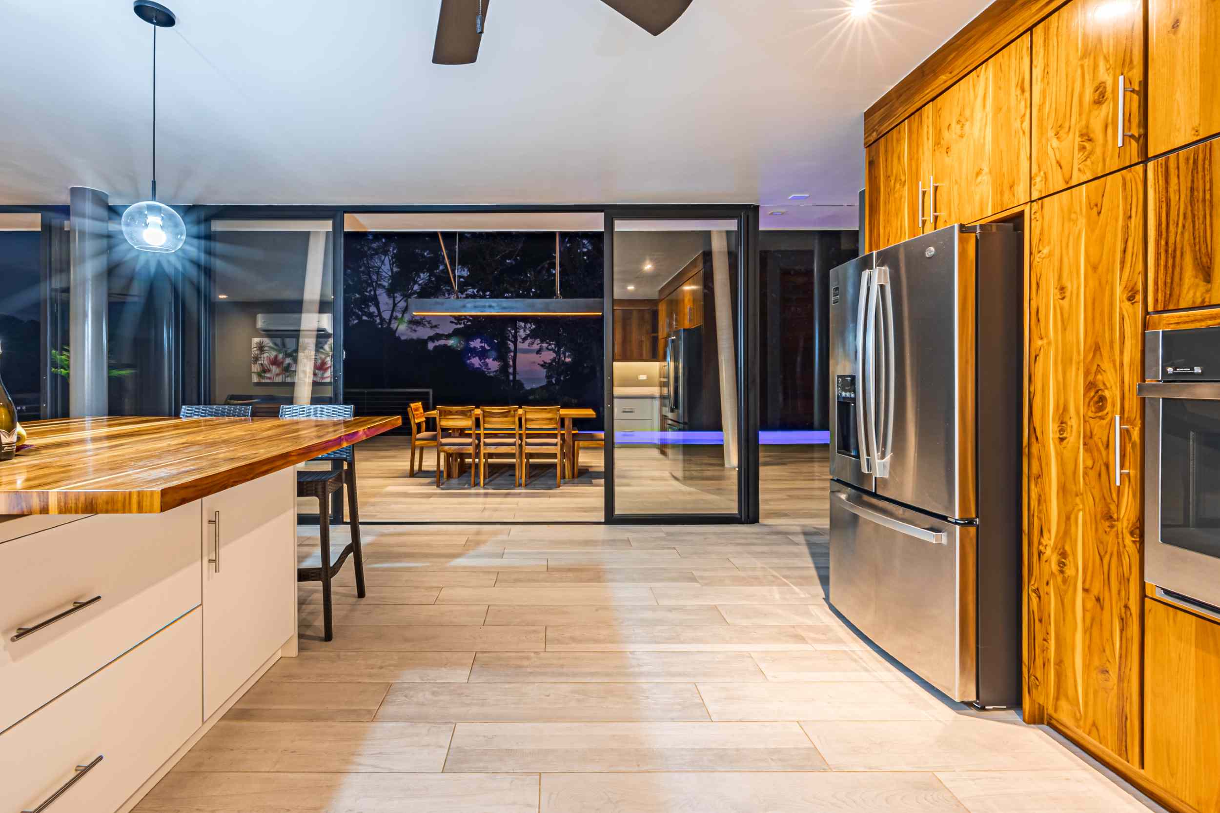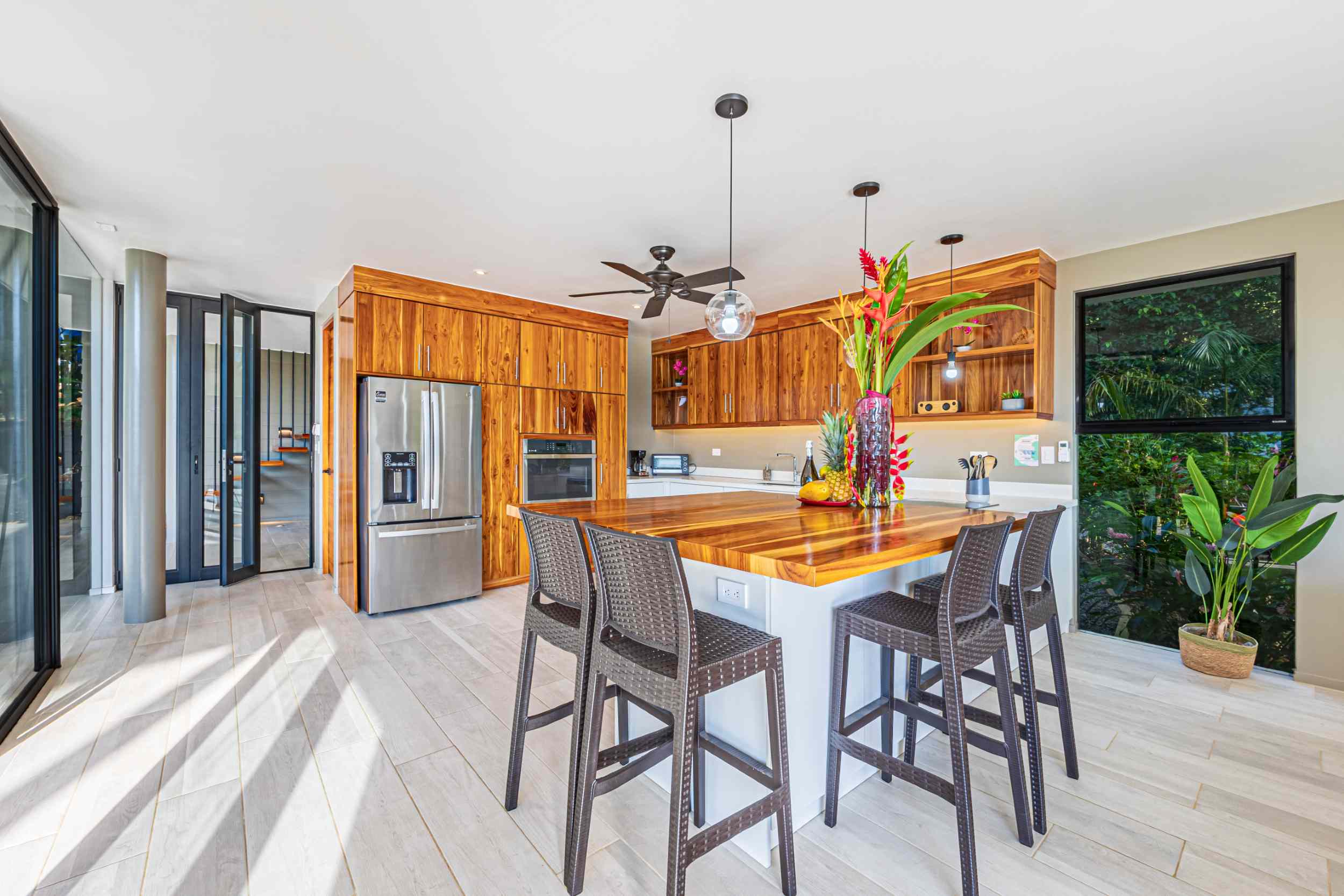 Step inside to a fully furnished interior adorned with custom hardwood accents, elegant tile flooring throughout, and modern amenities. The expansive main floor boasts a gourmet kitchen with a full-sized oven, gas cooktop, refrigerator, microwave, toaster, coffee maker, and blender—ideal for preparing exquisite meals. Relax in the living area with large flat-screen LED TVs, or dine al fresco on sun decks with panoramic jungle and ocean vistas.
