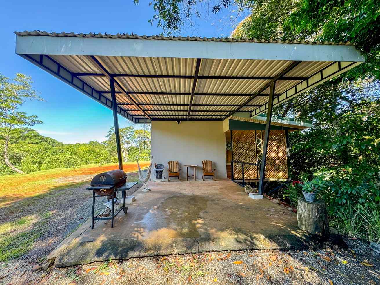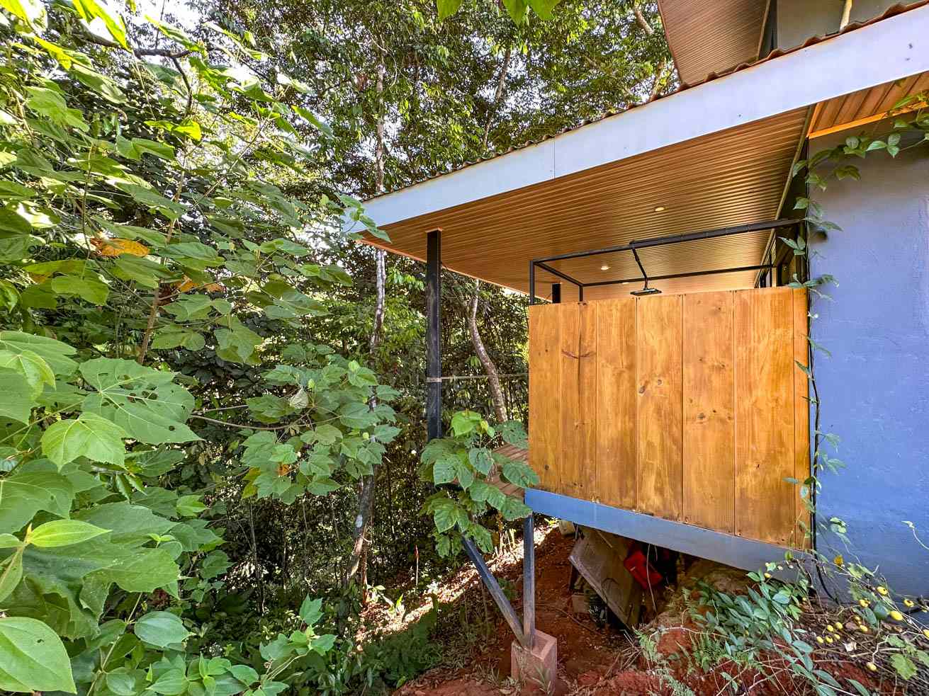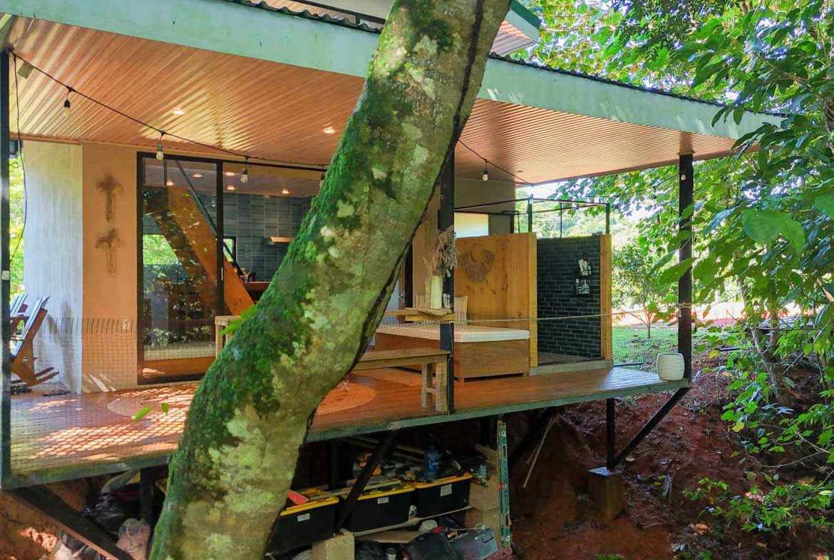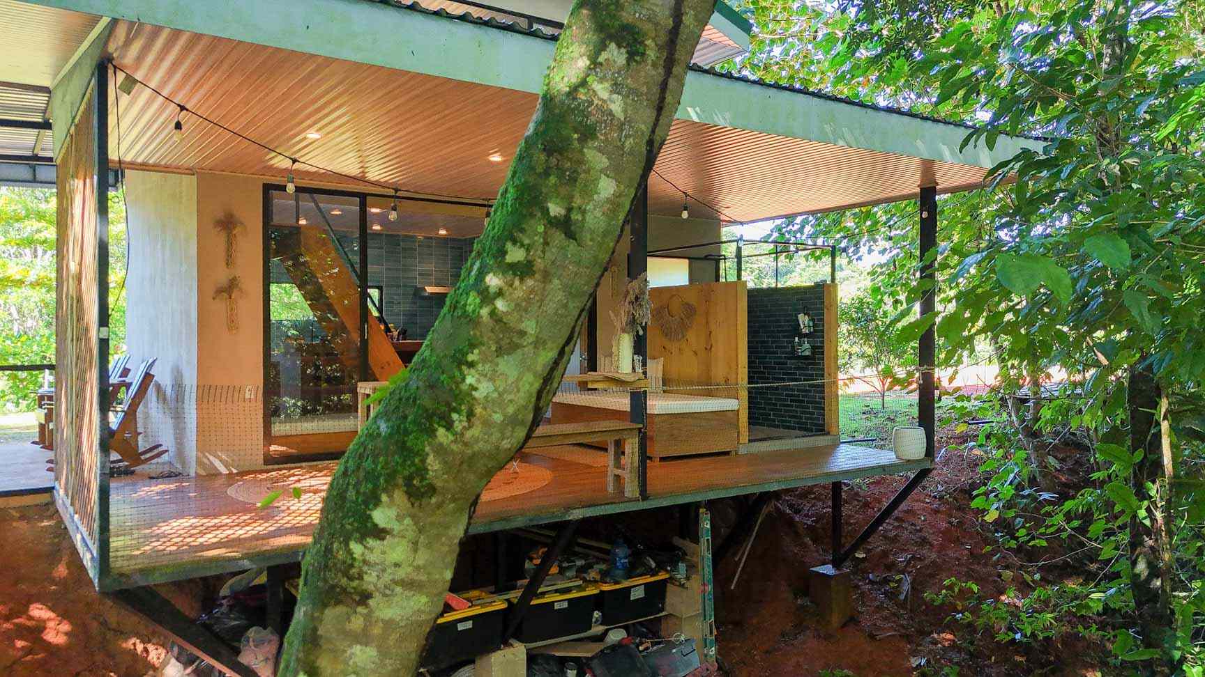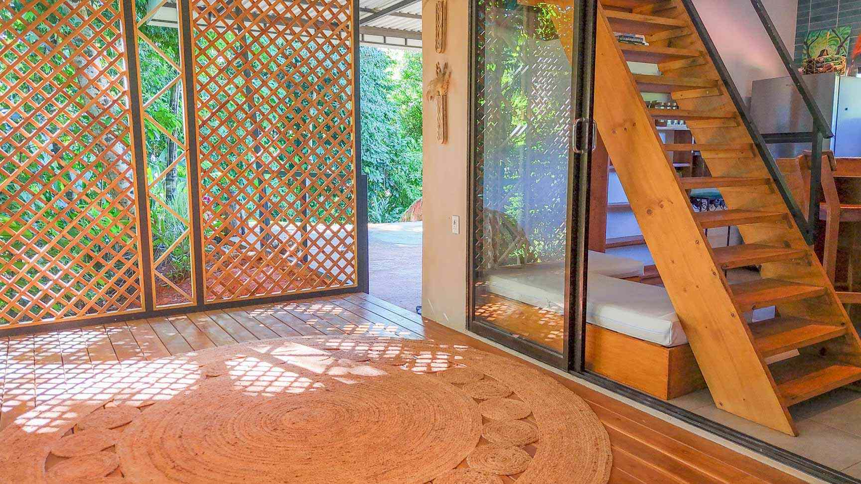 The ascending driveways terminates at a carport which is attached to the house, ensuring an always-dry passage. The entrance is located at the back, adjacent to the beautiful timber patio which looks straight into the forest that descends towards the nearby river valley. The ground level includes a fully equipped kitchen, bathroom, and laundry/storage room. In a twist of brilliant design, the shower sits in the patio and gives a full jungle view! A staircase leads to the upper-level bedroom with windows that look into the jungles on both ends of the house. But the patio is definitely the focal point of the space – two deck chairs and a hammock take full advantage of the green, tropical views and the permeating sounds of the jungle.
