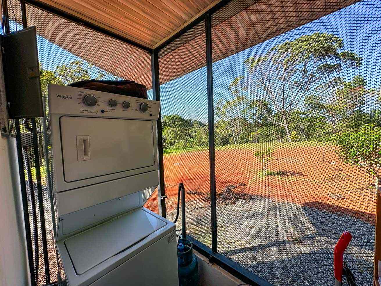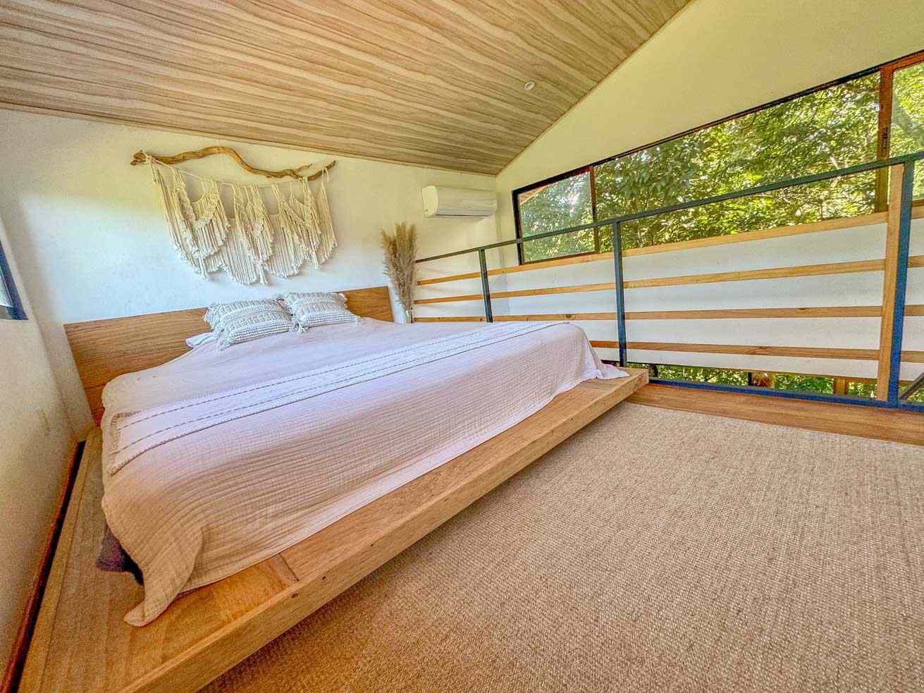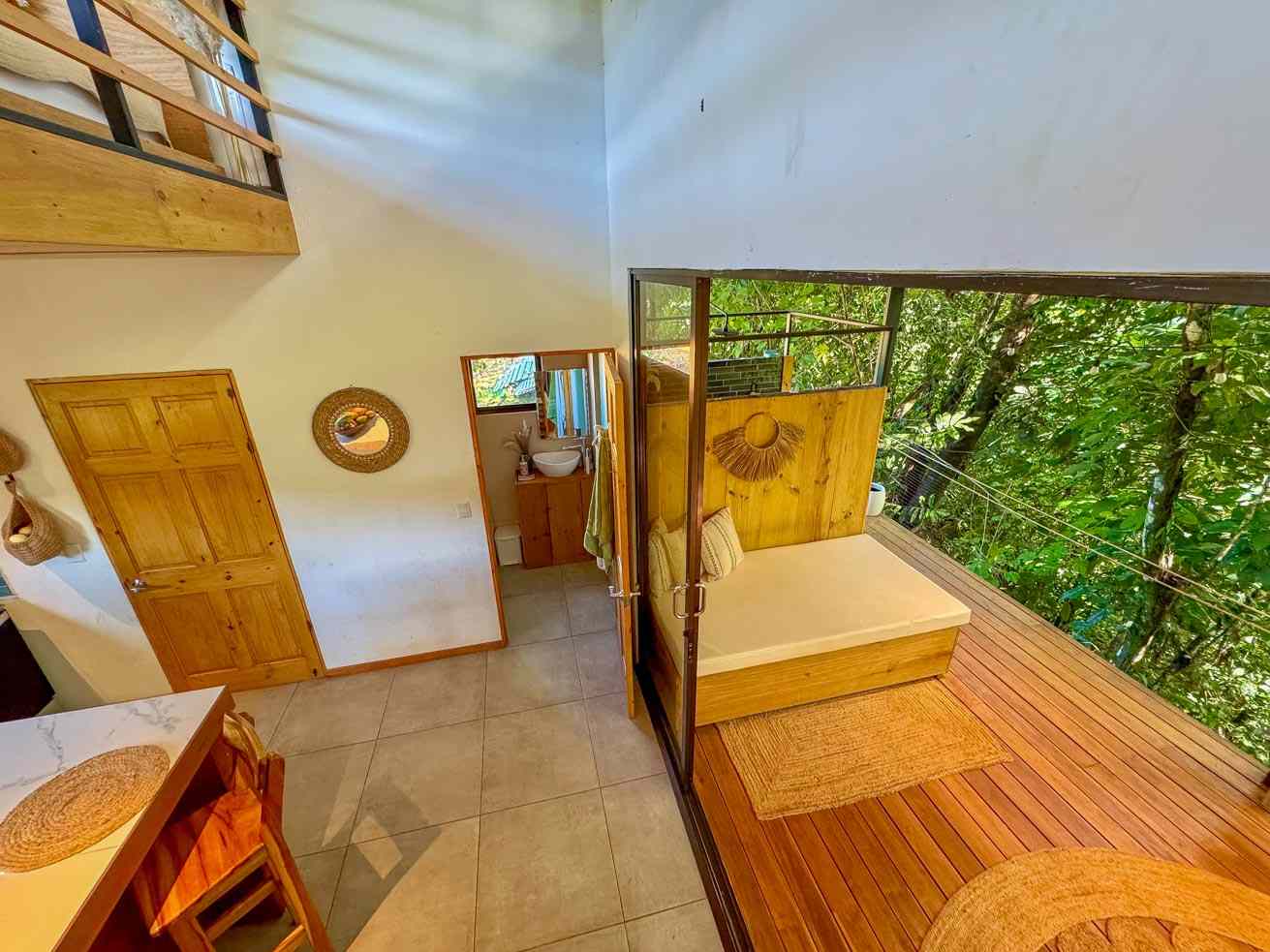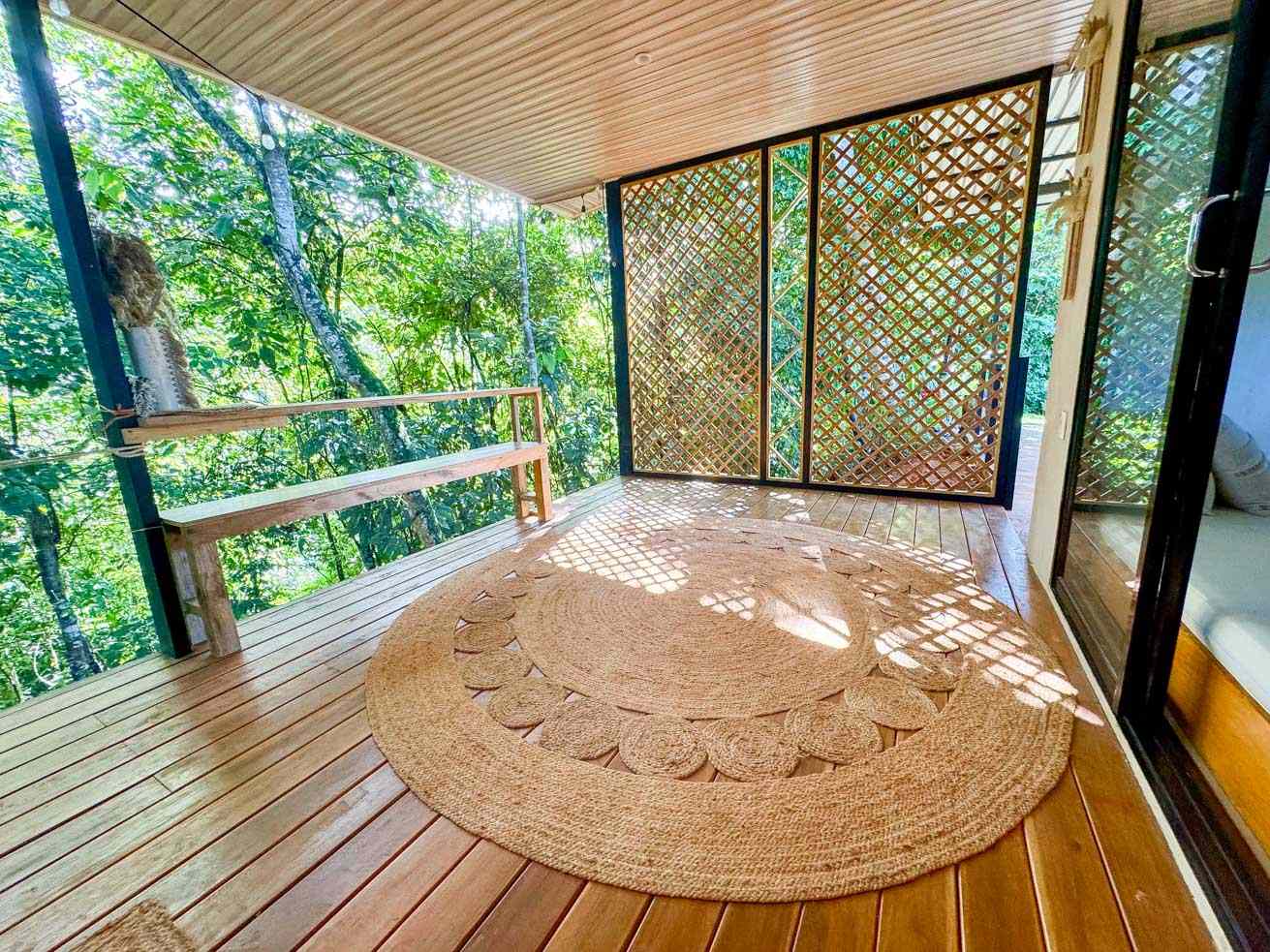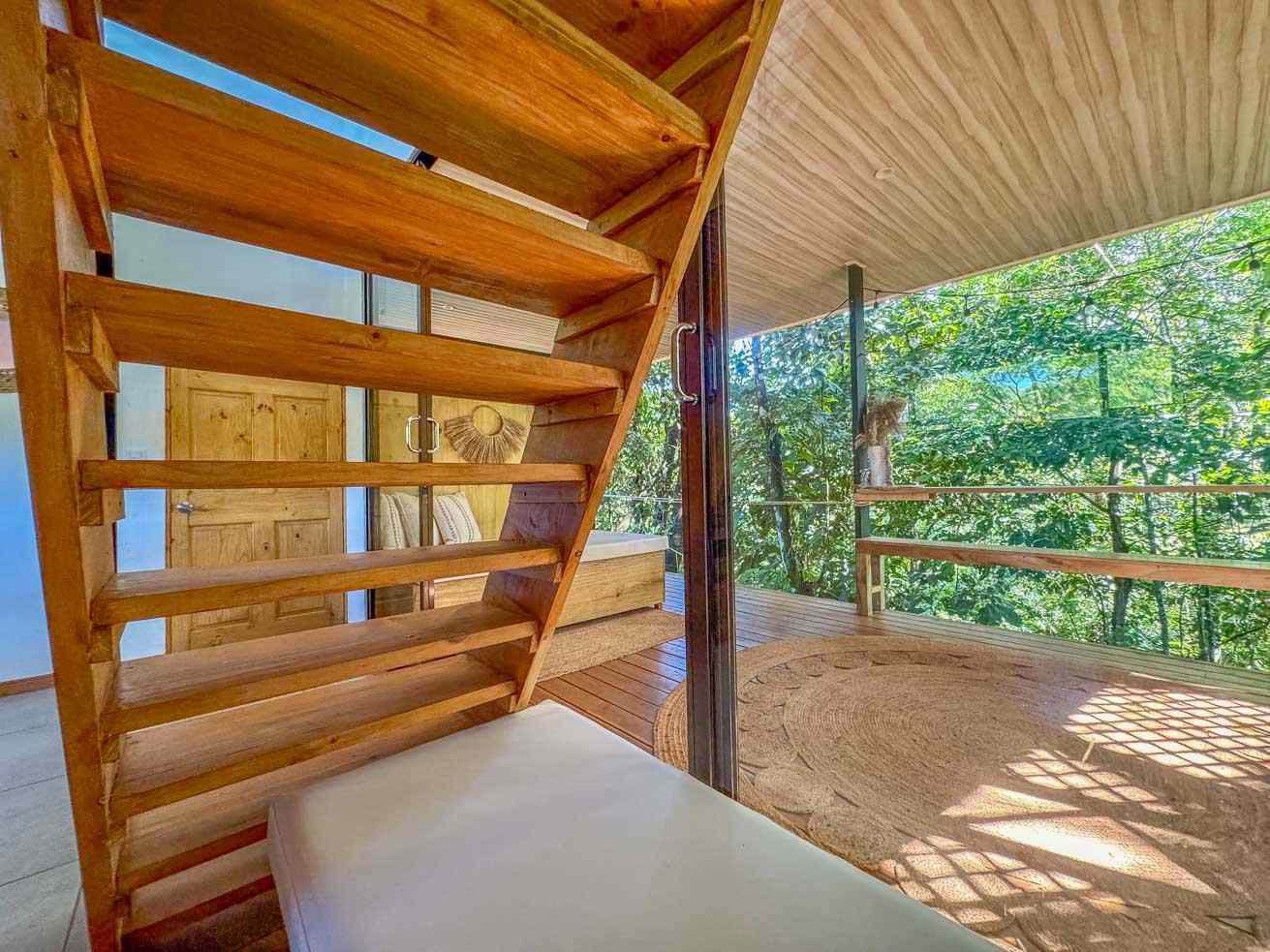 The ascending driveways terminates at a carport which is attached to the house, ensuring an always-dry passage. The entrance is located at the back, adjacent to the beautiful timber patio which looks straight into the forest that descends towards the nearby river valley. The ground level includes a fully equipped kitchen, bathroom, and laundry/storage room. In a twist of brilliant design, the shower sits in the patio and gives a full jungle view! A staircase leads to the upper-level bedroom with windows that look into the jungles on both ends of the house. But the patio is definitely the focal point of the space – two deck chairs and a hammock take full advantage of the green, tropical views and the permeating sounds of the jungle.