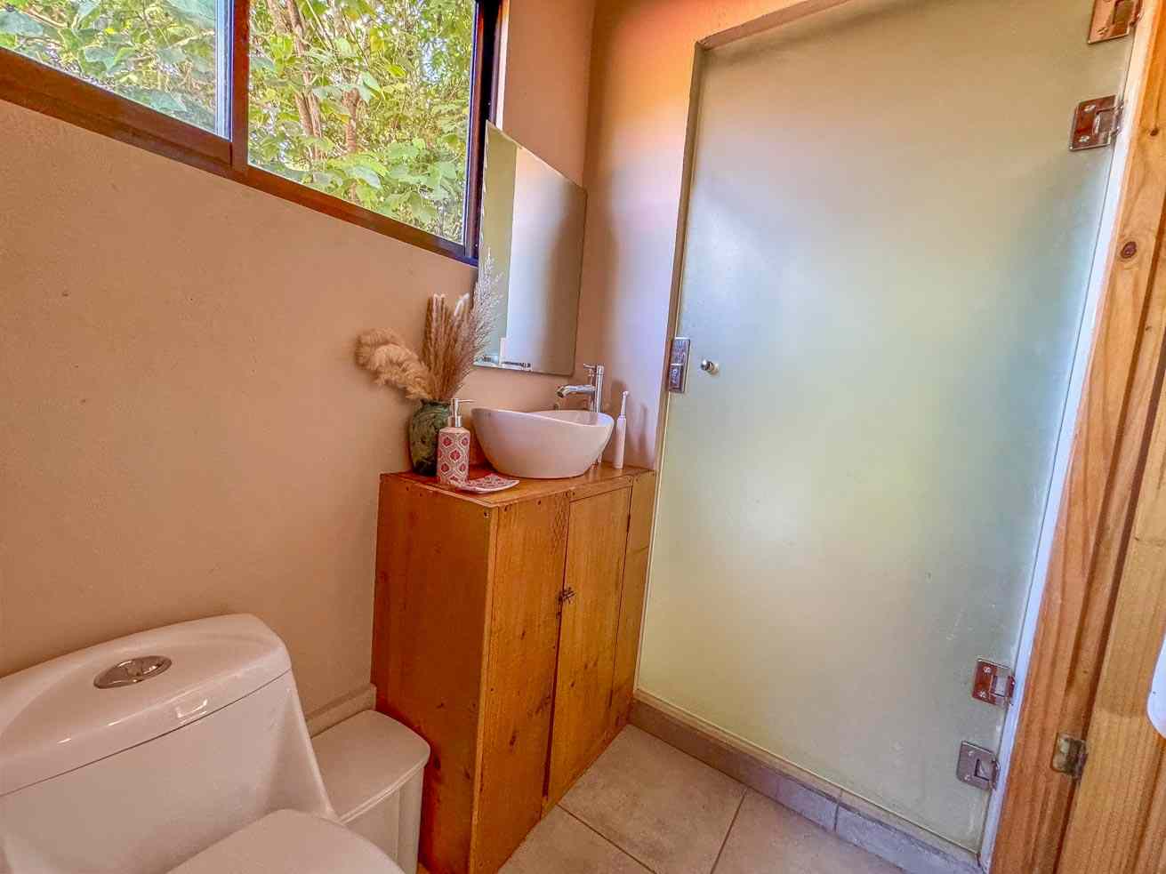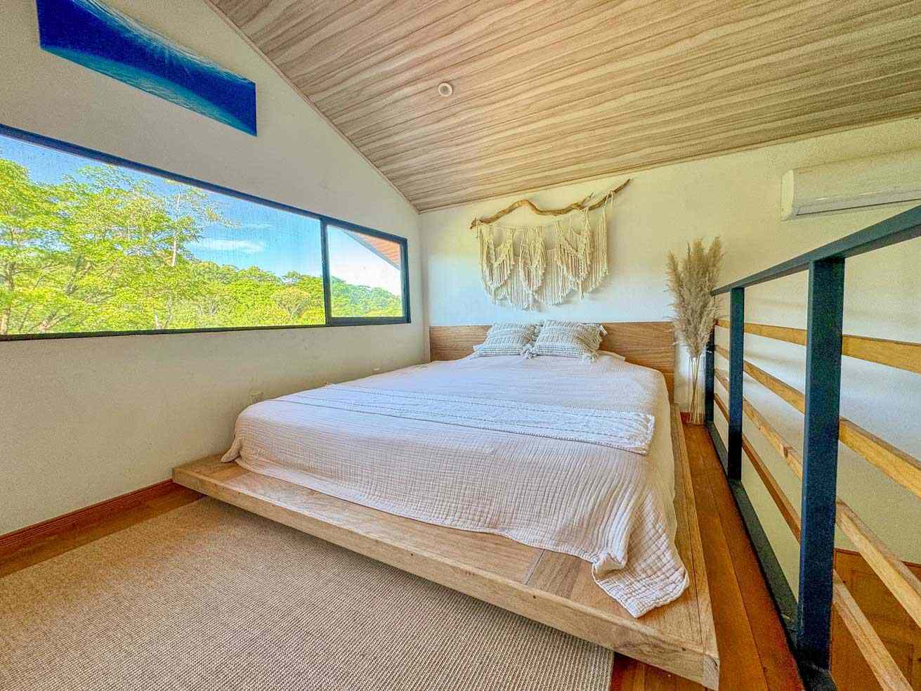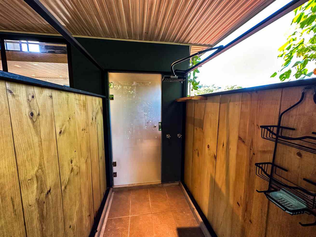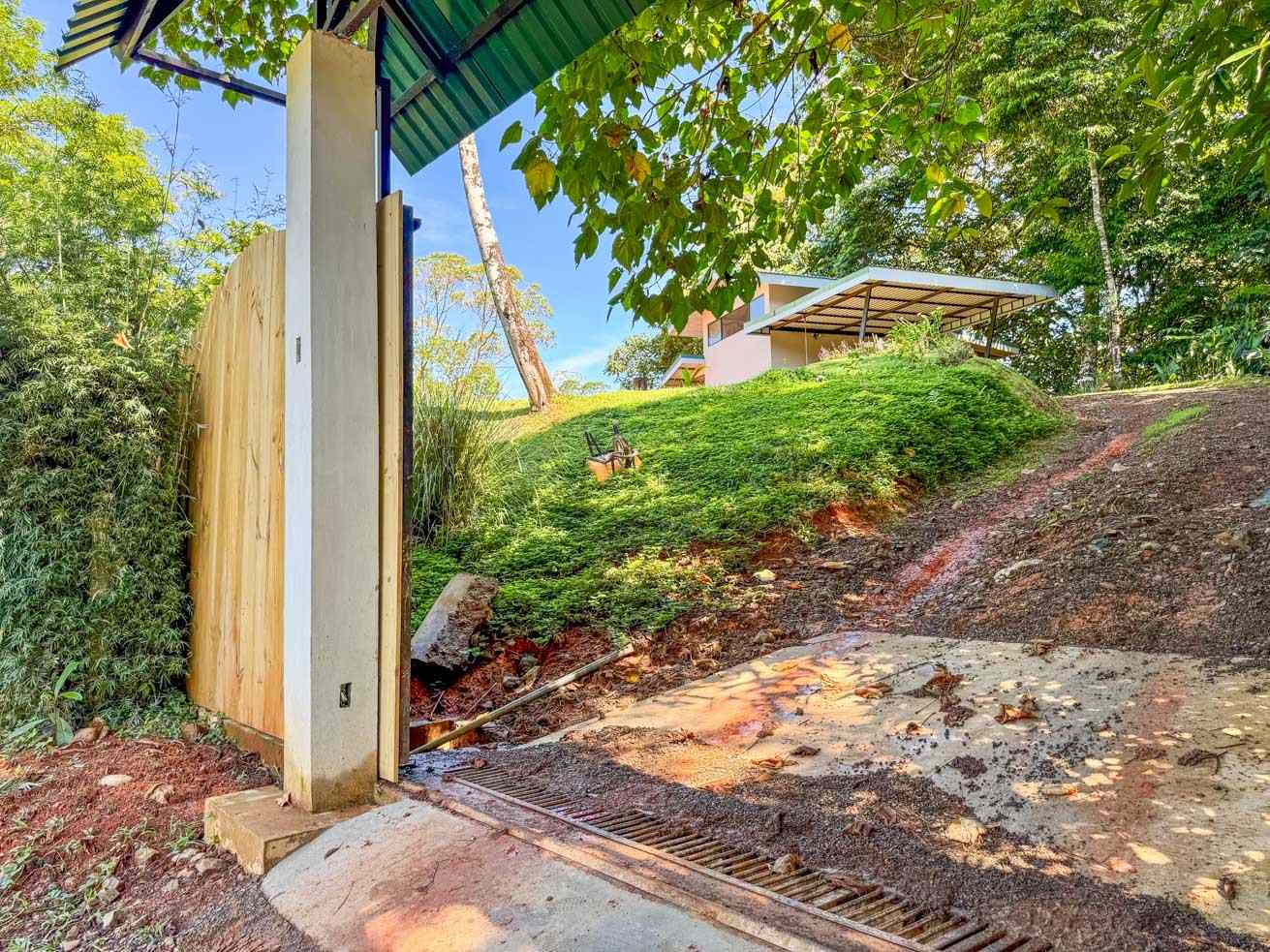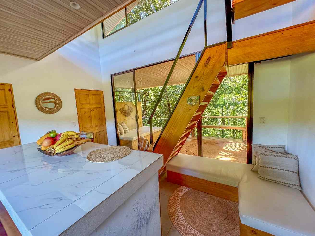 The ascending driveways terminates at a carport which is attached to the house, ensuring an always-dry passage. The entrance is located at the back, adjacent to the beautiful timber patio which looks straight into the forest that descends towards the nearby river valley. The ground level includes a fully equipped kitchen, bathroom, and laundry/storage room. In a twist of brilliant design, the shower sits in the patio and gives a full jungle view! A staircase leads to the upper-level bedroom with windows that look into the jungles on both ends of the house. But the patio is definitely the focal point of the space – two deck chairs and a hammock take full advantage of the green, tropical views and the permeating sounds of the jungle.