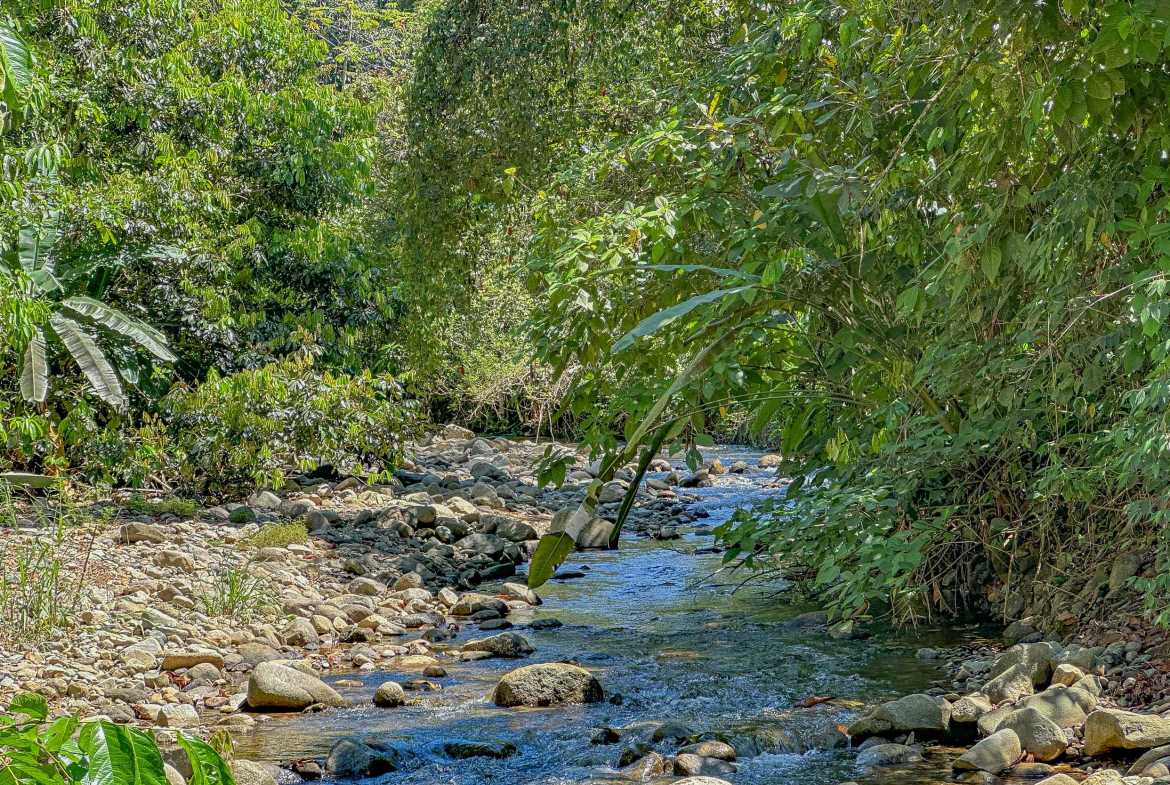 This green, hilly and tree-covered property is accessed via a prepared public road a short distance from the costanera, giving a full 250m of public road frontage. And while modern world comforts are just around the corner, the land is an oasis of serenity, greenery, and tropical nature. River Media Luna, a clear mountain creek that flows year-round, snakes her way around the borders of the property giving a full 160 meters of river frontage.