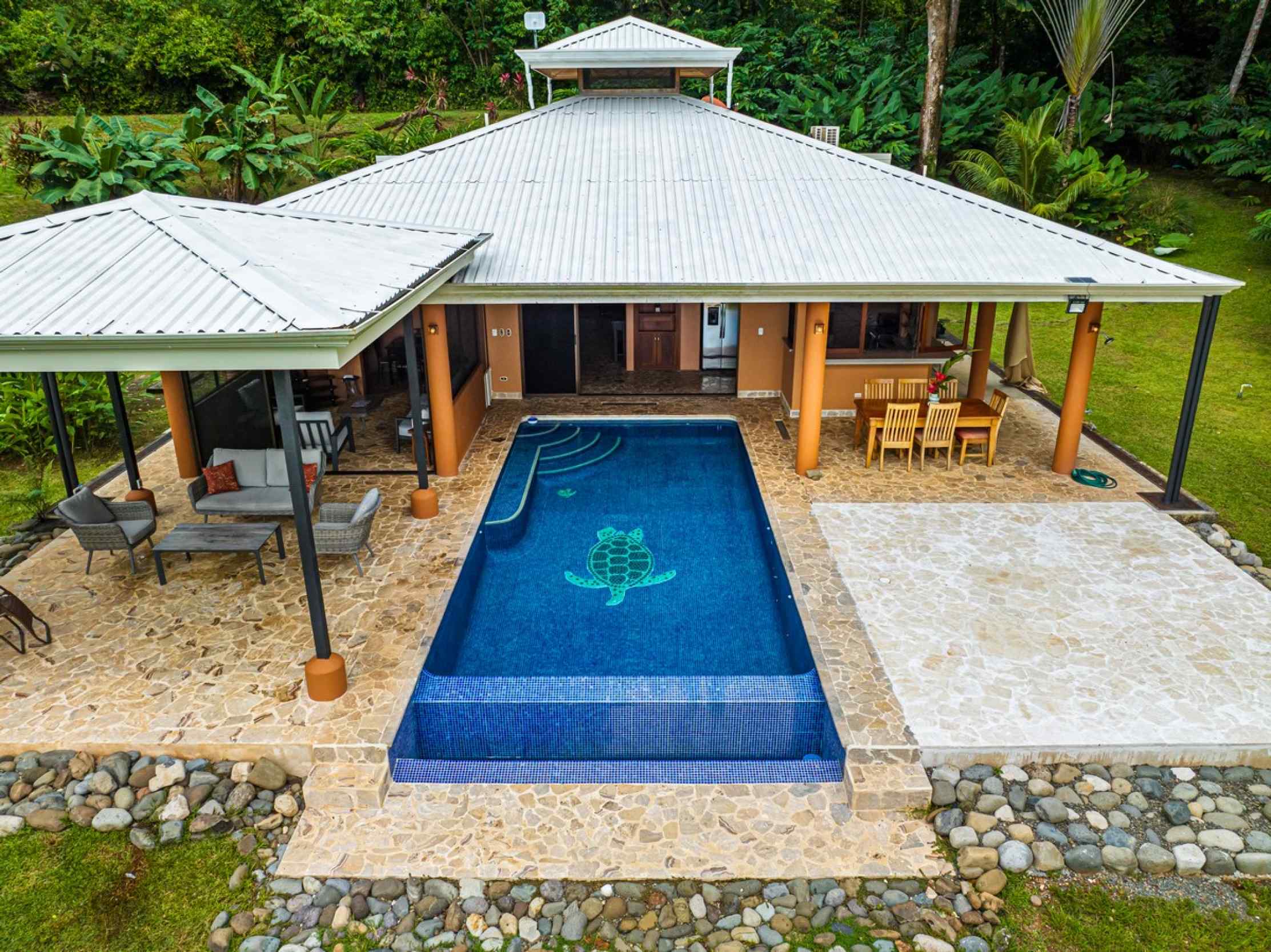 You will immediately notice the high-quality construction and finishes throughout. Step inside and be captivated by the beautiful and airy atmosphere created by the high, local-wood ceilings and solid wood furnishings which bring a bit of Costa Rican class to the interior. The home features 3 spacious bedrooms and 2 full bathrooms. Air conditioning in the master bedroom ensures year-round comfort if you need a little break from a busy day exploring or for your sleeping comfort. One thoughtful feature here in the tropics is the dehumidified master closet and the pantry to keep your clothing and food safe and healthy. The home also includes a solar panel system that provides a big reduction in your electrical bill, paying dividends to your pocketbook every month.