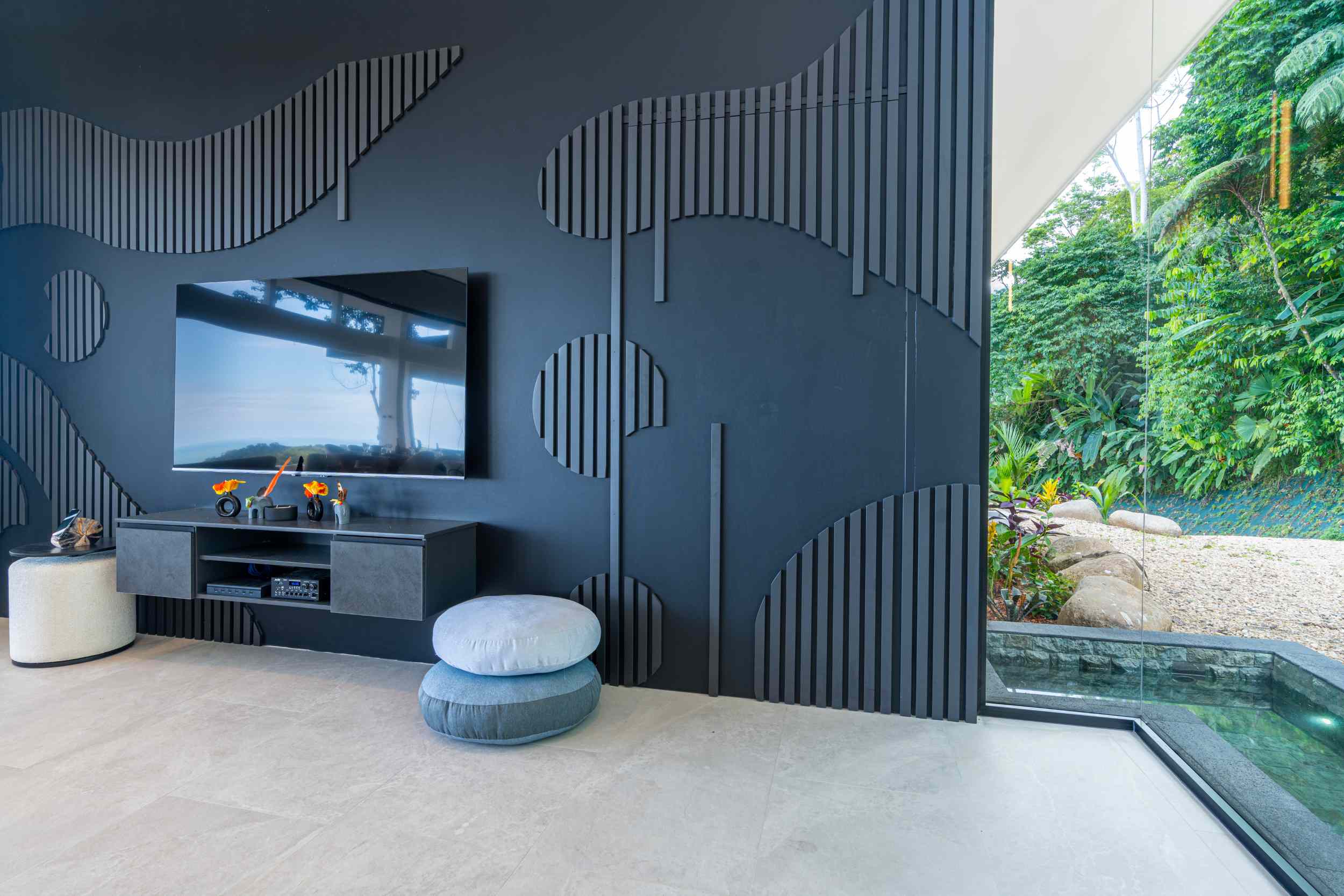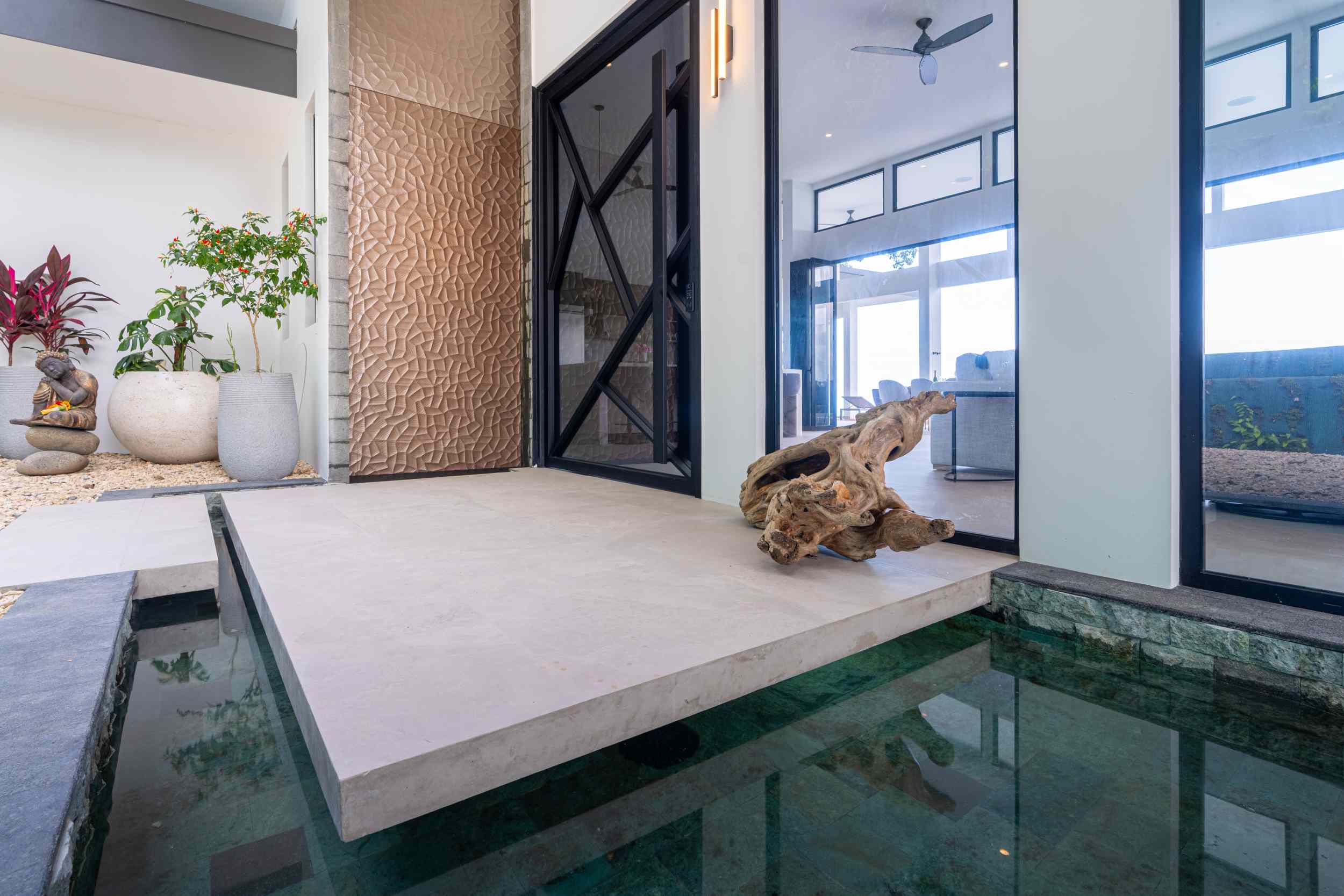 - Earth anchors the home in lush tropical gardens and ancient trees that whisper with the wind.