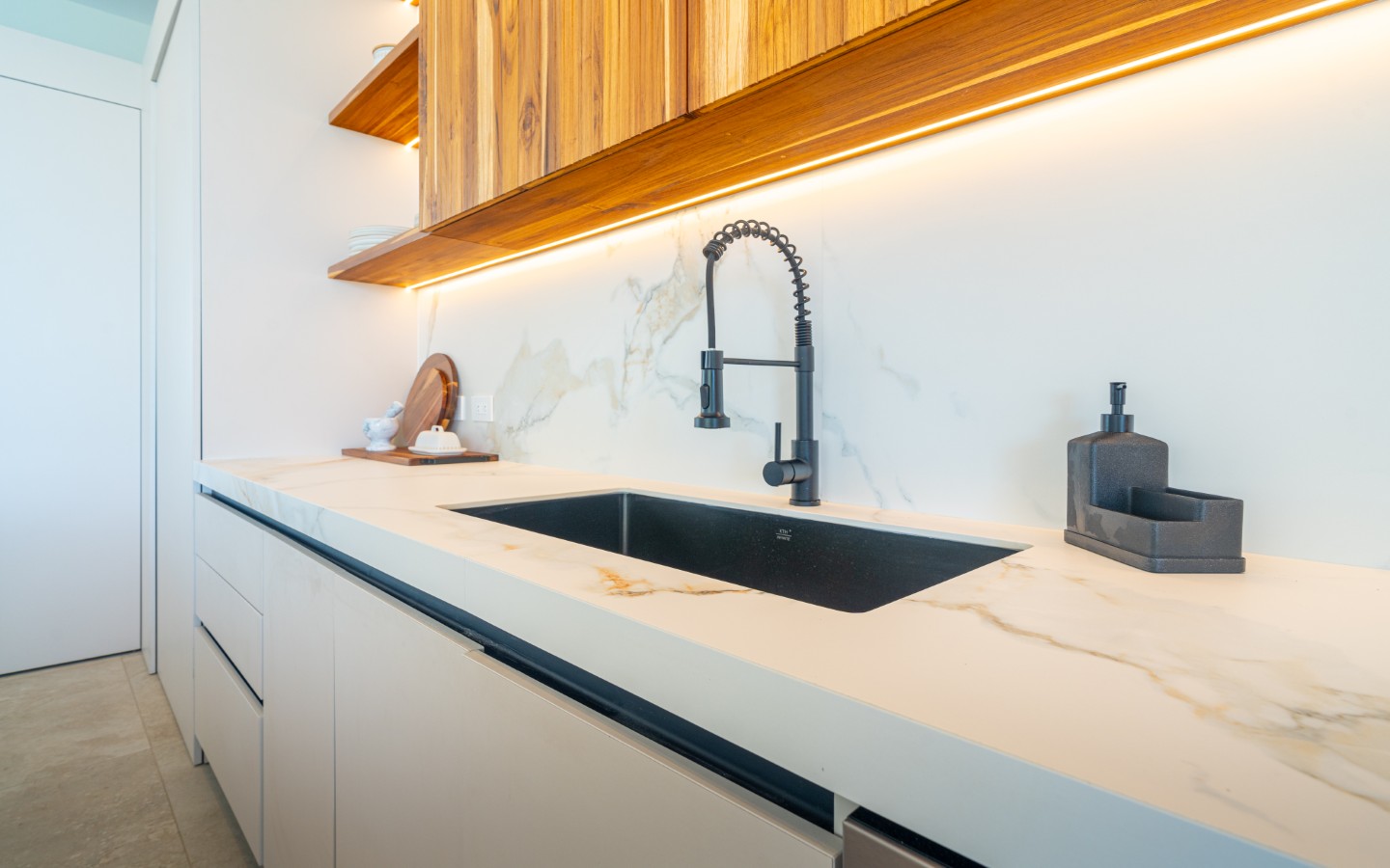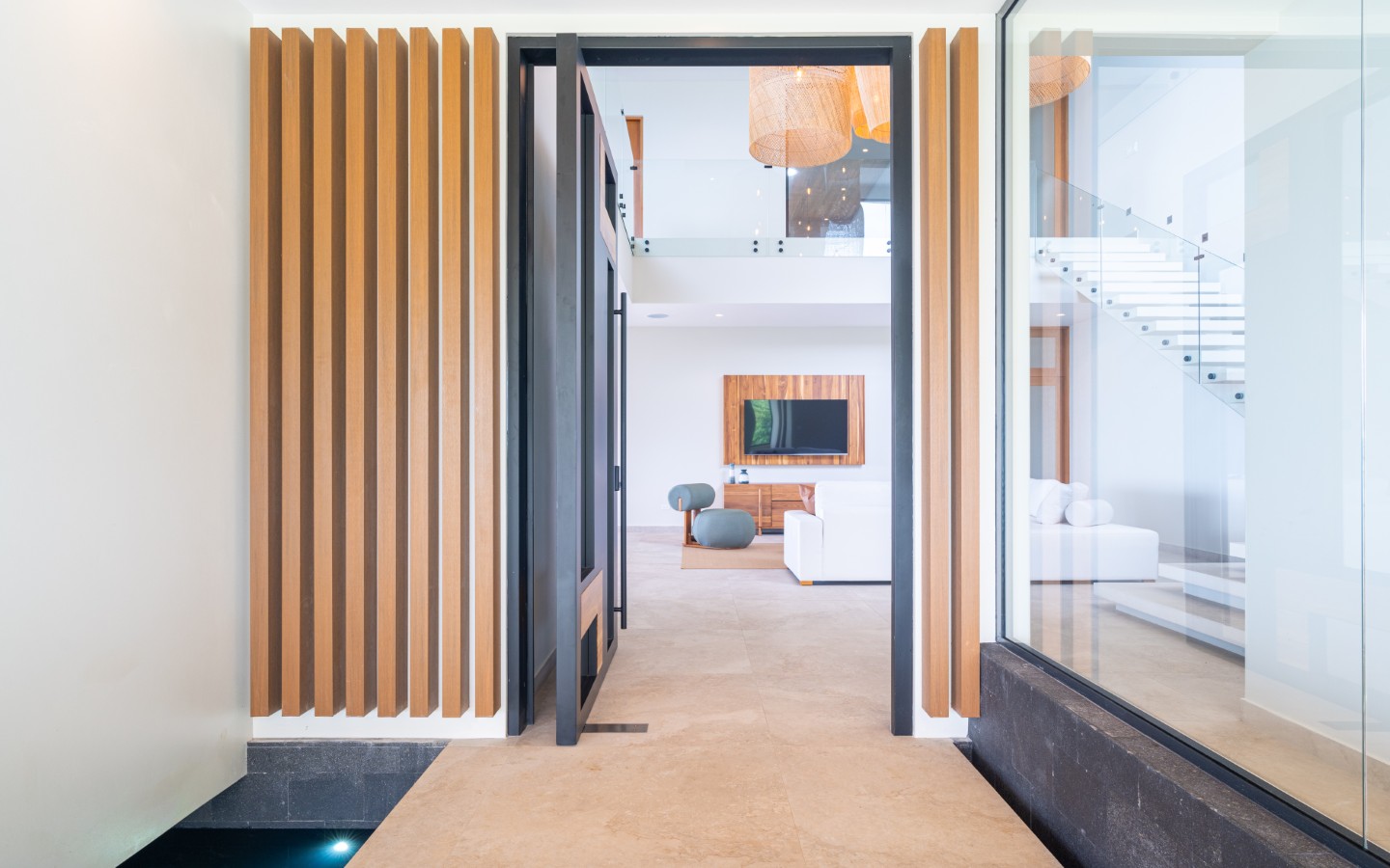 A custom pivoting steel door opens to a shimmering pond water feature, a tranquil prelude to the wonders within. The floating staircase, masterfully crafted elevates you into the expansive residence. From the moment you step inside, the villa reveals its artistry: entire walls of custom fabricated minimalist glass retract to erase boundaries, uniting the refined interiors with the sweeping deck, the infinity-edge saltwater pool, and the endless horizon of the Pacific Ocean.