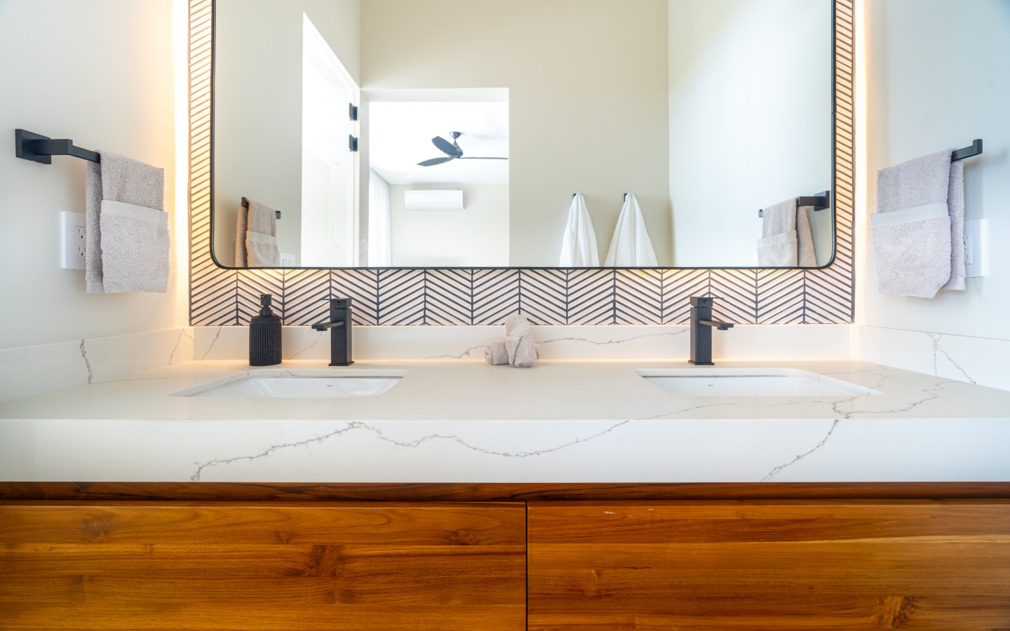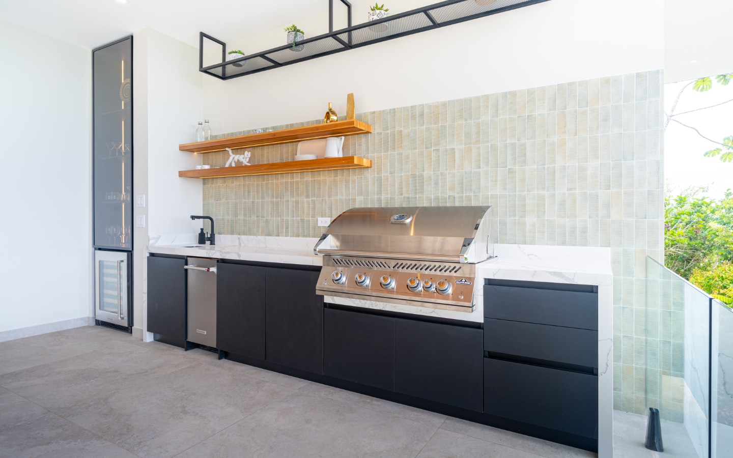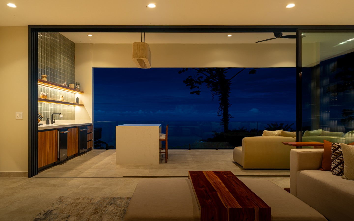 Every surface tells a story of excellence. Spanish anti-slip tile floors provide elegance and comfort underfoot. Electric custom shades move with quiet precision. At night, an LED lighting system transforms the home into a constellation of light, glowing softly against the rainforest backdrop.