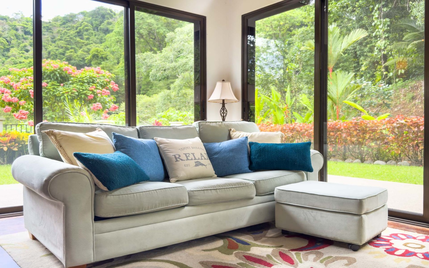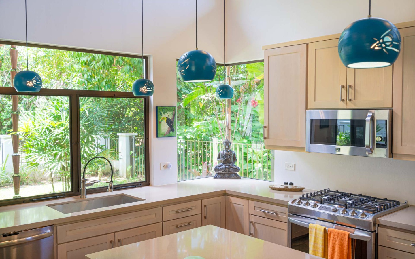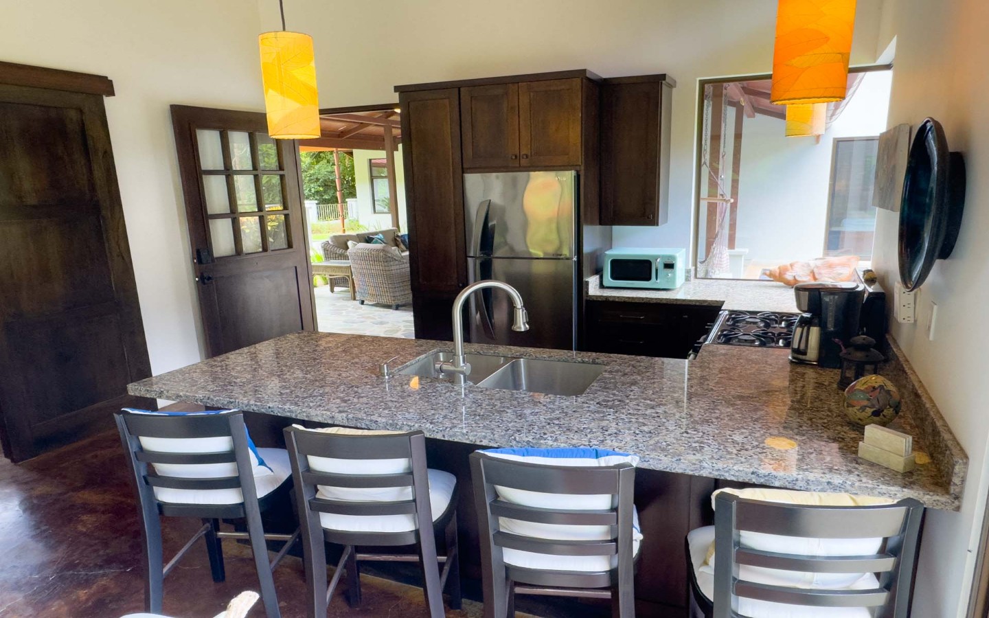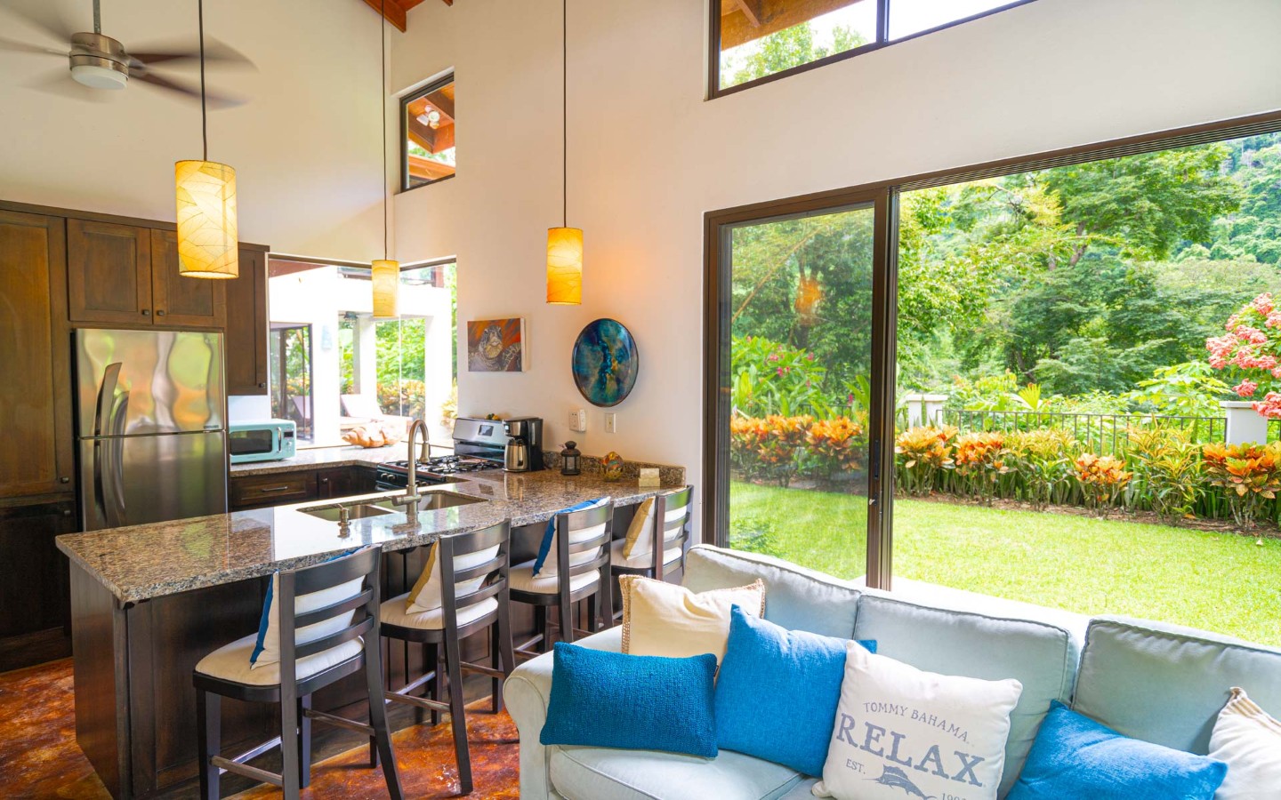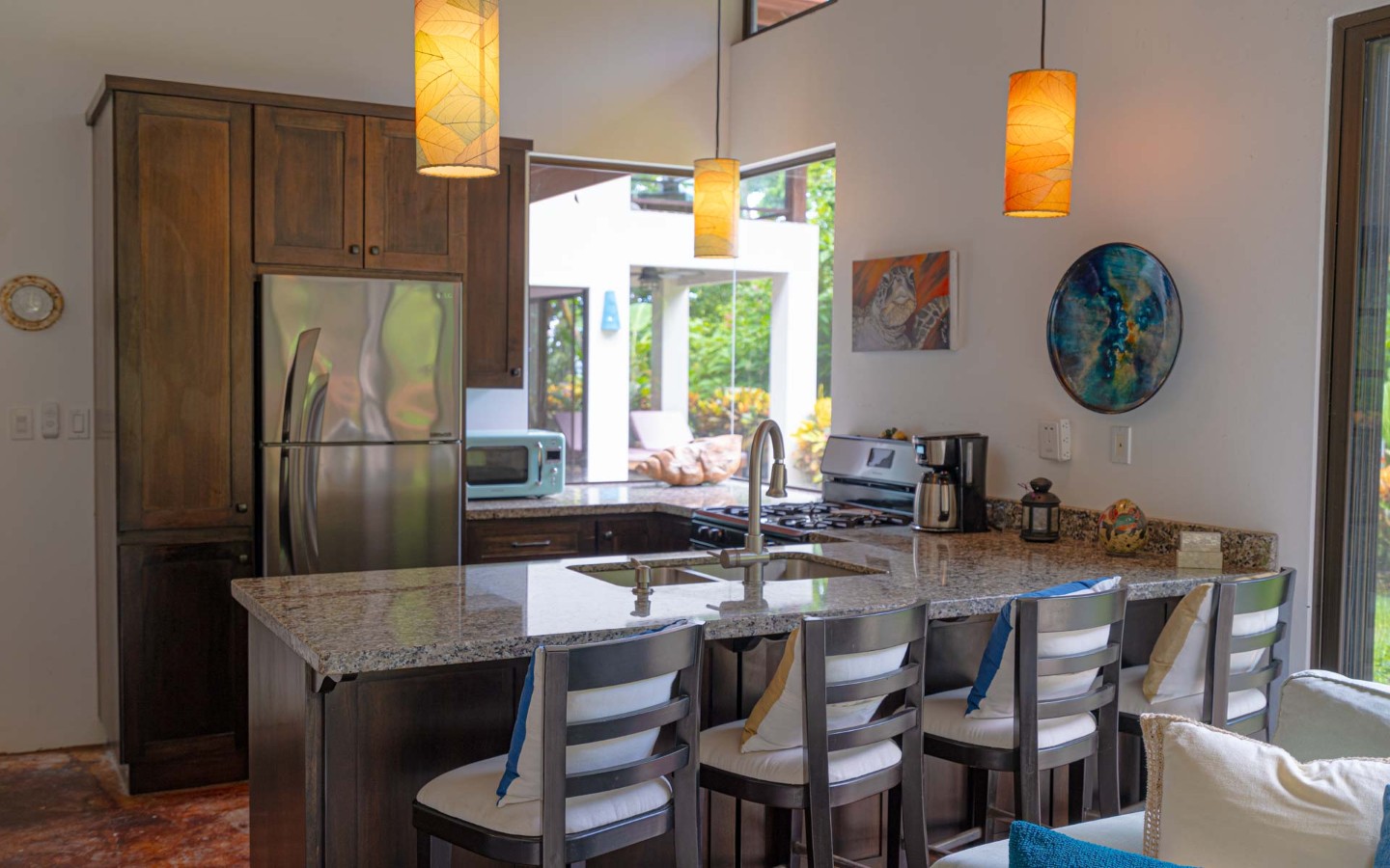 - Unique Decor: Beautiful hardwoods, custom light fixtures, colorful local art, and stunning river rock tile flooring throughout the main home and walkways.