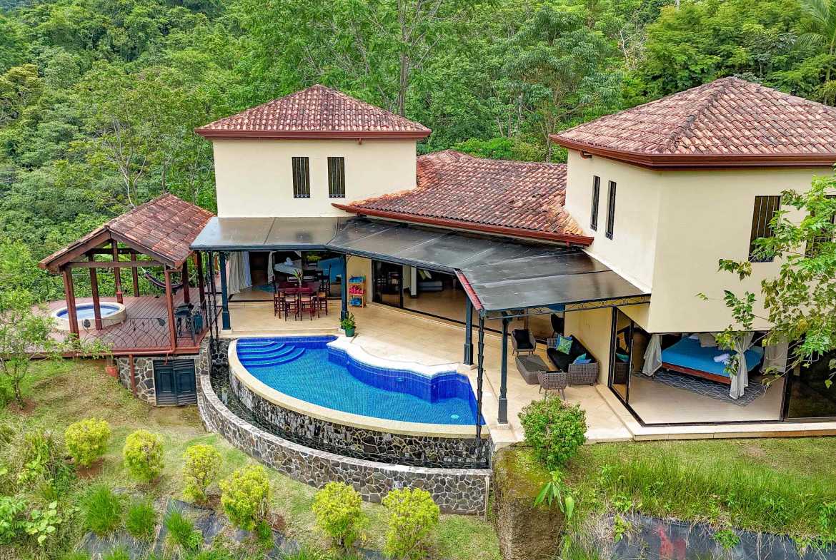 THE MAIN HOUSE The main house is an architectural masterpiece of quality design and a true ‘castle in the jungle’ (just look at the aerial photos)! Made of solid concrete construction and incorporating high vaulted ceilings, the single level luxury home holds 4 private bedrooms – each with king canopy bed and en-suite full bathroom plus 1 shared bath and a large central kitchen / dining / lounge area which opens up into the covered patio, attached ranchito and million-dollar views. And here is where you find the refreshing infinity pool, jacuzzi, BBQ, and outdoor dining and lounge areas. The house takes full advantage of its magnificent location, with every room having a unique spectacular view. The waterfall can be seen and heard from the house. Each room is air-conditioned and is provided with outdoor access so that the splendid natural views are just a few steps away. An extra-large 2.5-car drive-through garage contains a large bodega, so storage will never be a problem. The home is a successful 5-star Airbnb property – its excellent income-generating history can be provided upon completion of an NDA.