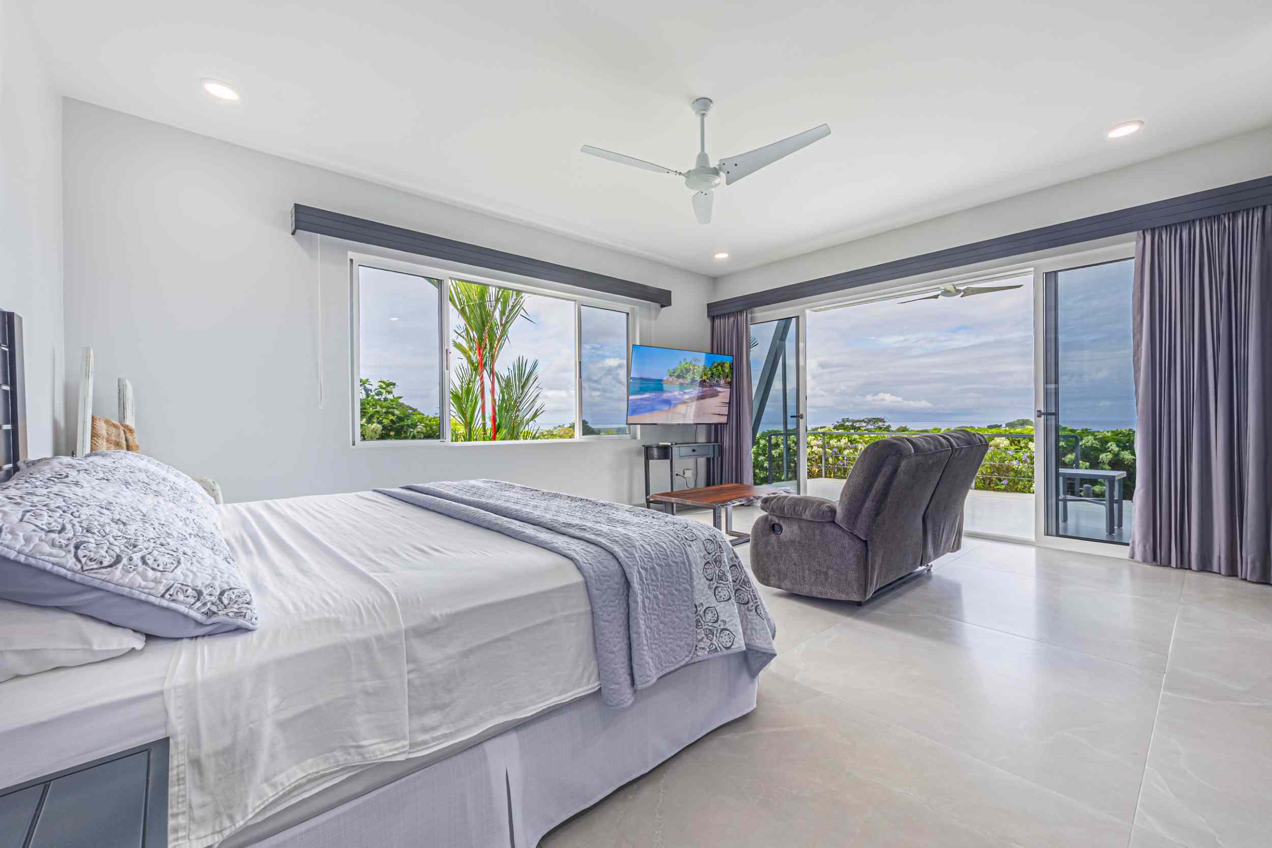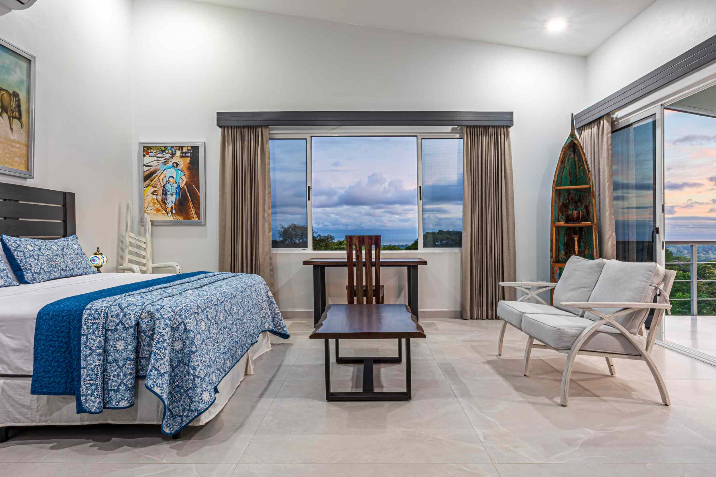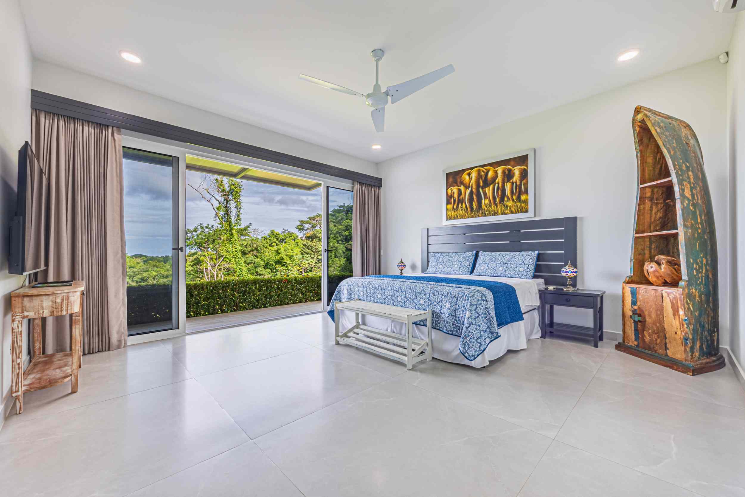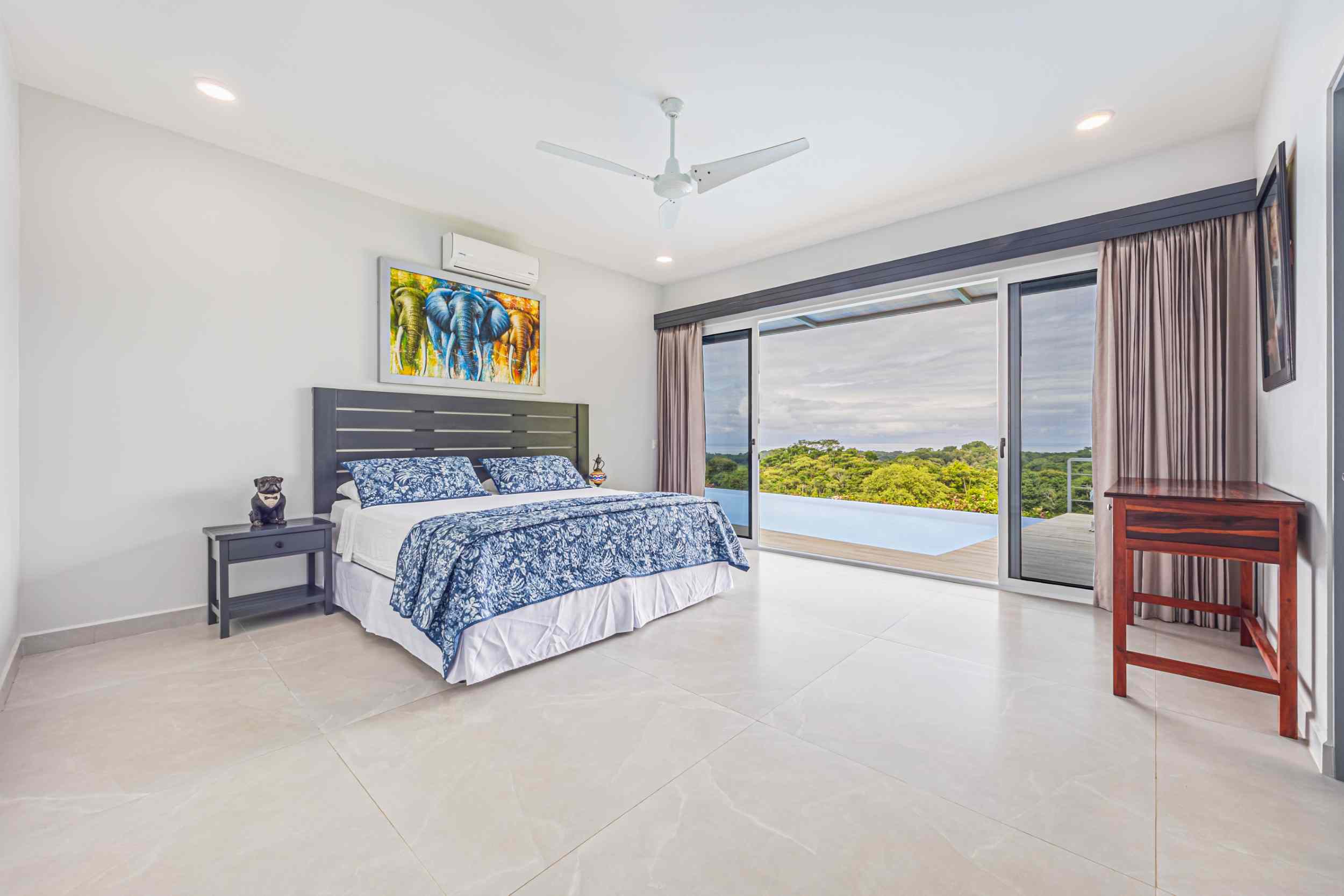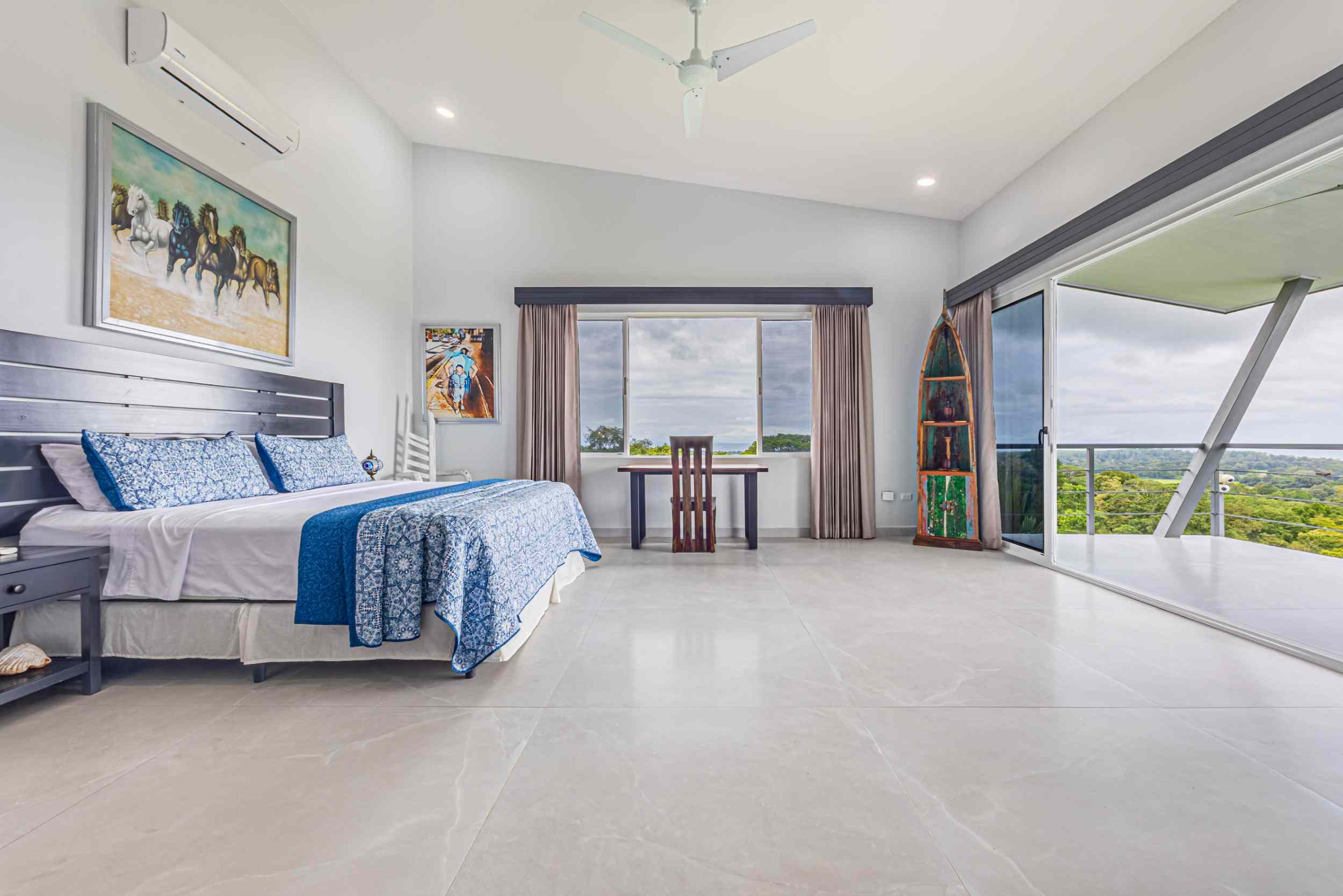 The master bedroom, a place where the weary find solace, offers a view that could only be described as divine. From the bed, you can watch the ocean’s colors shift from the soft pastels of dawn to the deep blues of midday, and finally to the fiery oranges and purples of the setting sun. Above, the fourth bedroom, with private access, provides a perch even higher than the rest, where the ocean stretches out before you, a blanket of turquoise and sapphire, dotted with the distant silhouette of Caño Island.
