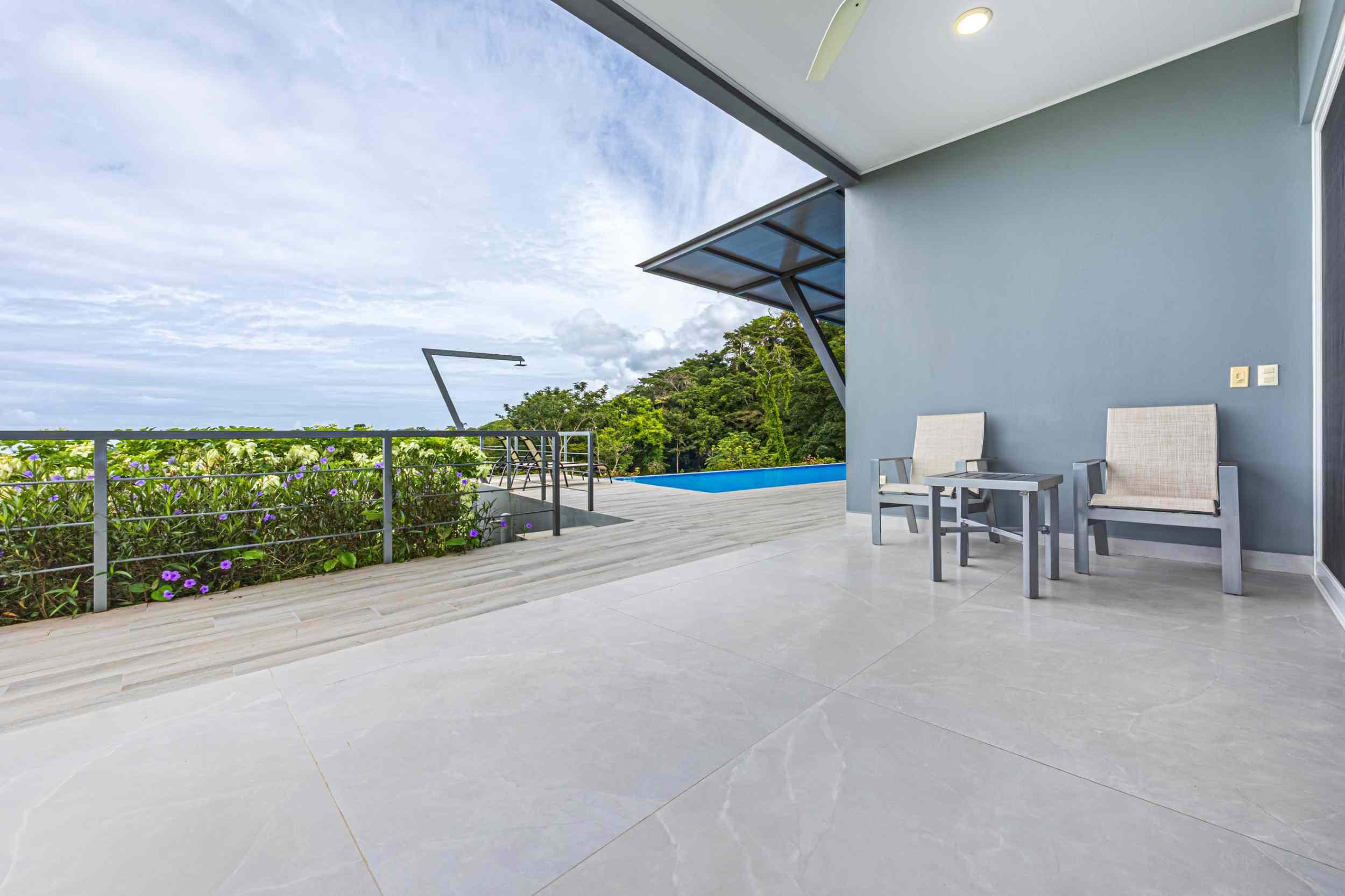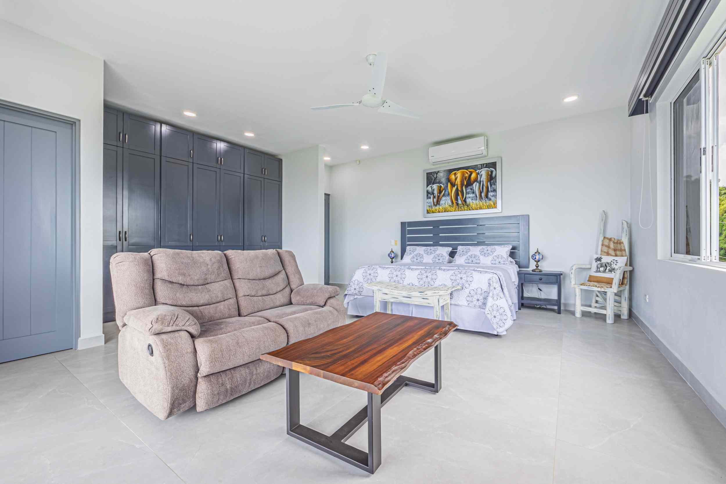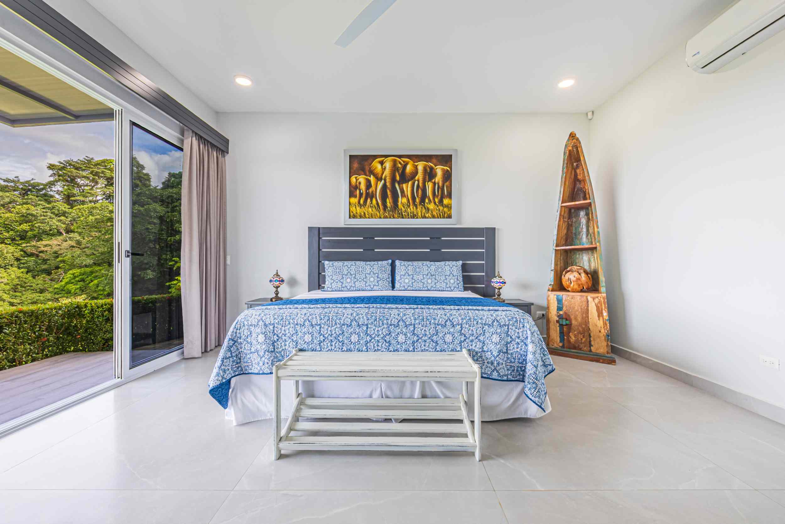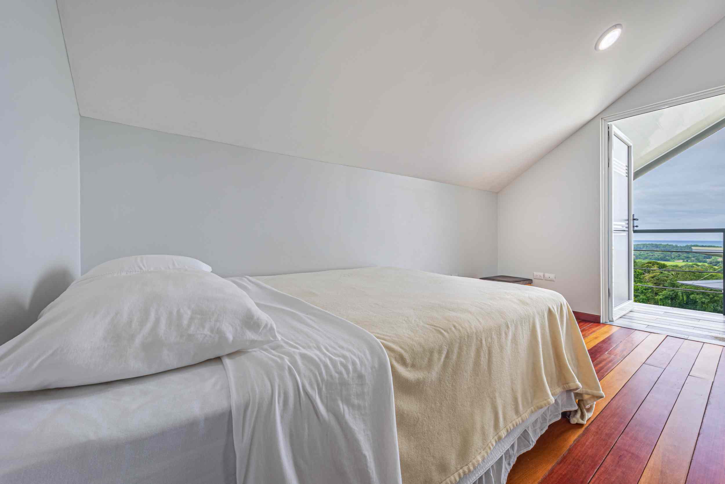 The master bedroom, a place where the weary find solace, offers a view that could only be described as divine. From the bed, you can watch the ocean’s colors shift from the soft pastels of dawn to the deep blues of midday, and finally to the fiery oranges and purples of the setting sun. Above, the fourth bedroom, with private access, provides a perch even higher than the rest, where the ocean stretches out before you, a blanket of turquoise and sapphire, dotted with the distant silhouette of Caño Island.