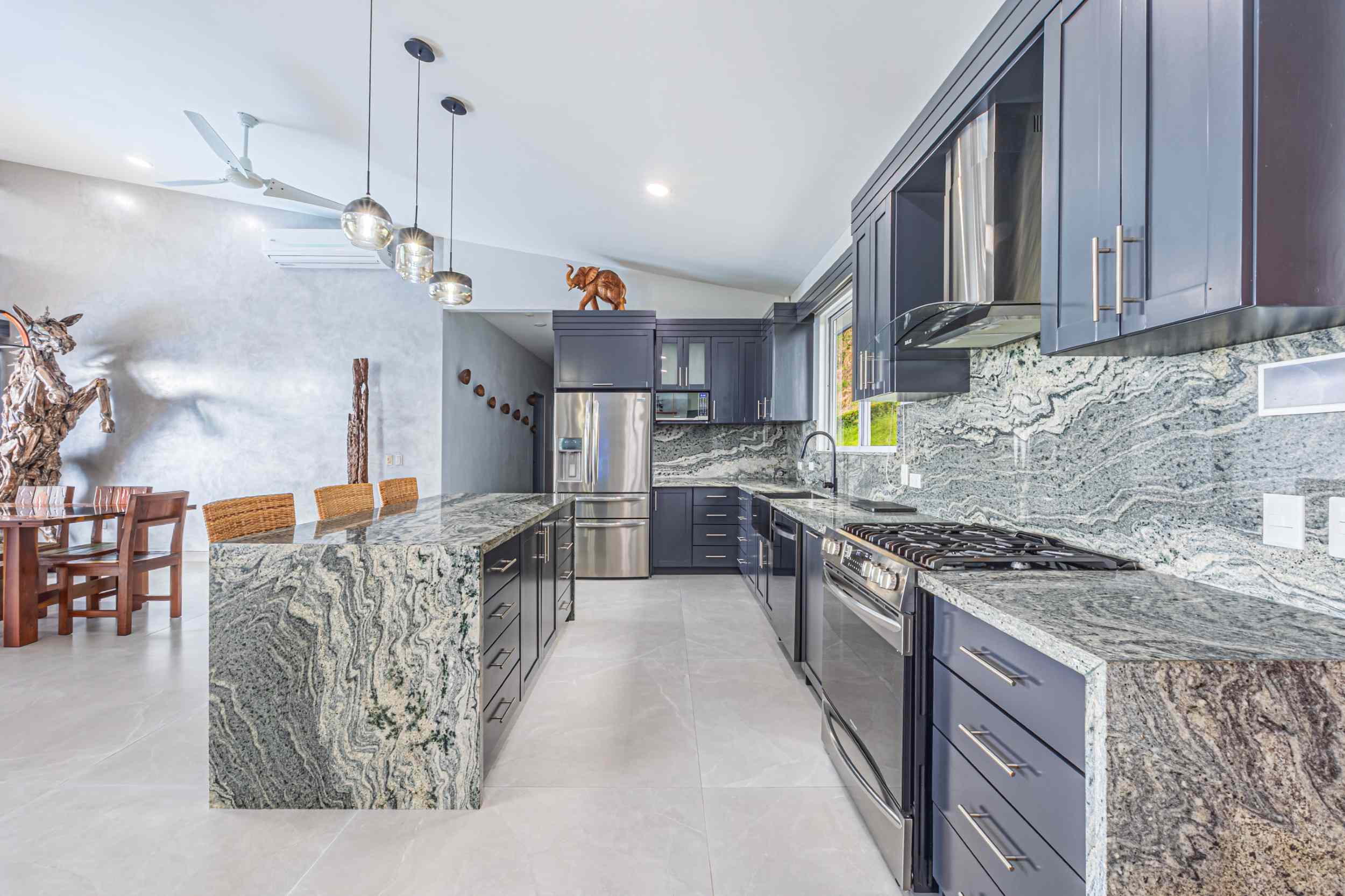 But the true magic of the home lies not just in its views, but in its connection to the land it inhabits. The custom-made furniture, the stone counters and backsplash in the chef’s dream kitchen, and the oversized island all speak to the craftsmanship that went into creating this home. The dining room, with its custom table and chairs, invites you to share meals while the ocean provides the perfect backdrop, its waves whispering tales of far-off lands and adventures yet to come.