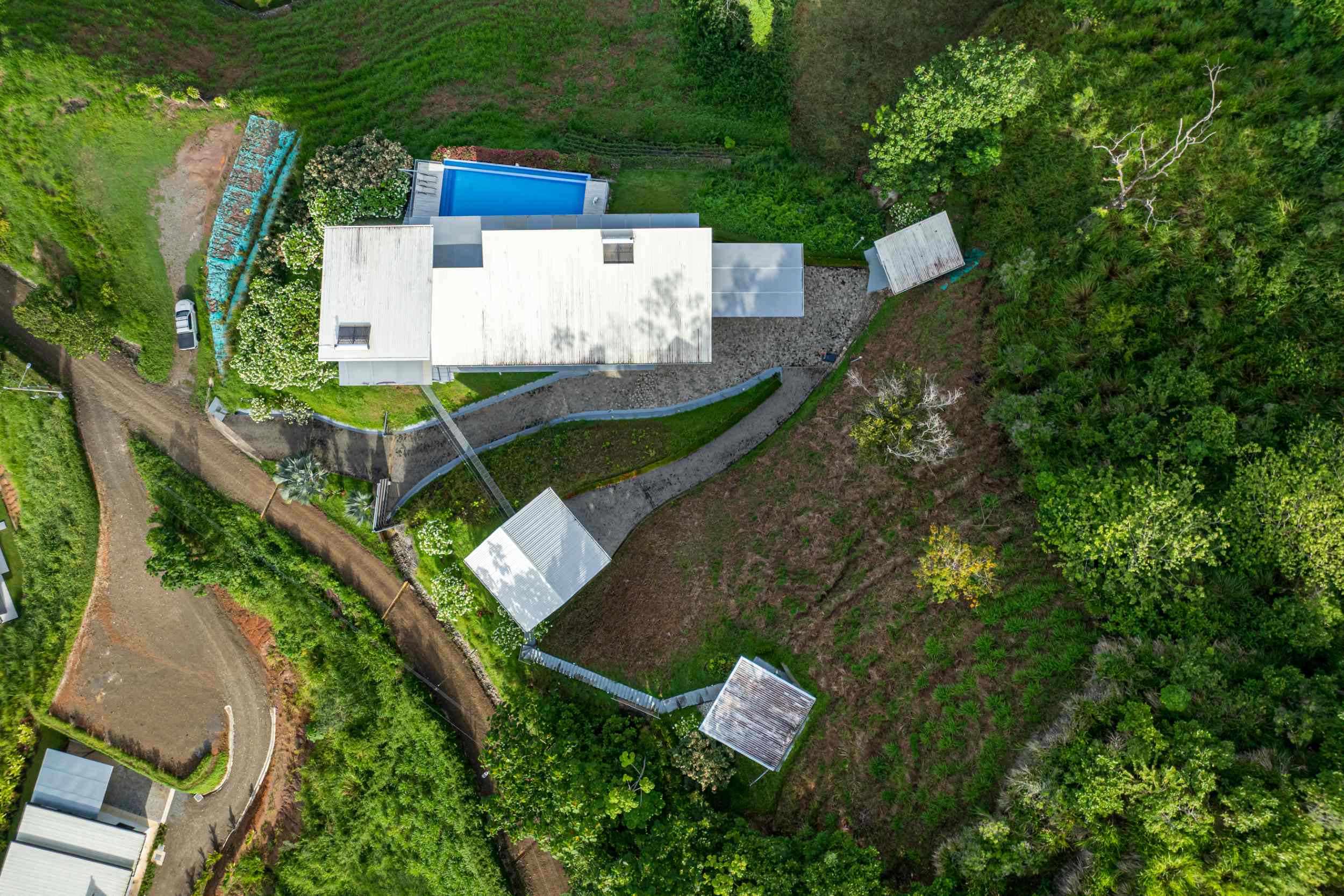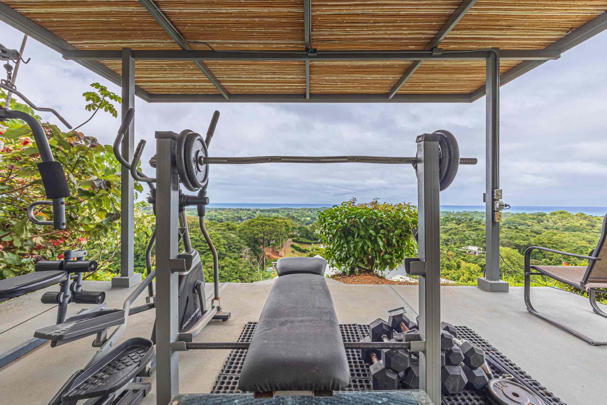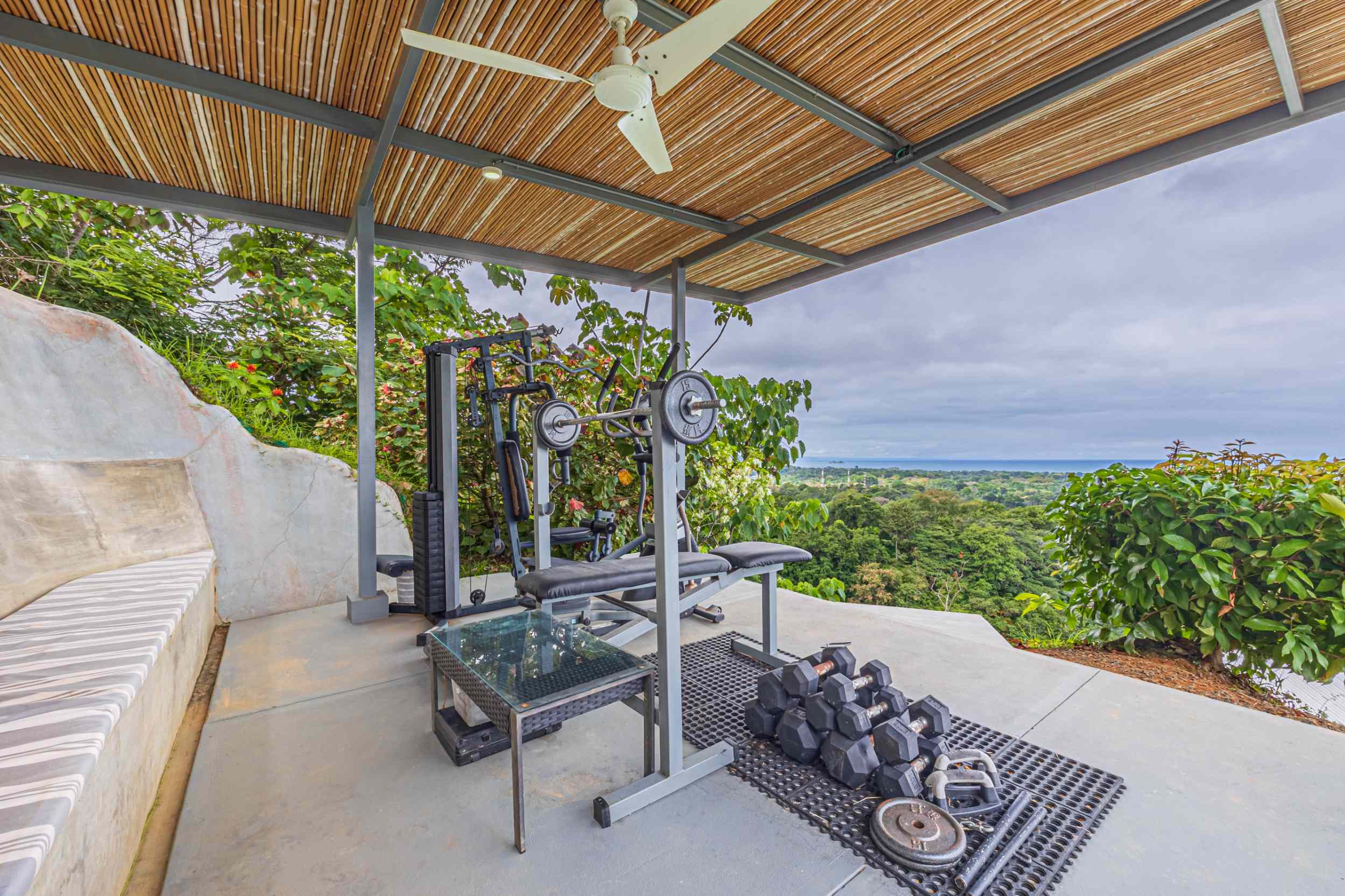 Beyond the main home and the charming guest suite, a covered gym pavilion sits at the highest point of the property. From here, the views are nothing short of inspirational. It’s a place where the air is crisp and clean, where every breath feels like a gift, and where the commitment to a healthier, more in-tune lifestyle becomes second nature.