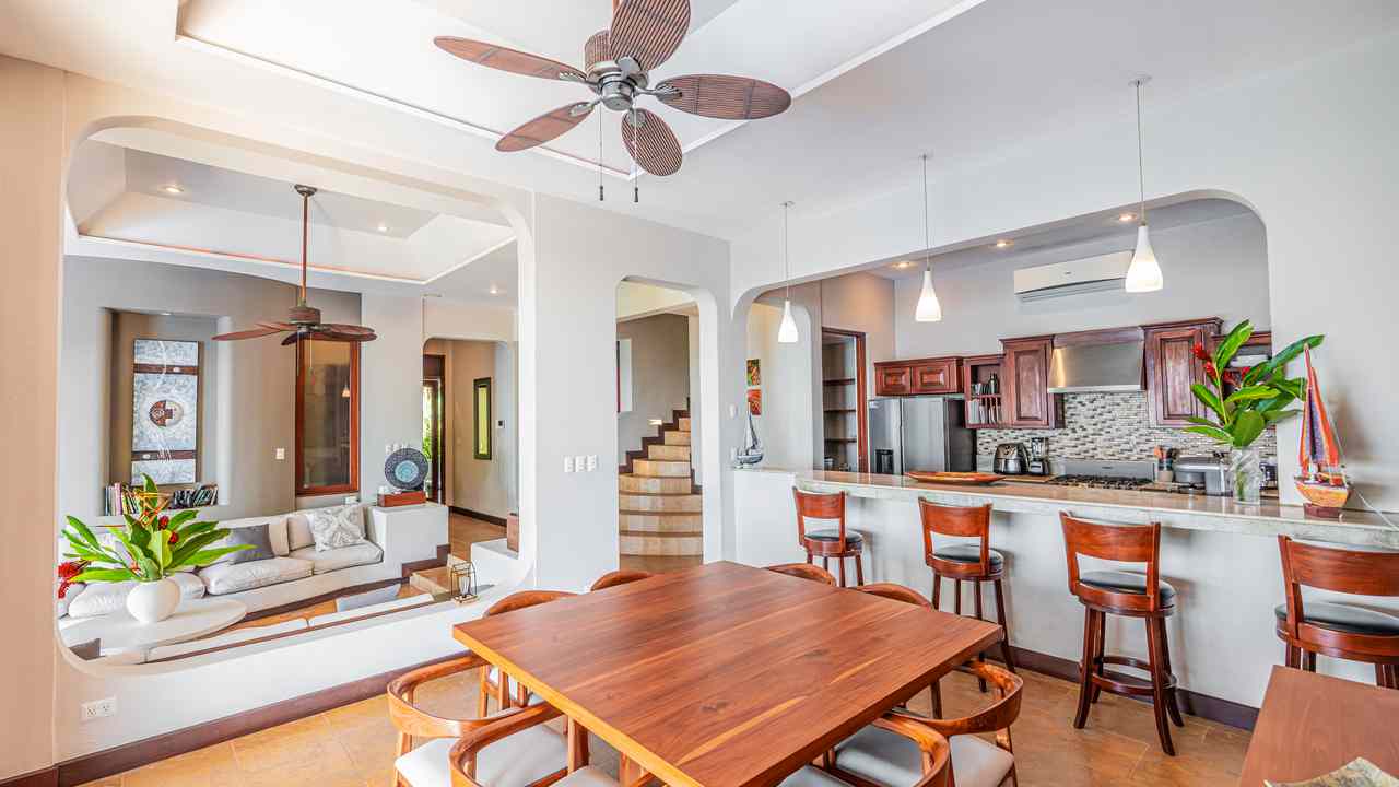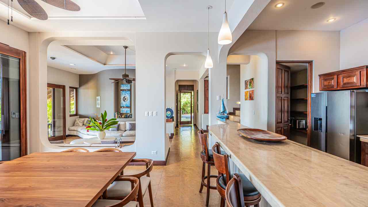 The heart of the home is designed for seamless indoor-outdoor living. The gourmet kitchen and dining area flow directly onto a covered ocean-view terrace, ideal for entertaining or relaxed everyday living. Outside, the property boasts one of the largest swimming pools ever built in the area, surrounded by elegant Corallina stone decking—a striking focal point that perfectly complements the home’s tropical setting.