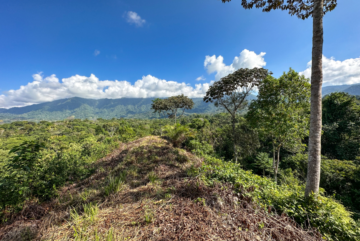 A public road follows the hillside and enters the property near the start of a long, flat ridge. The ridge extends towards the coastal mountains and towers above the surrounding flatlands of Ojochal – you are above the highest canopies of the massive trees that dot the area in front of the property.