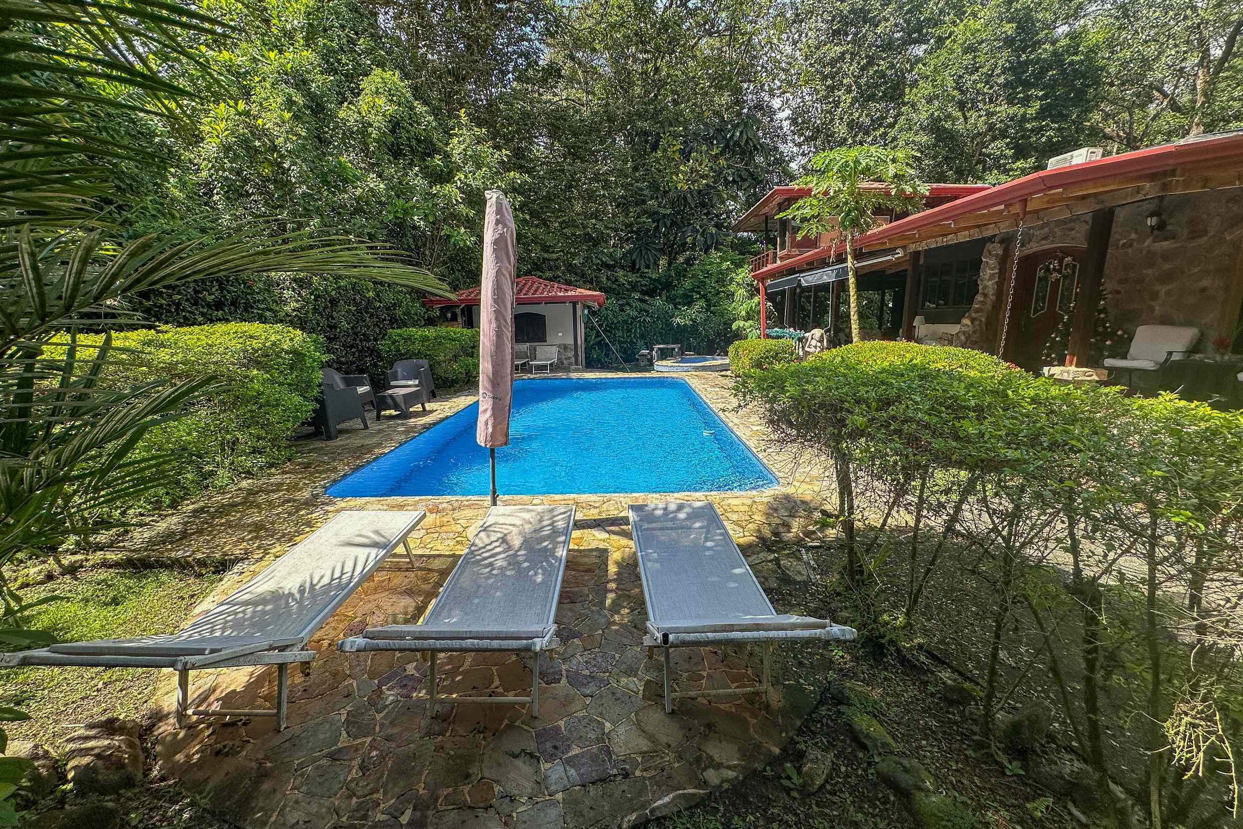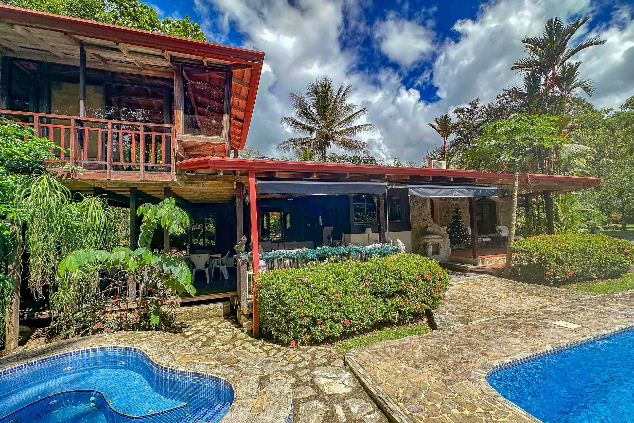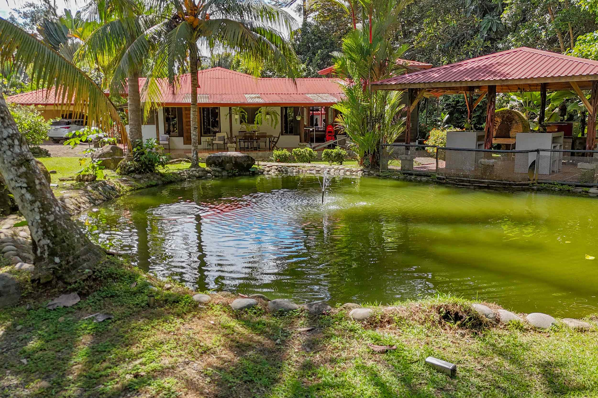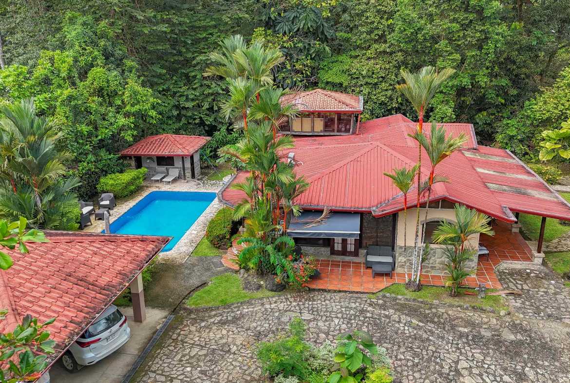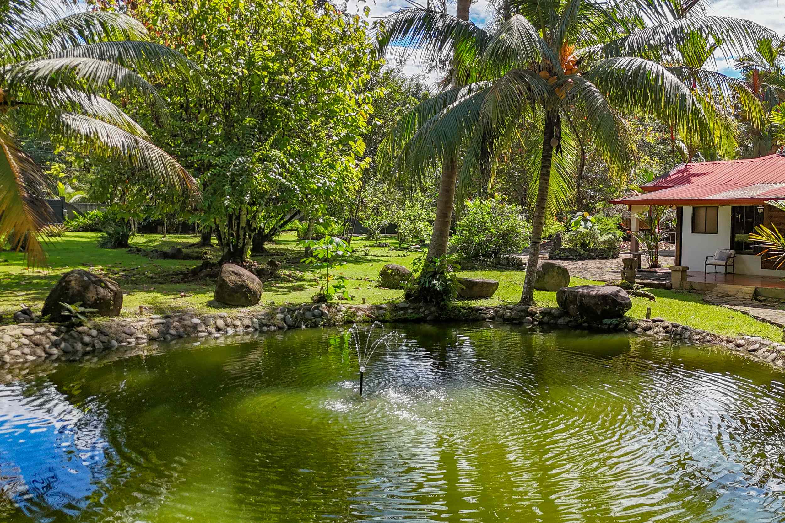 A riverfront 3-bed home on a large property with swimming pool, jacuzzi, carport and bodega, huge manicured lawn & tilapia pond but right inside the Cosmopolitan town of Ojochal!