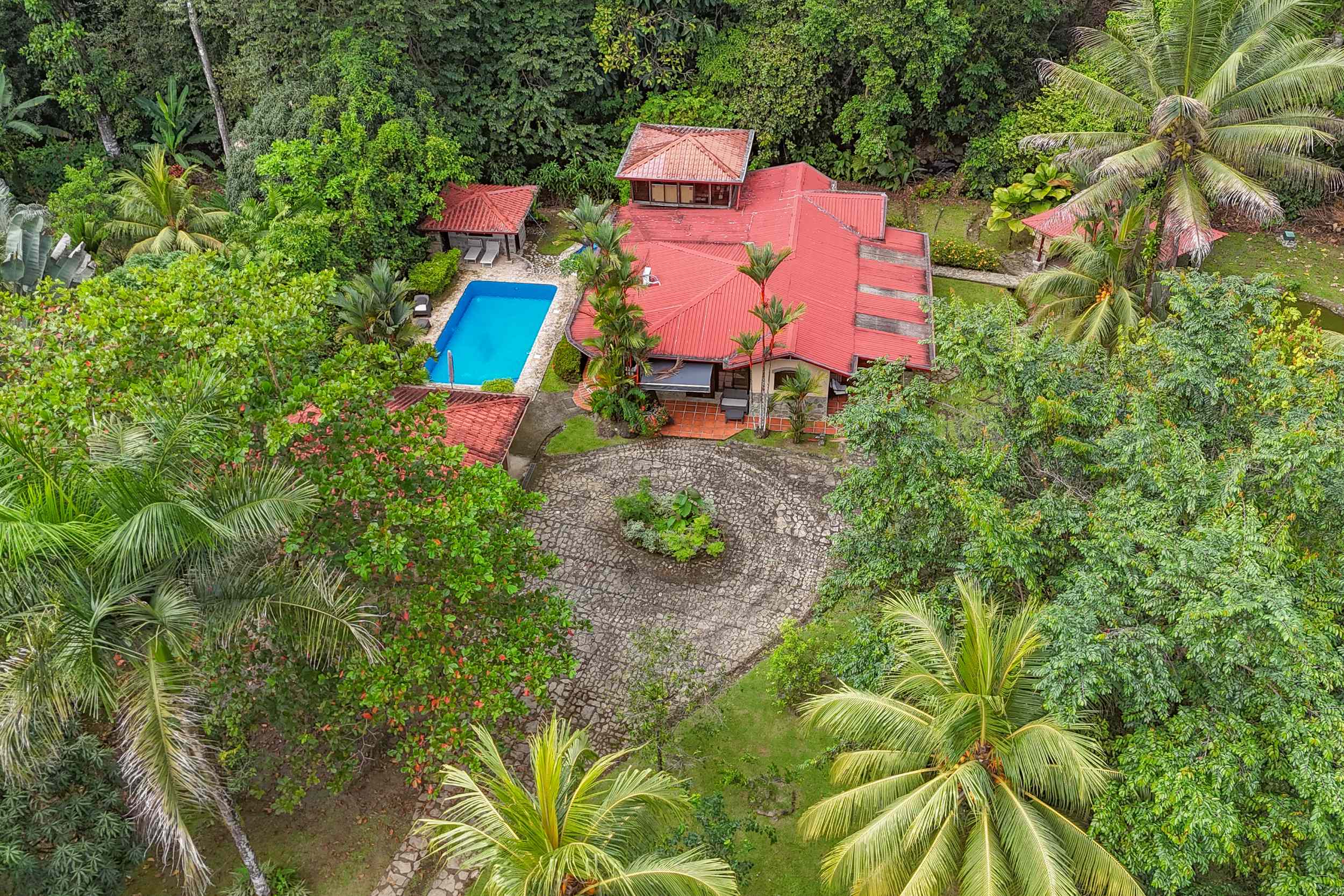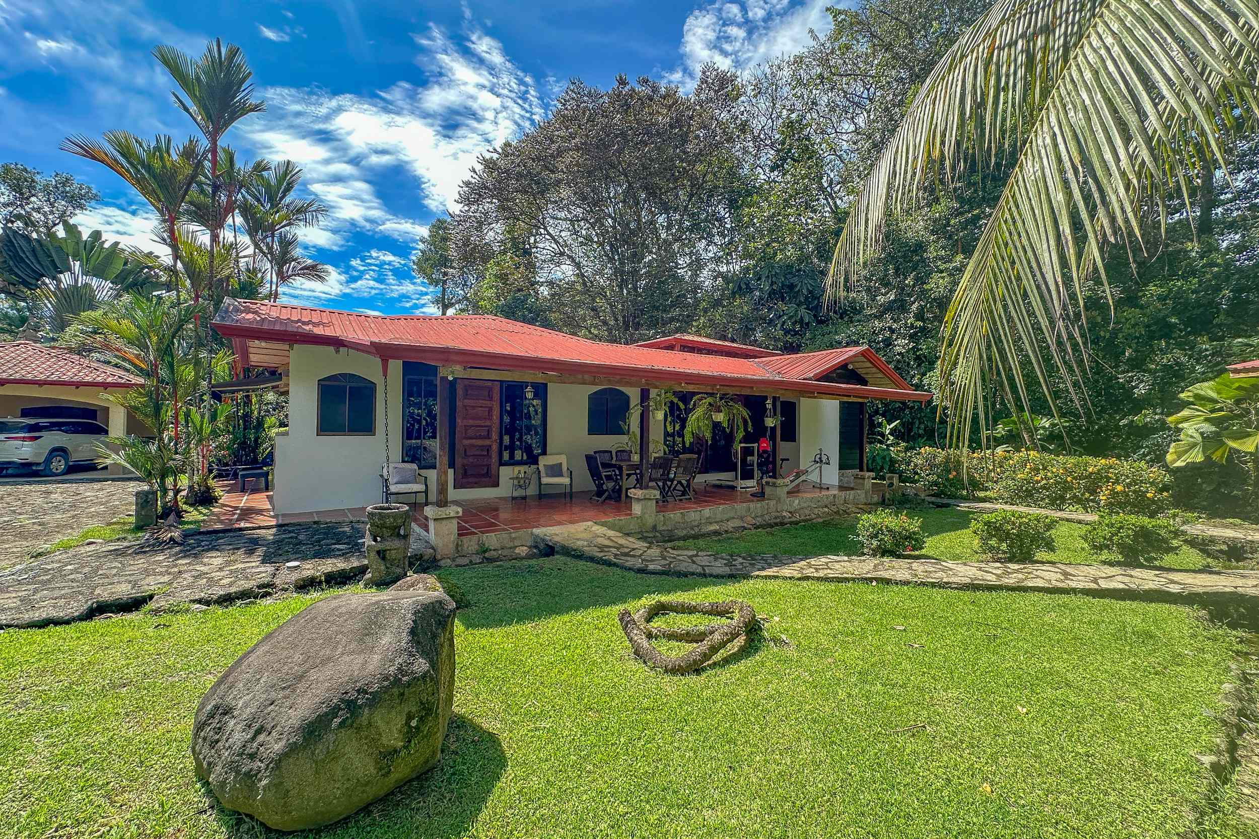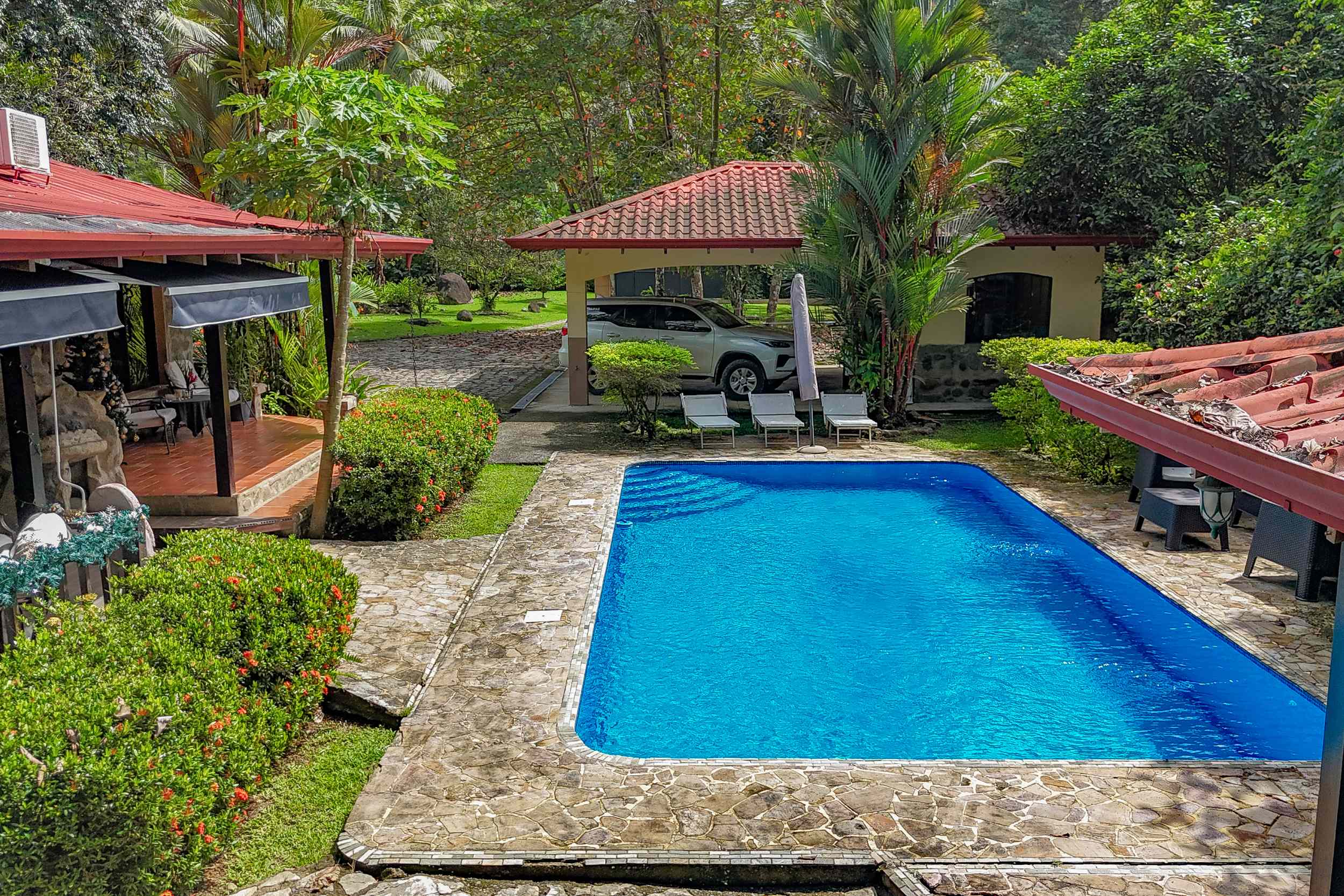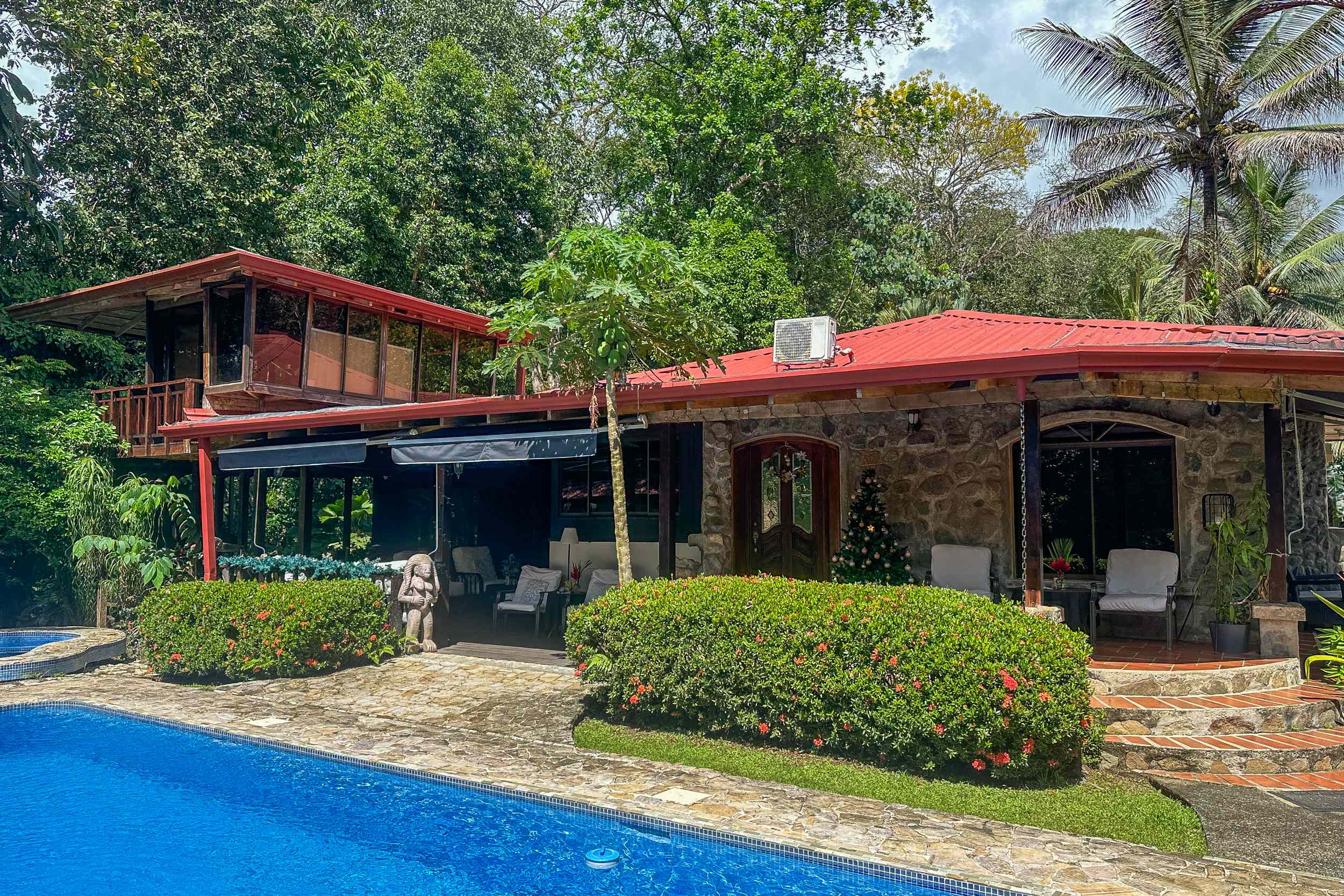 A riverfront 3-bed home on a large property with swimming pool, jacuzzi, carport and bodega, huge manicured lawn & tilapia pond but right inside the Cosmopolitan town of Ojochal!