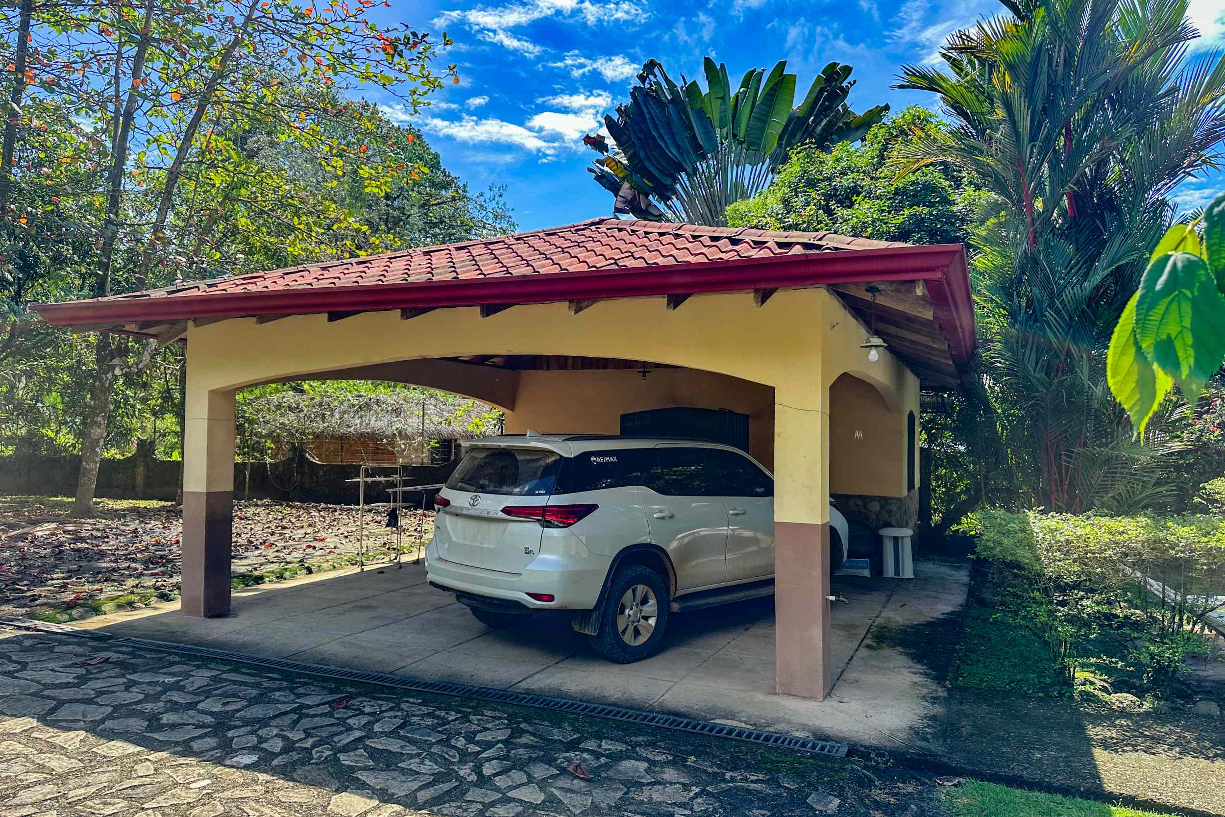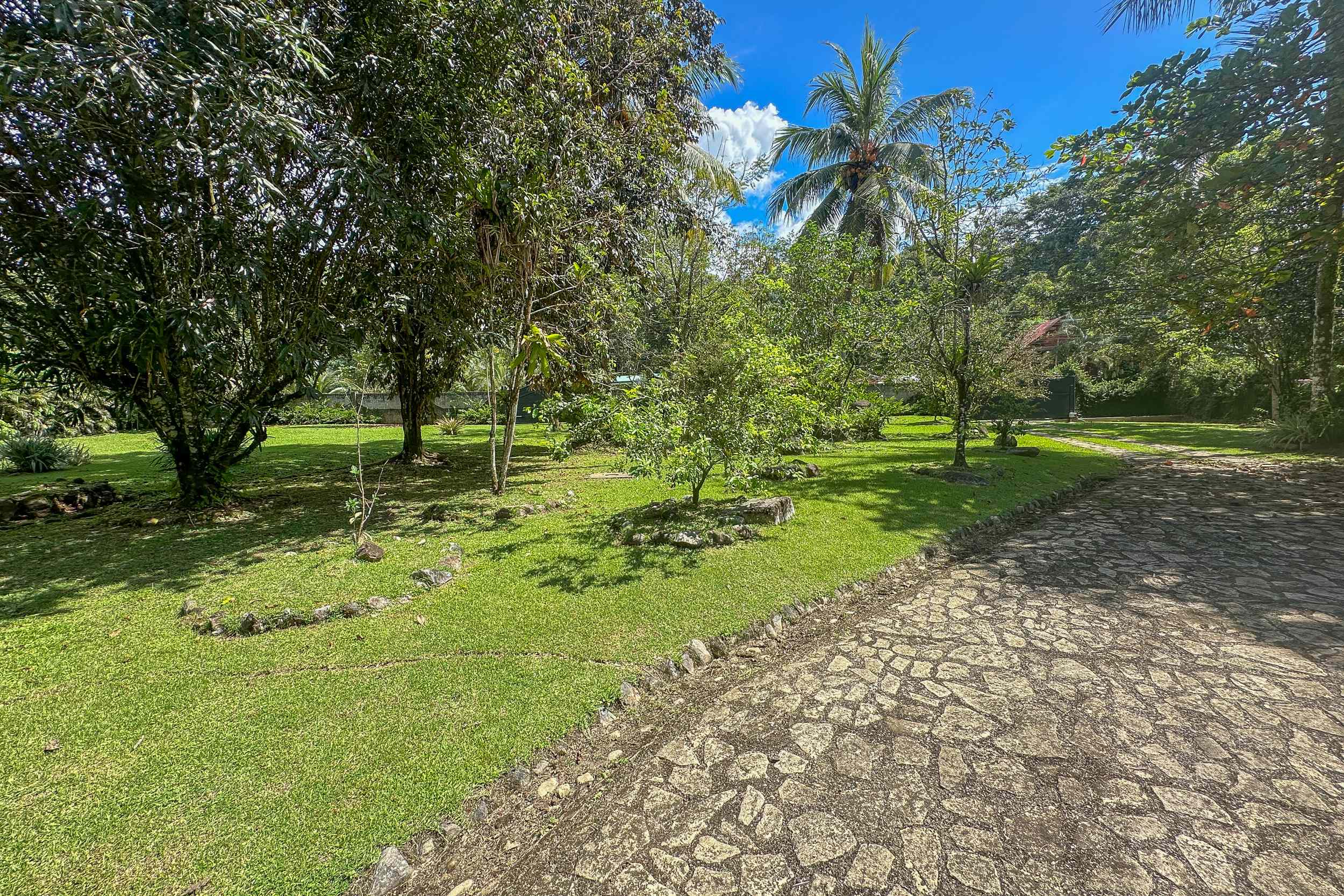 A secure gate opens to a massive green area lined by manicured lawns, trees and palms. The fairy-tale paving-stone ribbon path leads to the carport and a circular driveway which can double as an additional parking area. The multi-vehicle carport also includes a large laundry and storage room.