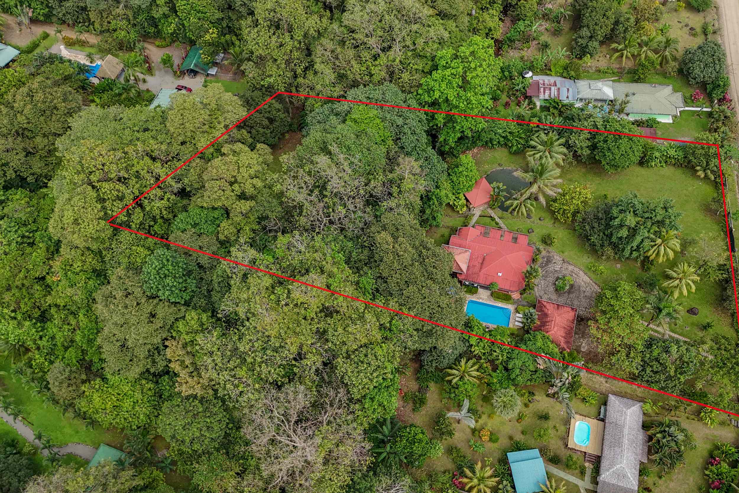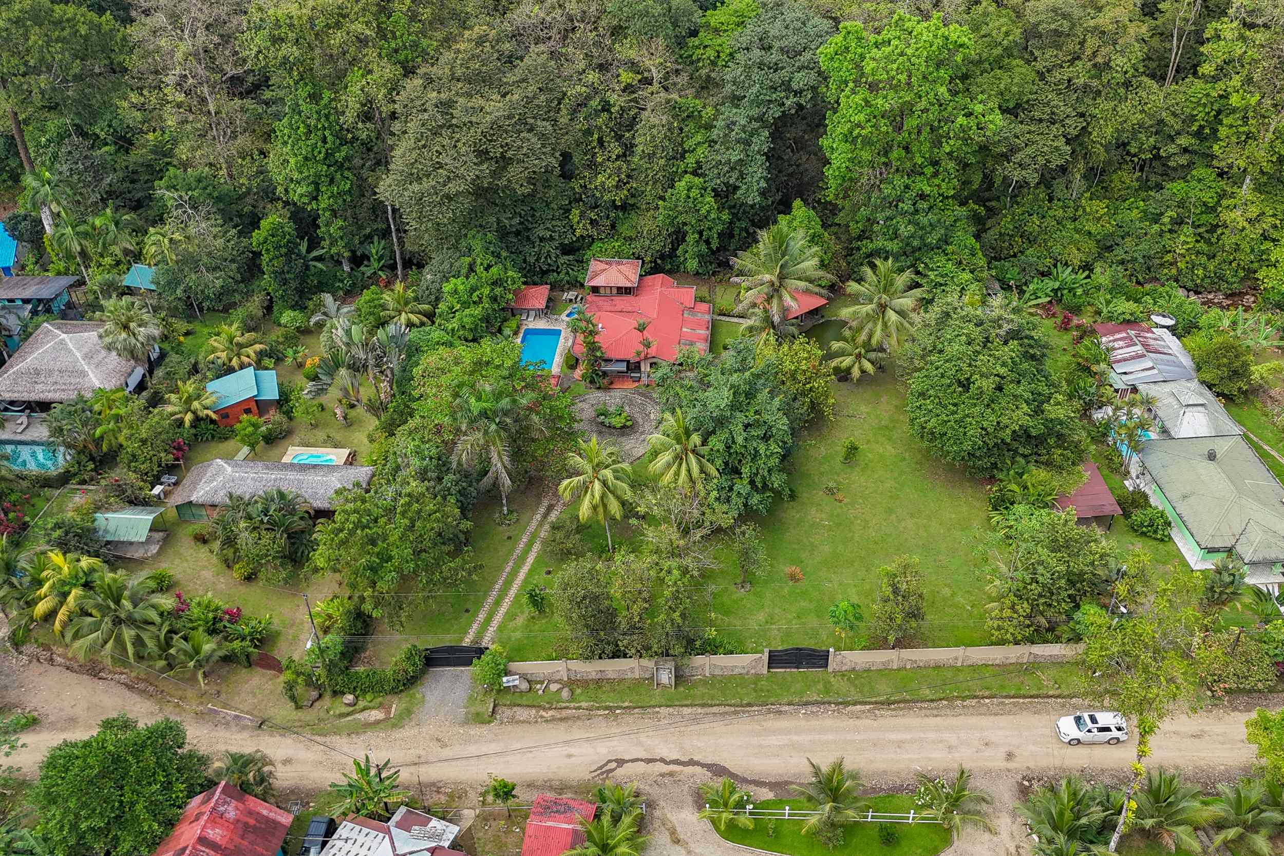 The beautiful natural surrounds double as privacy guardians. The jungle river, at the back, retreats into towering rainforest canopies that provide an impermeable natural buffer. To the left and right, tropical shrubs and trees insulate you from your neighbors while up front, facing the street, a tall fence blocks both views & noise.