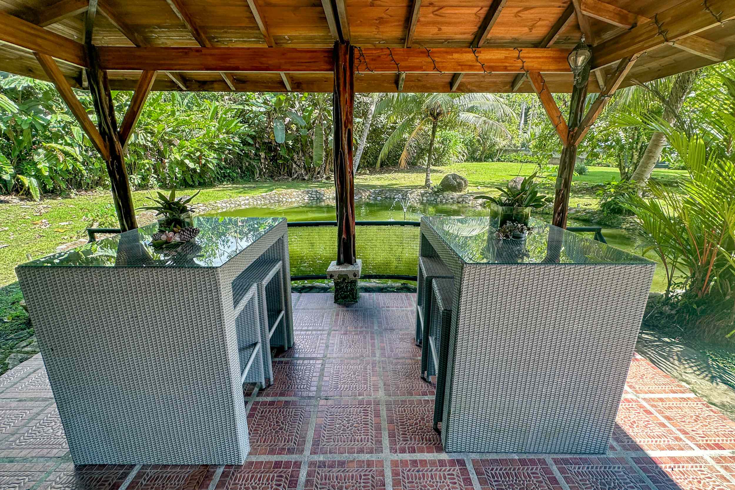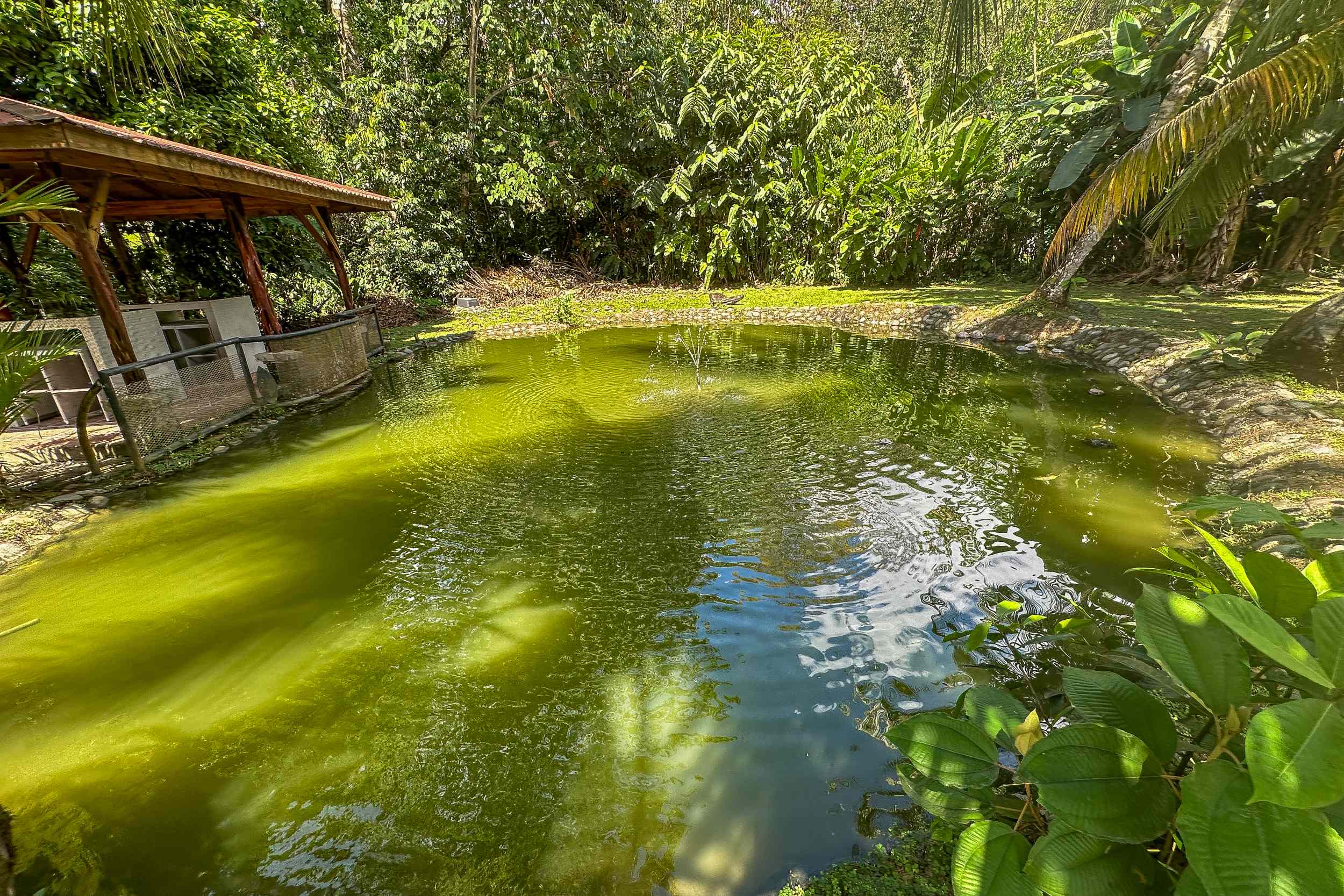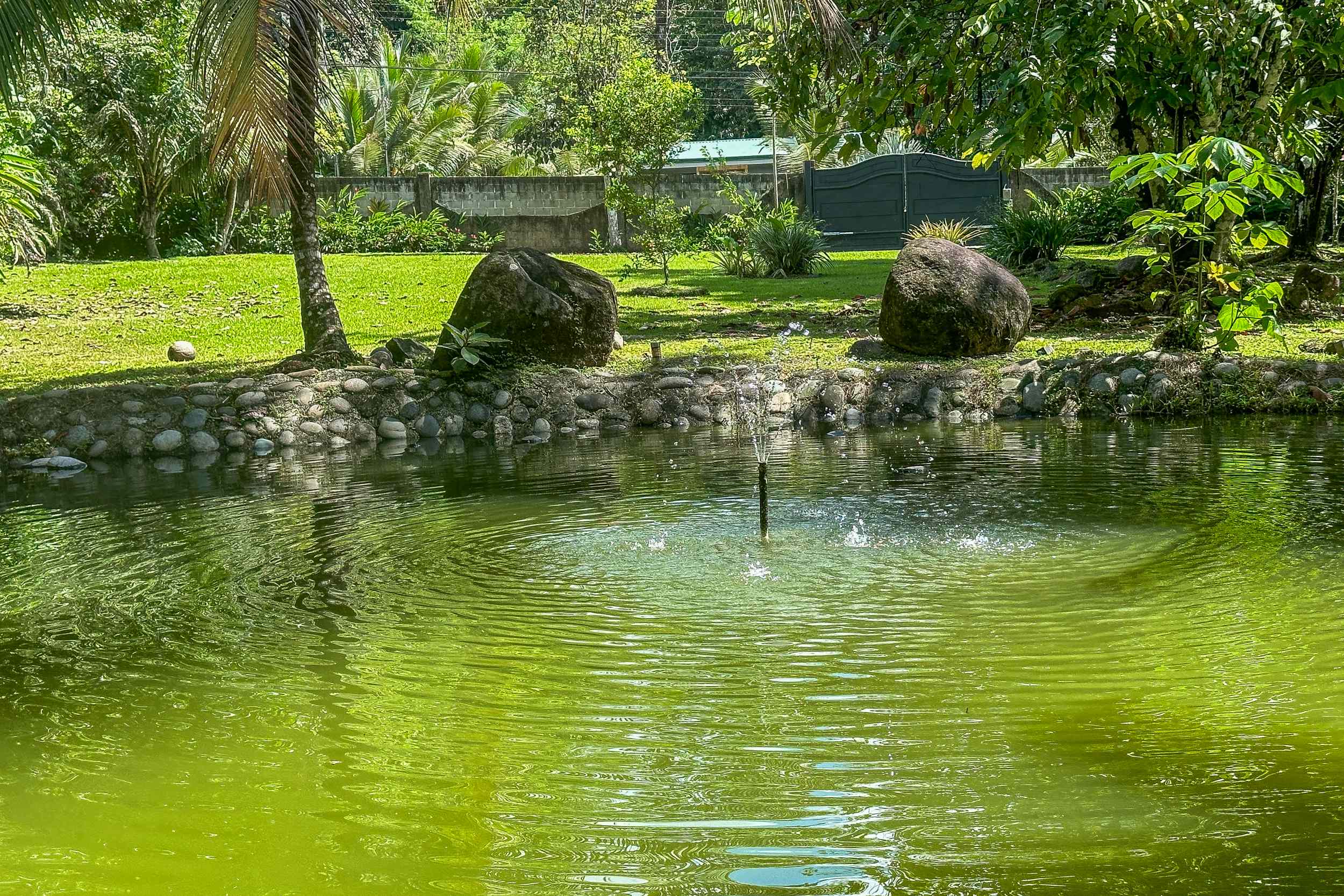 The tilapia pond lays adjacent to the bodega. In fact you can sit comfortably under the cover of the beautiful bodega roof while fishing for dinner! The pond Is lined with river rocks and includes a fountain aerator designed to keep your fish healthy & happy.