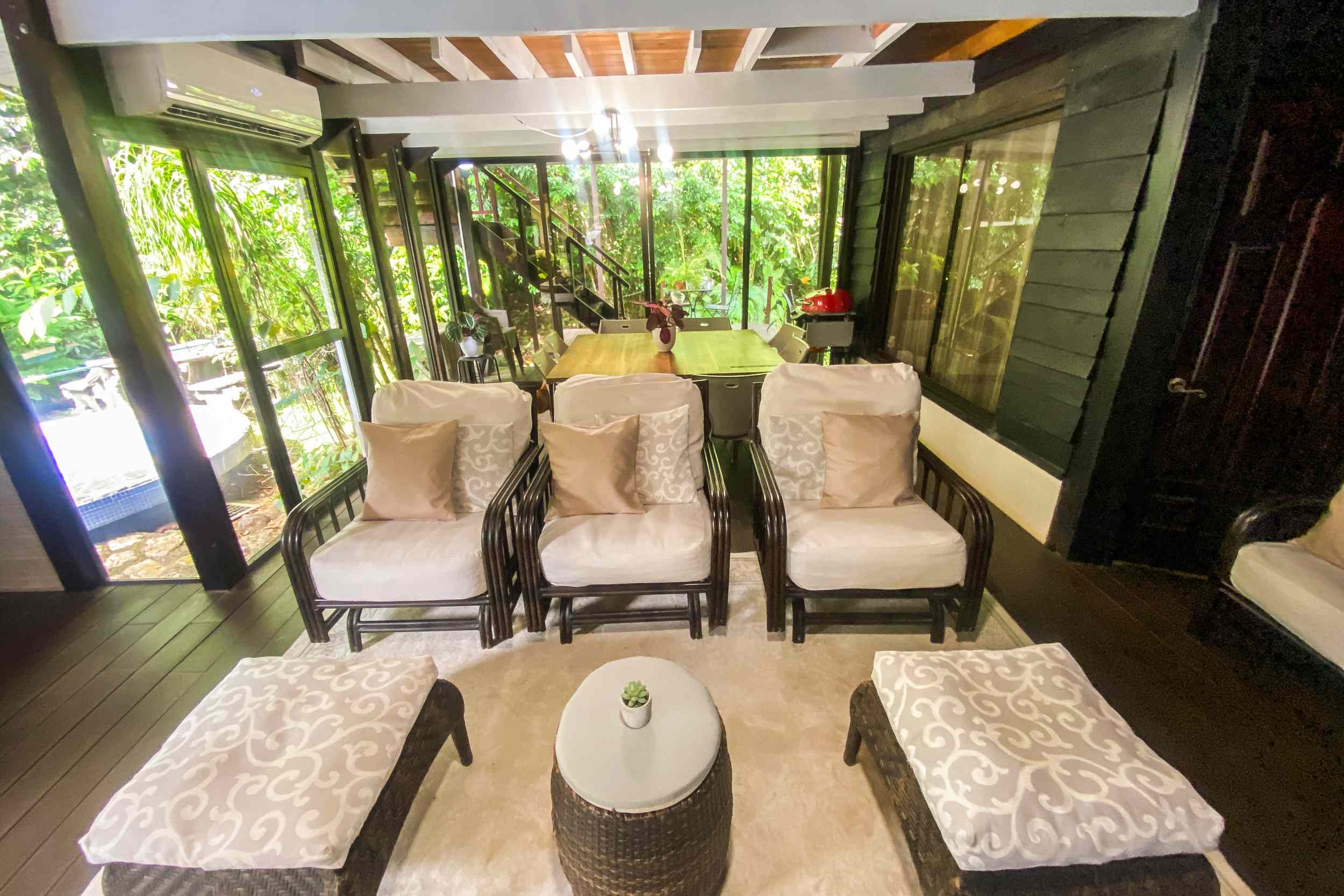 Outside, a huge poolside covered patio holds a BBQ, 10-seat table, numerous coffee tables with lounges and chairs, and ample lighting including lamps, reading lights and fairy lights. The beautiful timber roof and rafters along with mixed timber and tile flooring create a cozy, warm atmosphere. Opposite, an open-air poolside lounge area with a coffee table and seating takes full advantage of the green surroundings and midday sun. The covered patio / verandah surrounds the home on three sides – such an extensive outdoor living space will ensure that your connection to the encroaching nature & beauty is renewed every single day.