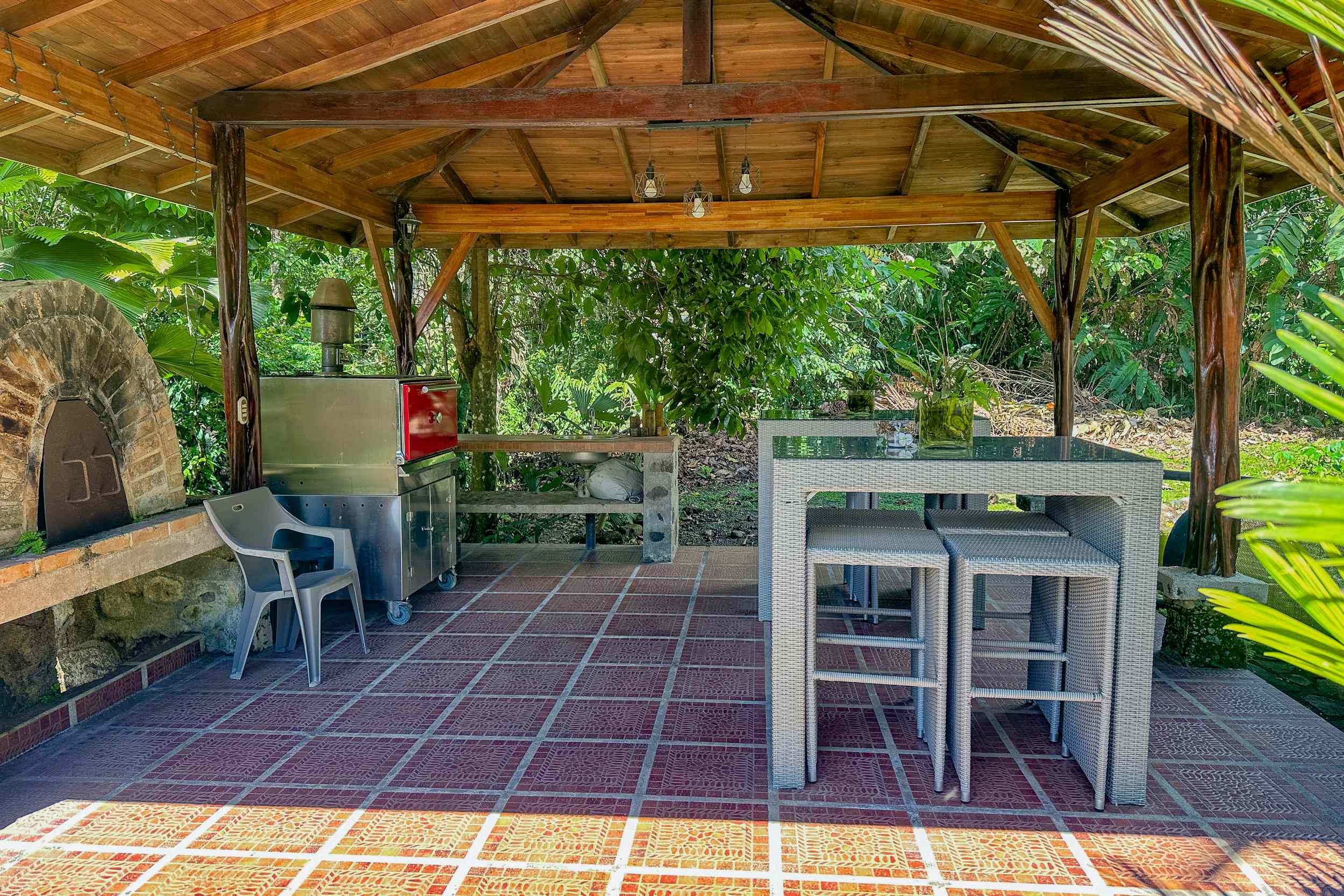 The bodega, sitting along the tilapia pond, is a beautifully crafted artistic timber structure with tiled flooring and numerous electrical power points. It holds a wood fired pizza oven, a BBQ / Smoker, bench area, electrical lighting and two tables with seating for 8.