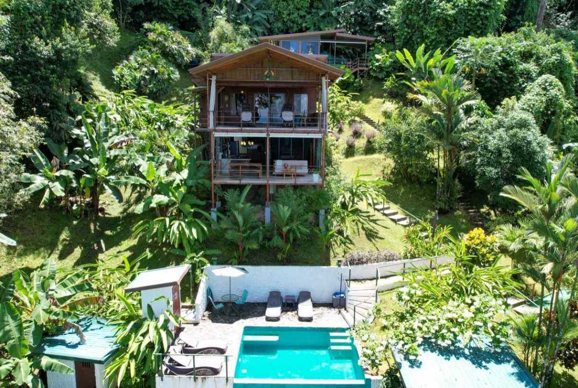 Perched at the top of the gated community, this tranquil haven offers an immersive nature experience—wake up to a symphony of birds, spot monkeys, iridescent blue Morpho butterflies, toucans, and even humpback whales during migration season. Unwind in the saltwater infinity pool, relax by the outdoor fire pit, and take in panoramic ocean and sunset views, including the stunning Isla Ballena.