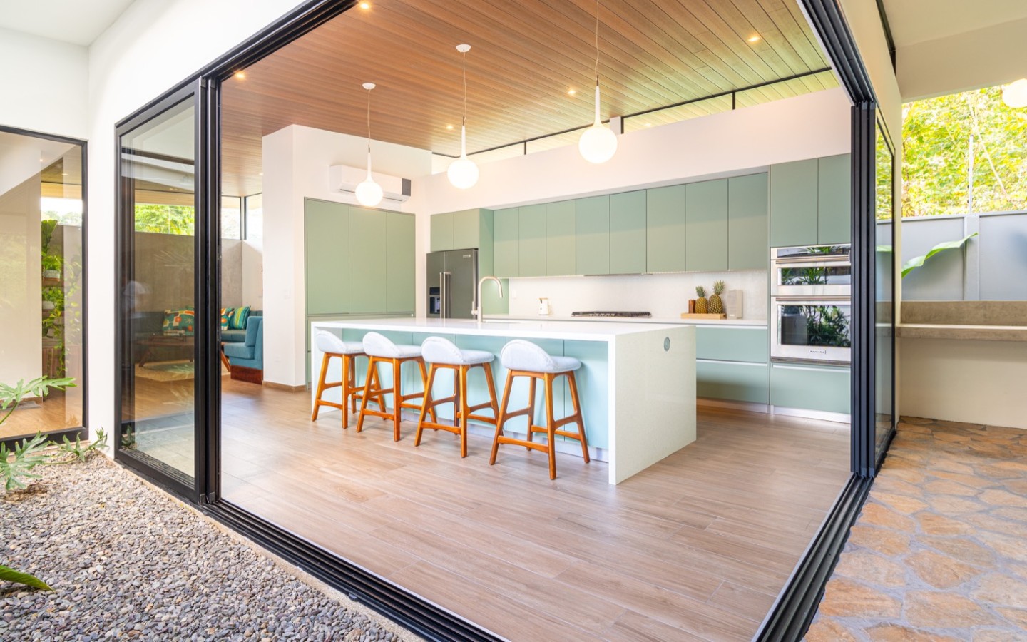 The master suite is a tranquil retreat with its own private en-suite bathroom with outdoor freestanding tub and shower, while the two additional bedrooms are generously sized and share a stylishly appointed full bathroom.