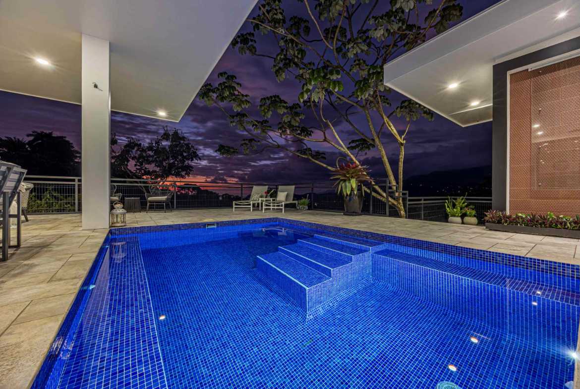 As you enter your covered carport the wrap around deck shields you from the elements and also allows you to take in the flora and fauna that Costa Rica promises. The large entry way showcases the elements from outside to within, as the large lipstick palm encasement greets your guests with a special touch. Stone walls add the richness of texture so the warmth of the home invites into the luxury that awaits. An open concept floor plan with indoor outdoor flow has been curated to deliver a living experience that will be the envy of all. Step out through the sliding doors to the outdoor patio, where a sparkling turquoise pool seamlessly blends with the endless ocean vista or simply enjoy the water feature wall as the sounds of trickling water relax your soul. This indoor-outdoor oasis invites you to relax under the tropical sun against the backdrop of a lush rainforest. A stunning chef’s kitchen with double fridge and large island will suit any large gathering. Plenty of storage space abounds. A walk in pantry and laundry facilities complete the package for ease of life.