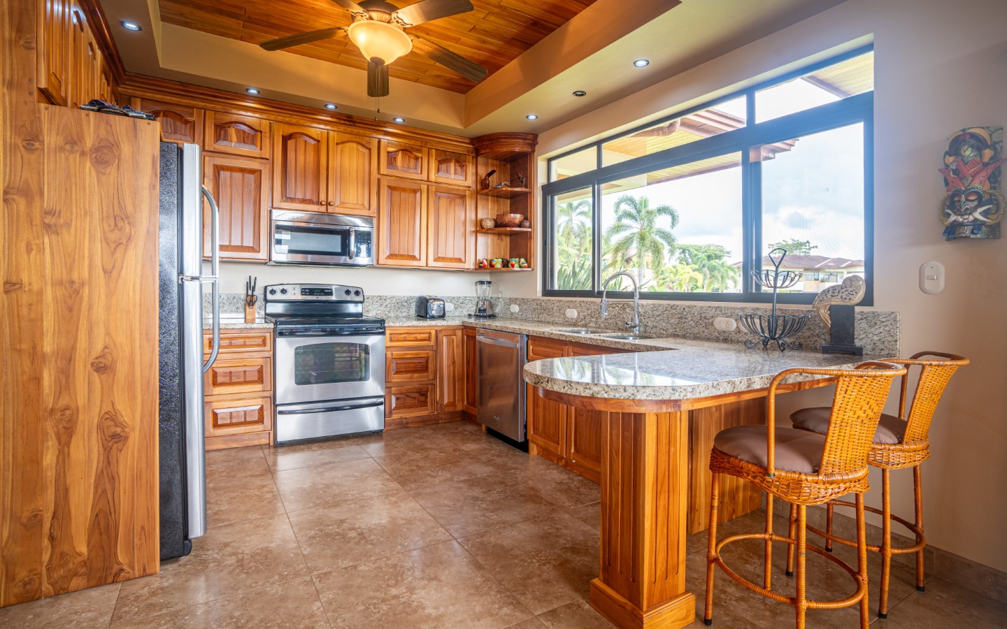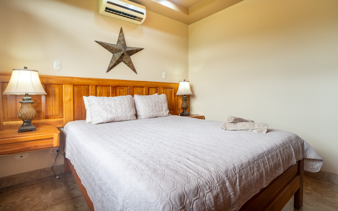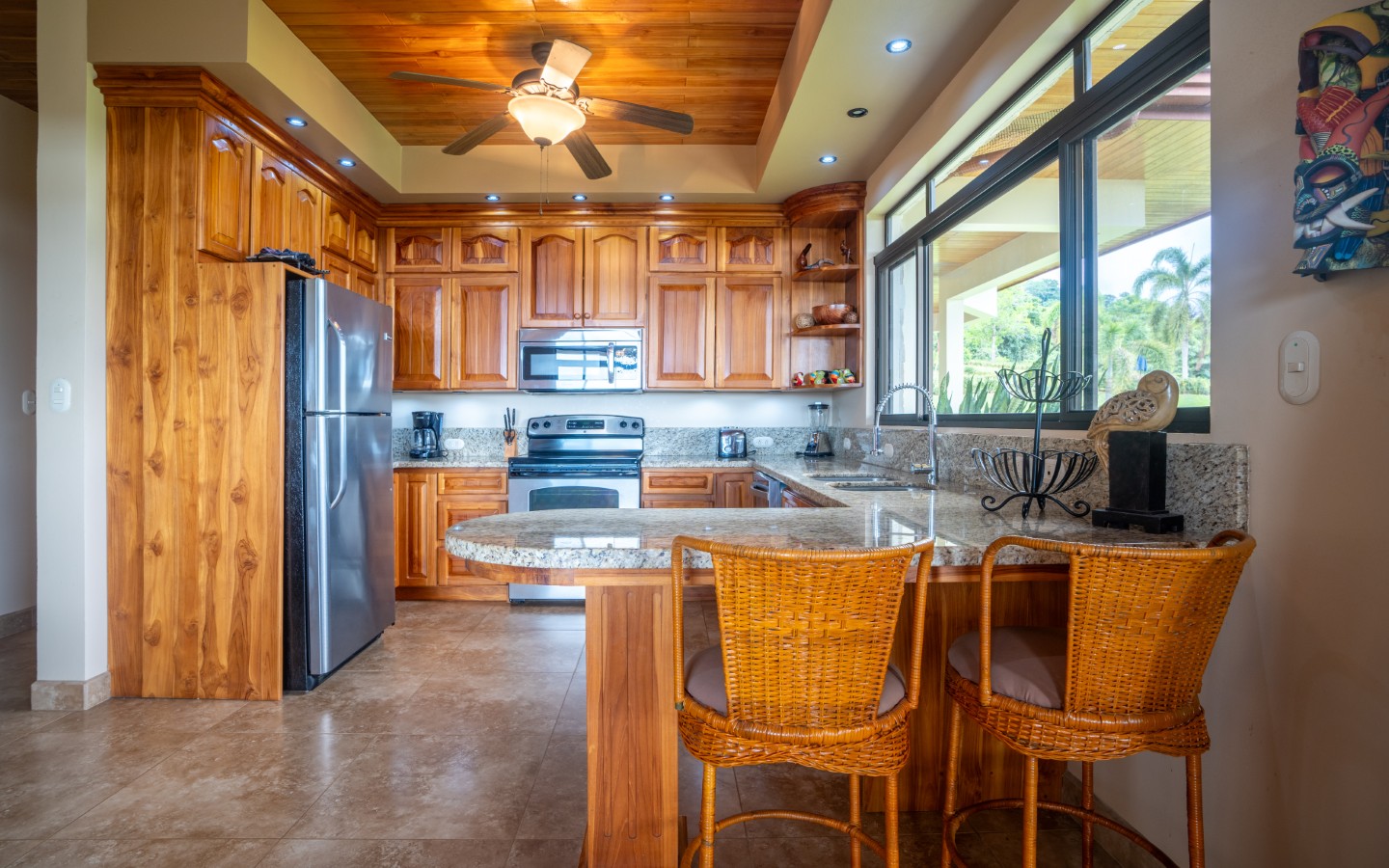 Located in the quiet gated community of San Buenas at a 700 ft elevation, just high enough to enjoy the breezes coming up from the South Pacific and coming down from the San Buenaventura mountains this rare offering is just waiting for you. This Penthouse unit is a gem just steps to the large pool and deck with washroom and changeroom. A covered private patio with breath taking Ocean and Sunset views to watch the clouds roll down the mountains of San Buenas. The jungle sounds of Toucans and other exotic birds are daily while the howler’s serenade and you enjoy the occasional visit from a troupe of spider monkeys. And…no 4×4 needed, just 5 minutes up the hill to complete bliss.