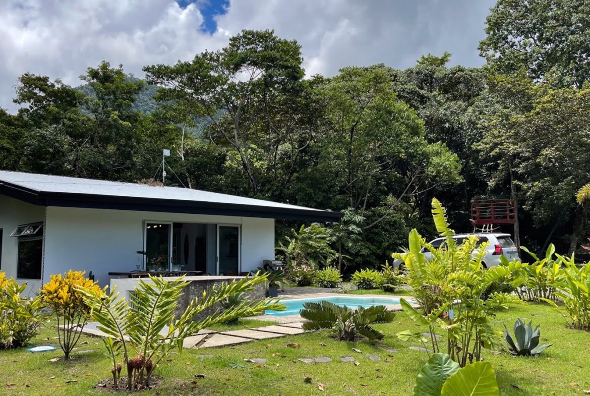 This is a nature oasis, hidden in the rainforest, located on a secluded plateau, the villa features breathtaking views of the lush jungle, and a peek at the Pacific ocean. The floor-to-ceiling panoramic glass doors and balcony looks out into the dense rainforest which contains mature trees up to 15-20m. This is truly a place to experience life in ways that heal body and soul, that awaken the senses and inspires new meaning. Rushing water, bird’s songs, and the sounds of the forest team up with the jungle’s natural colors and aromas creating an unforgettable sensory experience. Building materials have been carefully chosen to create a warm and quiet haven, with an abundance of natural light. The furniture and decor incorporate natural and organic elements; wood, rocks, glass, shells. The sustainable eco-friendly feel is enhanced by soft wood detailing, a natural color scheme and local materials attune the house to its magical surroundings. The property is bordered by a river with a waterfall, you could clear a path through the jungle to enjoy this feature frequently! With two acres of rainforest, this is a breathing and living place. There are several fruit trees already producing and several pineapple plants for immediate harvest.
